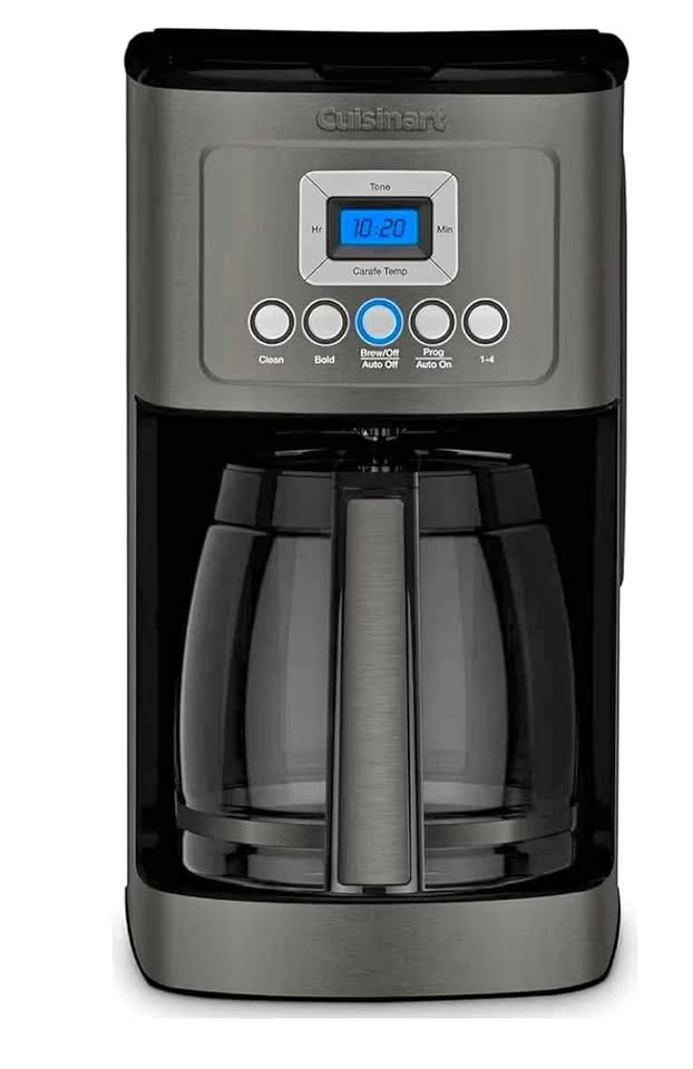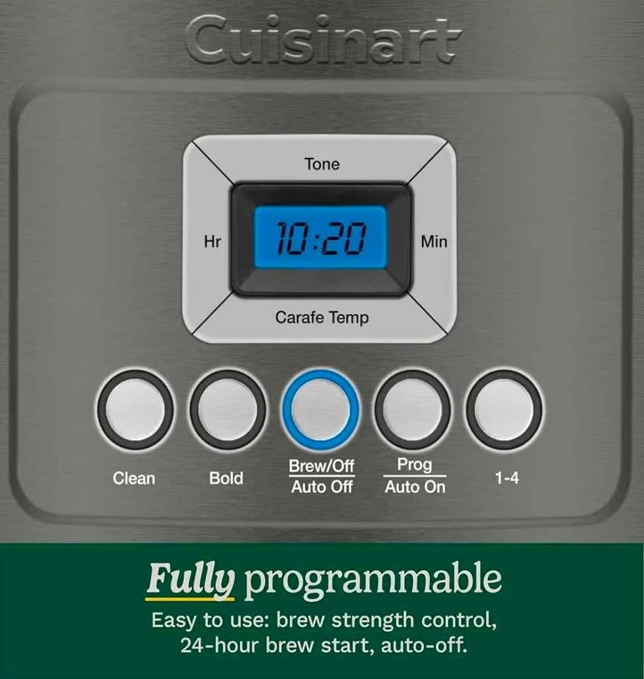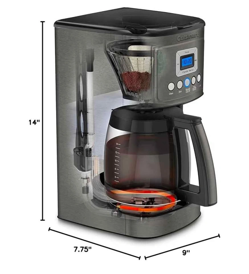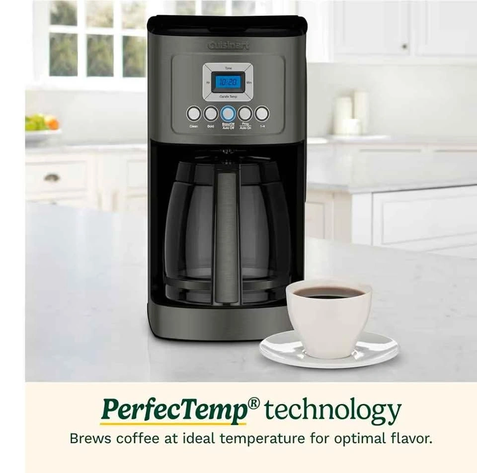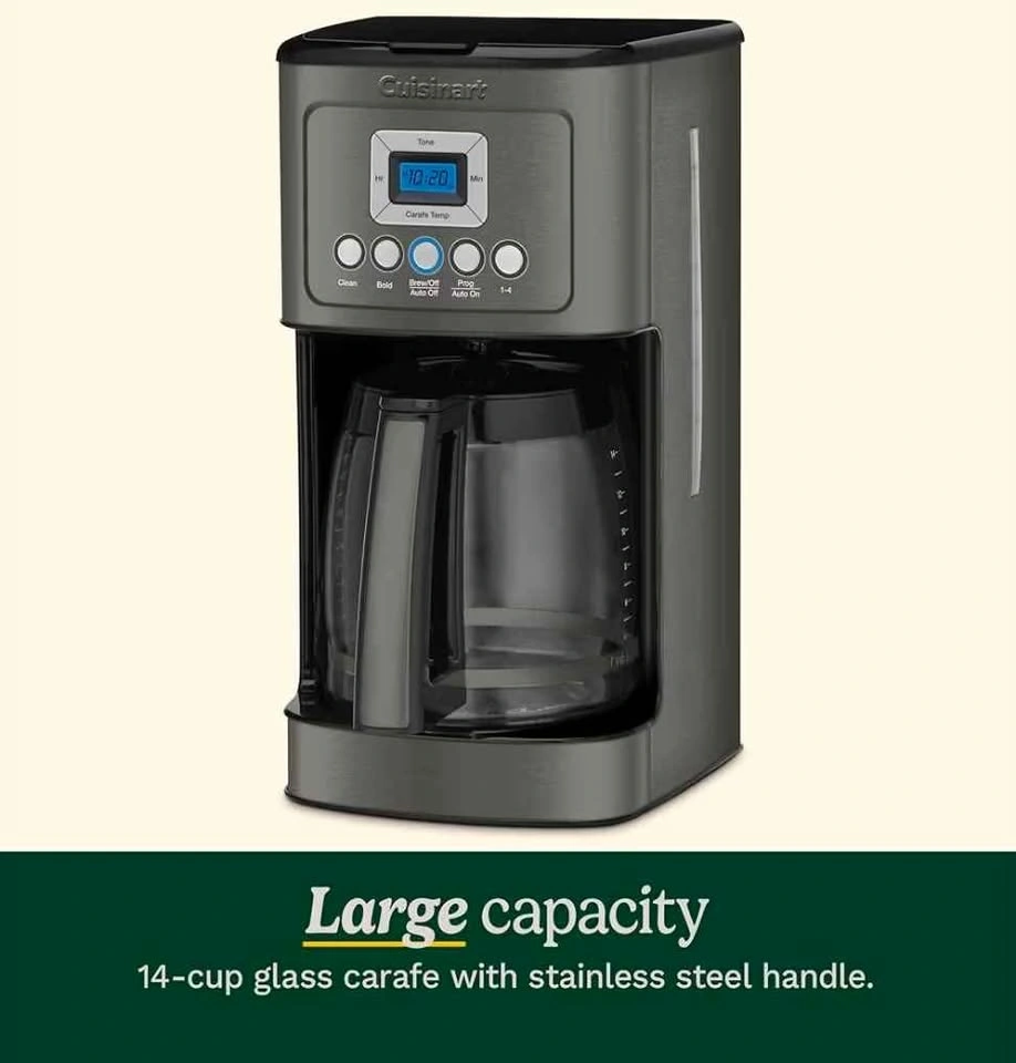 Brand new in the box! Never used! Brand: Cuisinart Color: Black/Stainless Capacity: 14 Cups Product Dimensions: 7.75"D x 9"W x 14"H Special Feature: Auto Clean Function, Auto Shut-Off, Programmable Coffee Maker Type: Espresso Machine ADJUSTABLE CARAFE TEMP: Our Cuisinart 14-Cup* Coffee Maker with adjustable carafe temp feature adjusts the warming plate temperature to Low, Medium, or High to keep freshly brewed coffee at the temperature you prefer. BREW STRENGTH CONTROL: This coffee maker customizes your brew to perfection with regular or bold settings, catering to your unique taste preferences every time. FULLY AUTOMATIC COFFEE MAKER: The coffee machine offers convenience with 24-hour programmability, 1-4 cup settings, auto-off (0-4 hours), and an optional ready alert tone. 14-CUP* CAPACITY: *Cup equals approx. 5 oz. (varies by brewing technique). FILL WITH EASE: Enjoy precise water filling with the easy-to-view water window, while the Cuisinart coffee maker Brew Pause feature lets you savor a cup before the brewing cycle finishes, enhancing your experience.