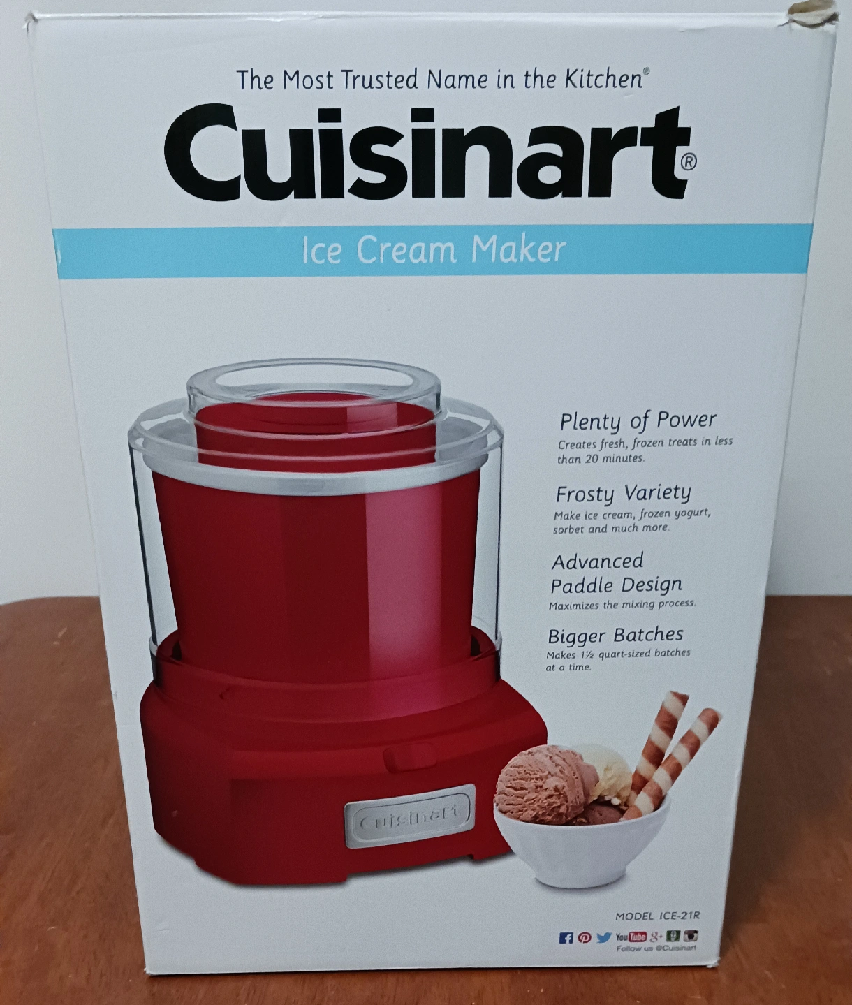 Get ready to make some delicious treats with this Cuisinart Ice Cream Maker! It's the ICE-21R model and comes with an advanced paddle design to maximize the mixing process. You can make bigger batches, up to 1 1/2 quart-sized batches at a time. The box is included! Máquina para hacer helados Cuisinart, excelente estado, en su caja original.