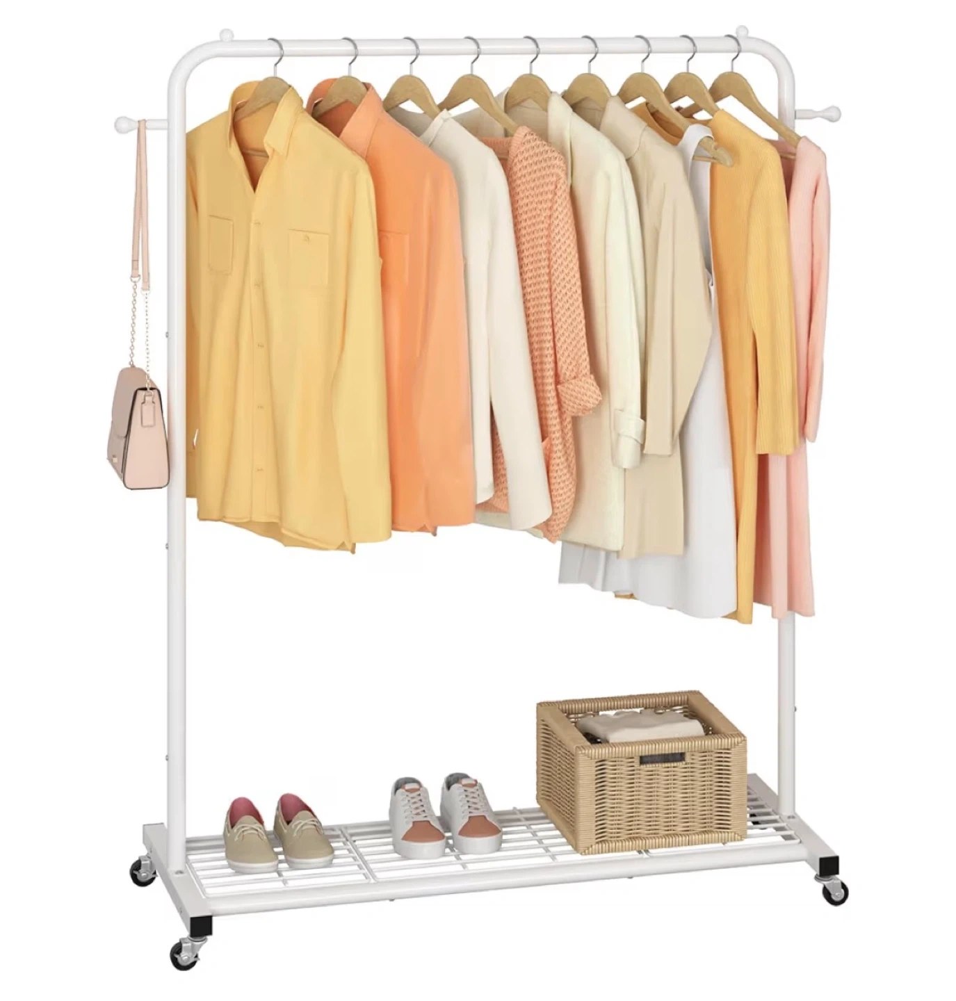 This rolling garment rack features a durable white metal frame and a convenient bottom shelf for extra storage. It's equipped with wheels for easy mobility. Perfect for organizing clothes, shoes, and accessories.