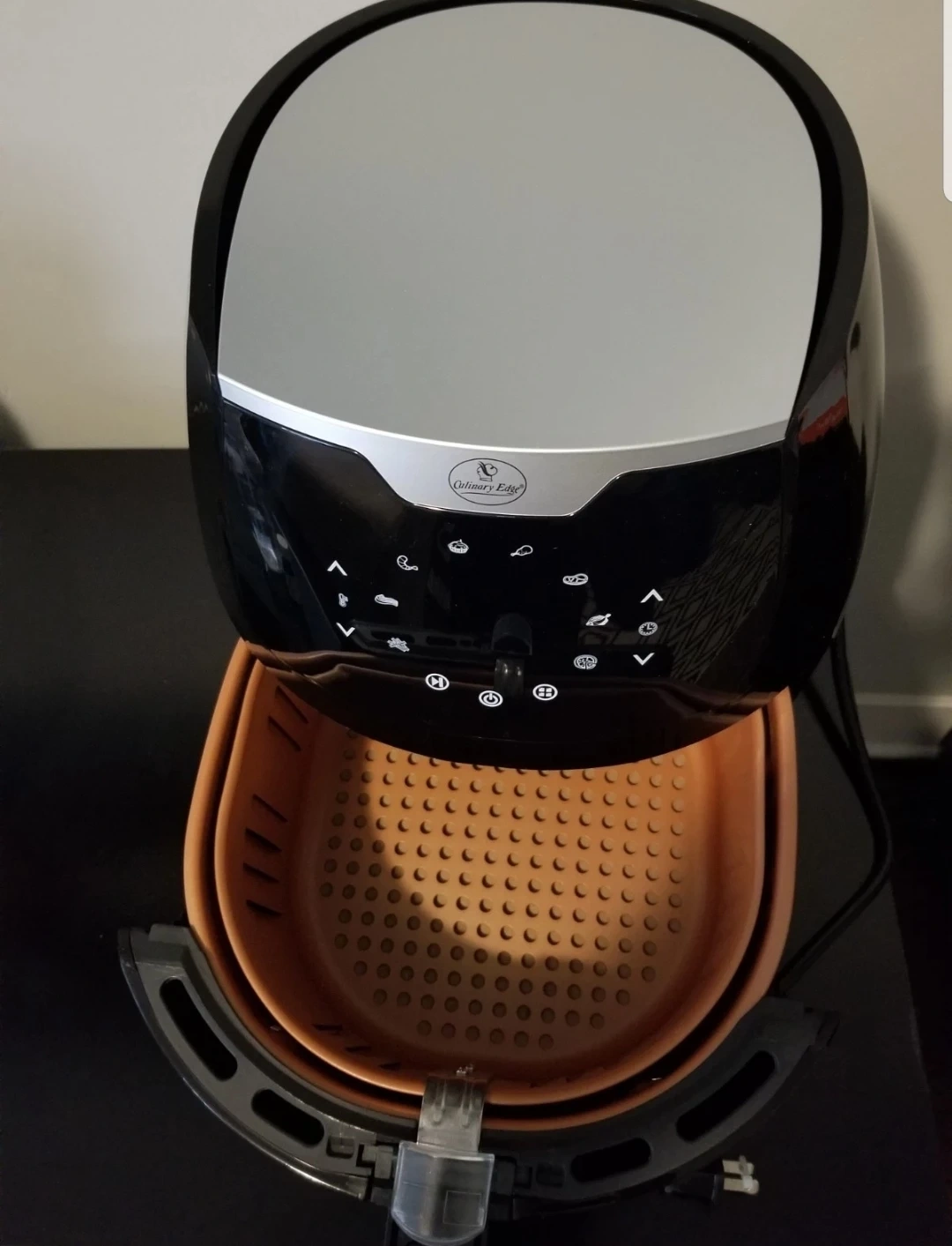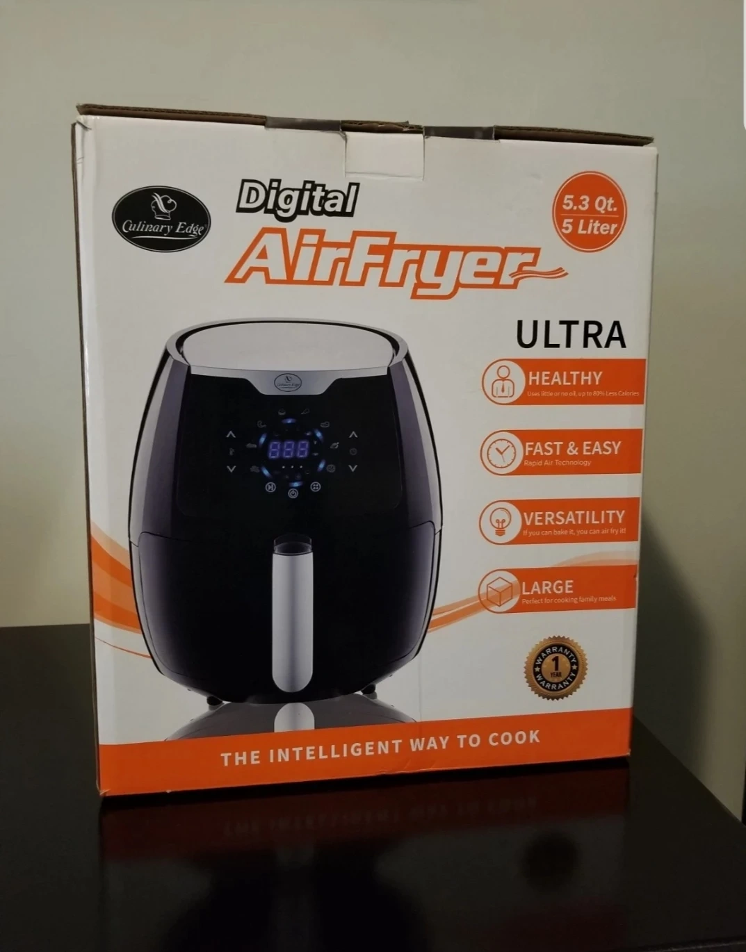 60Selling a BRAND NEW Culinary Edge Digital Air Fryer! It's a 5.3 Qt (5 Liter) model. The box highlights its healthy, fast, and versatile cooking capabilities. It's also large, perfect for family needs. Get ready to cook the intelligent way!