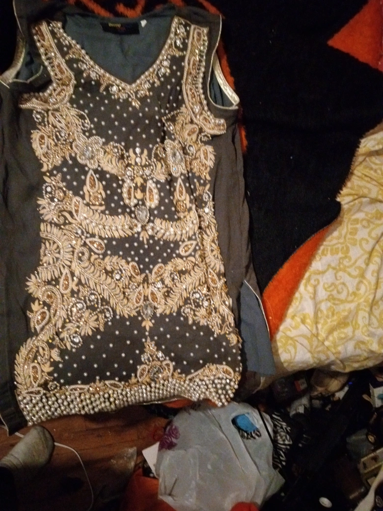 this is a small Pakistan dress dark type of gray with a lot of nice sequins into it nice to wear out I'm not sure about Pakistan clothes but this is in mint condition I'm asking for 12 DVDs of horror