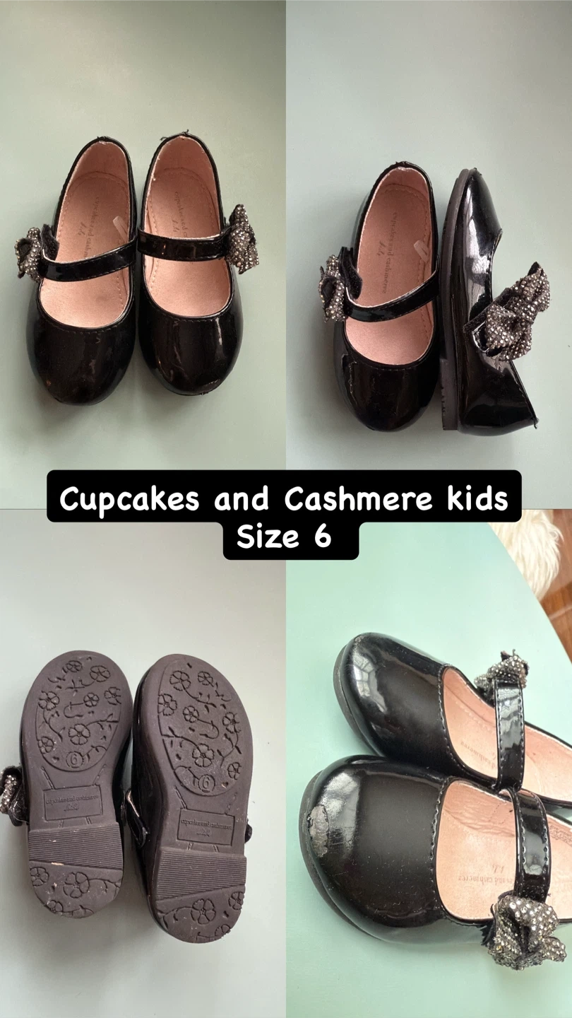 Fabulous black patent Mary Jane shoes from Cupcakes & Cashmere Kids! They're a size 6 and feature a sparkly bow detail with Velcro closure. Please see photos for condition; there are some signs of wear on the toes.
