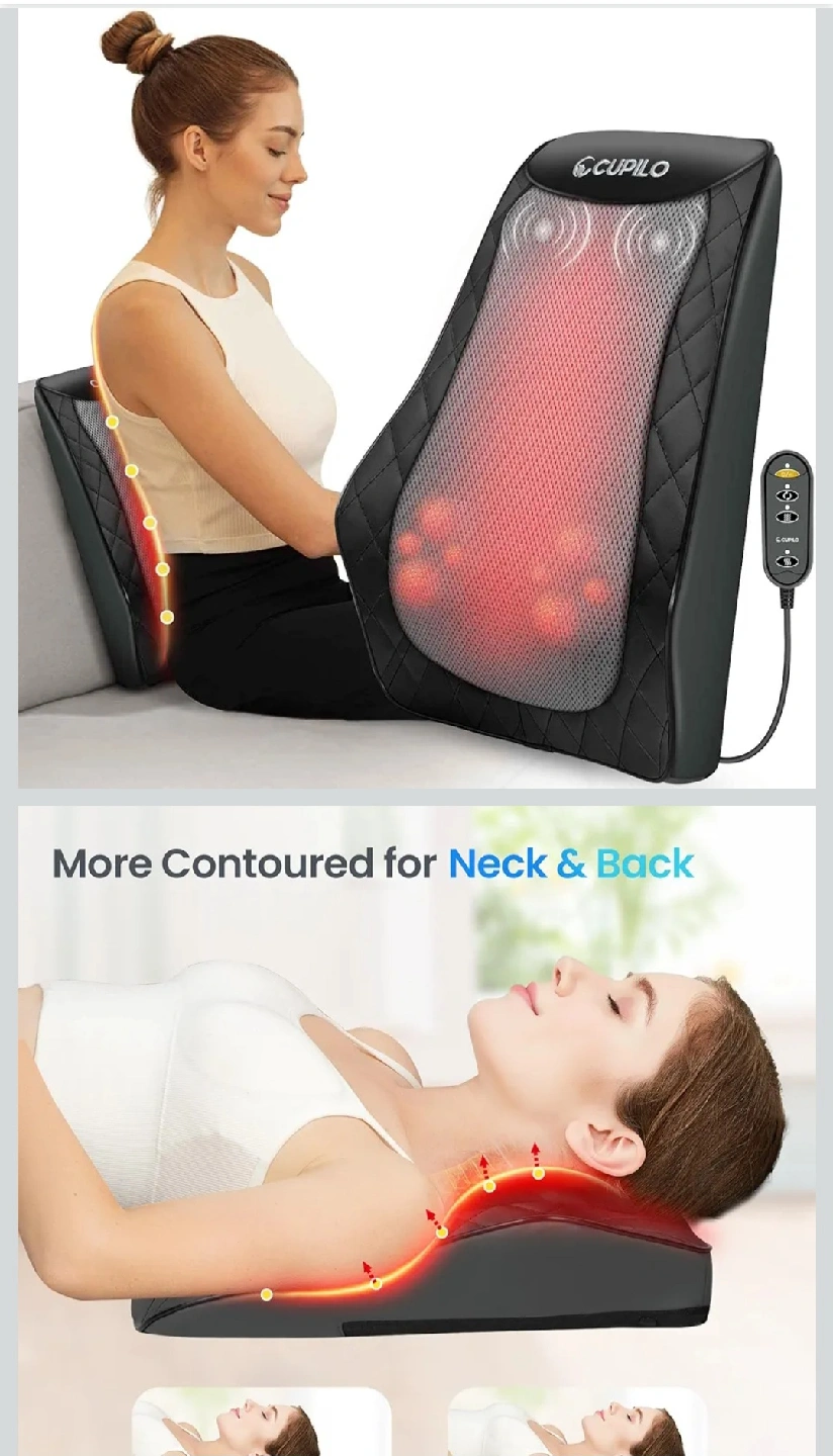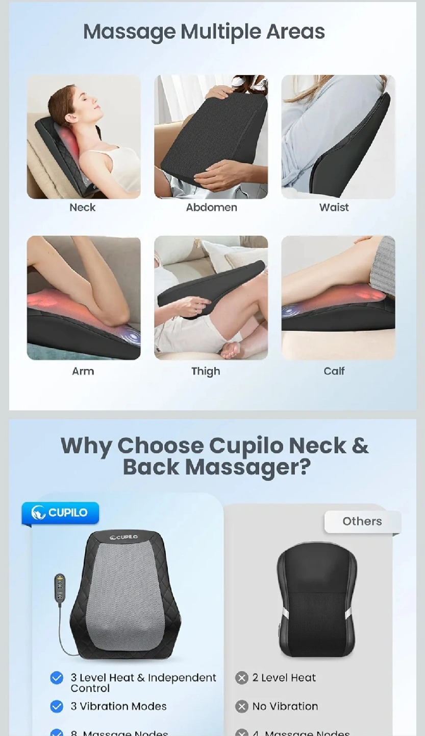 I'm selling a Cupilo neck and back massager! It's designed to massage multiple areas including your neck, abdomen, waist, arm, thigh, and calf. It features: - 3 level heat & independent control - 3 vibration modes - 8 massage nodes It's more contoured for the neck and back!
