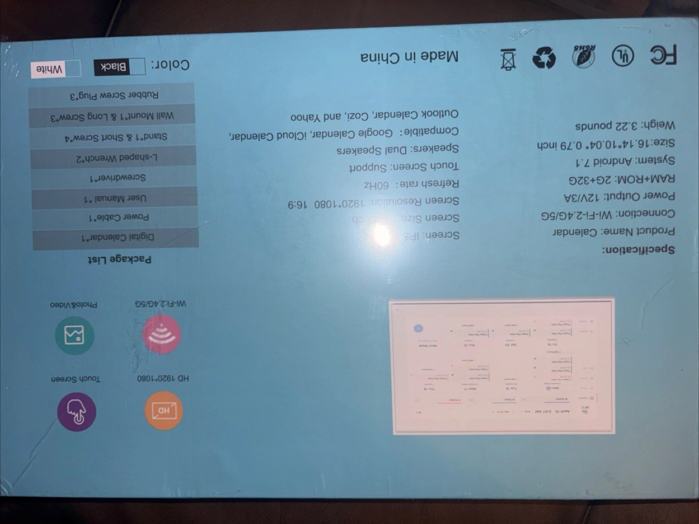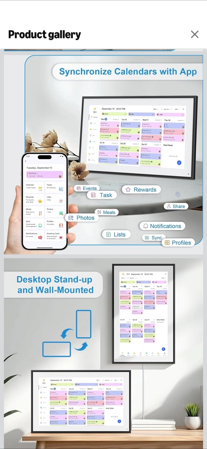 digital calendar with a 16:14 x 10:04 inch screen! It can be used as a desktop stand-up or wall-mounted. It synchronizes calendars with an app. The package includes: