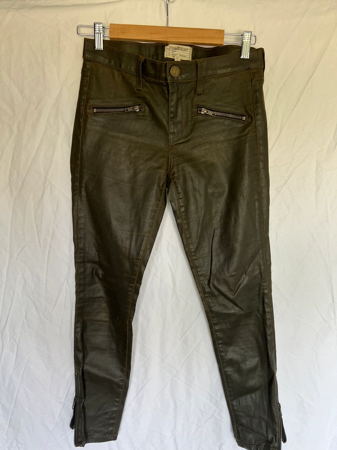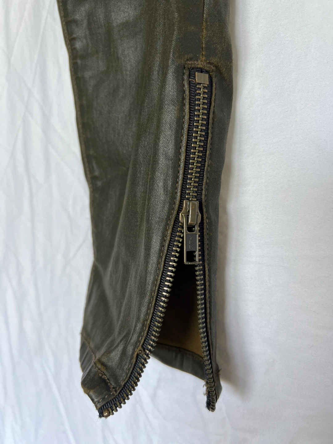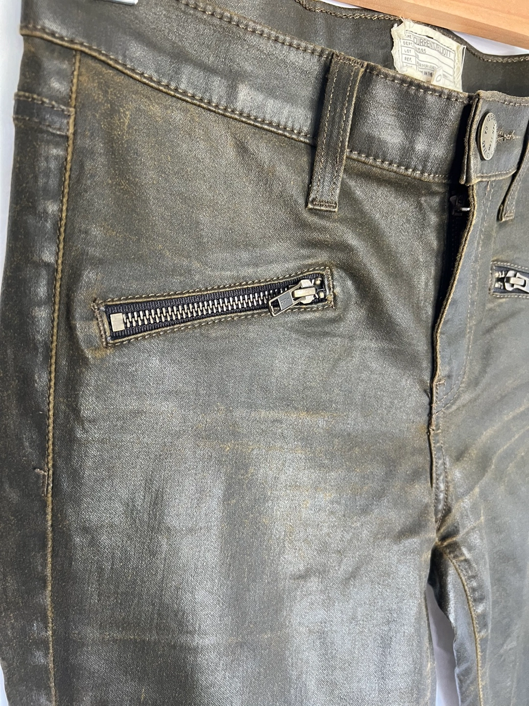 These jeans have a coated finish. They have fun accent zippers on the ankles and on the front pockets. Perfect mix of edge and fun π