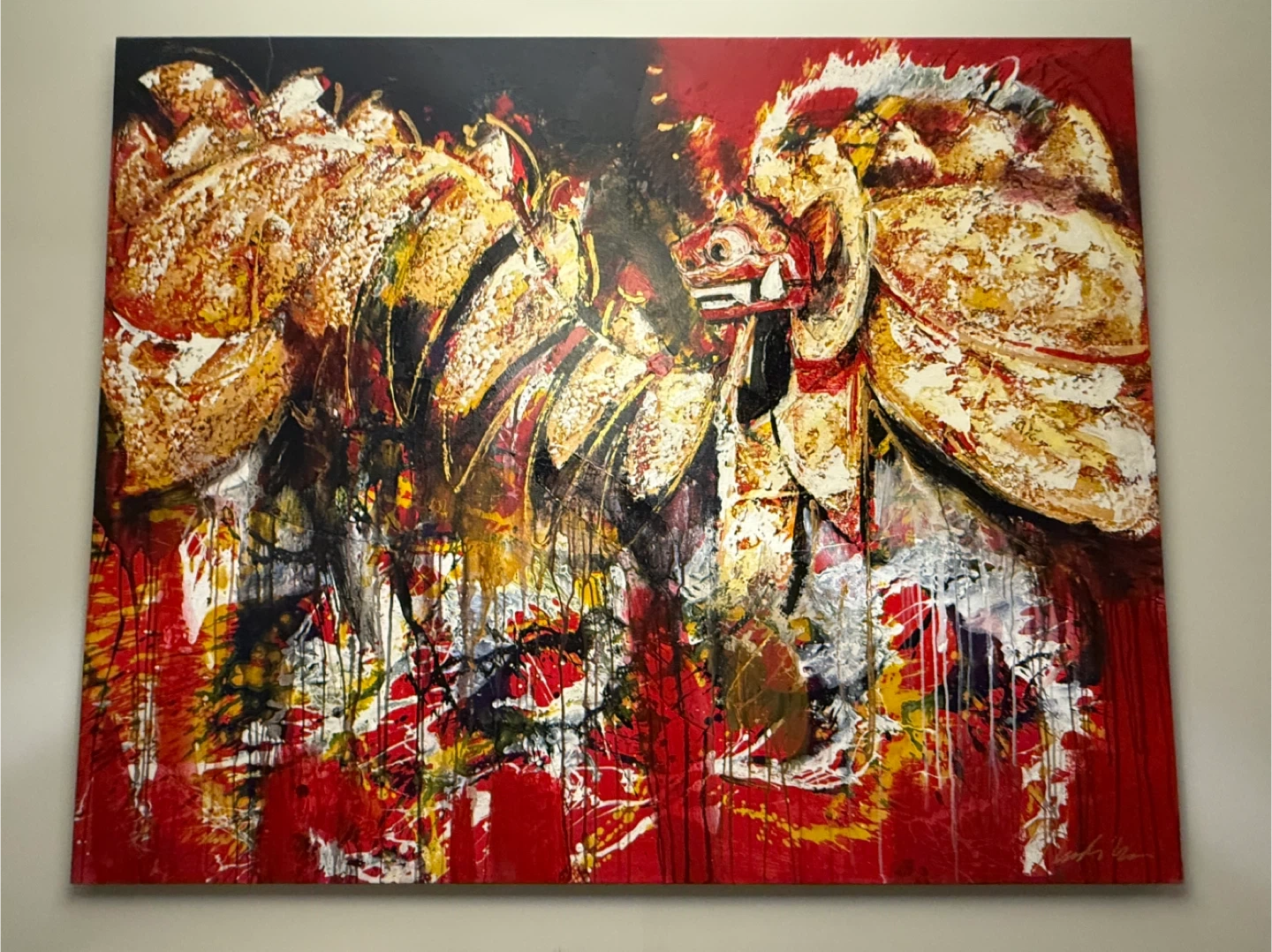 We got this custom painting of the Barong flown over from Bali. It was for $2000 but we are only expecting 50% of that. Barong is a mystical creature believed to fight evil spirits. This is an abstract painting with a vibrant color palette. It features a mix of red, white, yellow, and black hues, creating a dynamic and eye-catching composition. The painting would be a great addition to any art collection or as a statement piece in your home