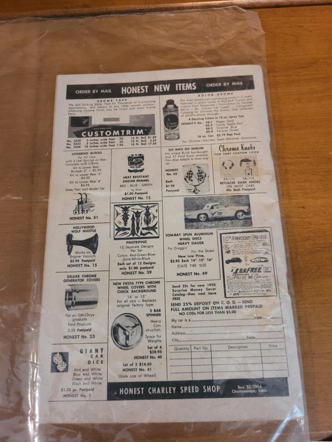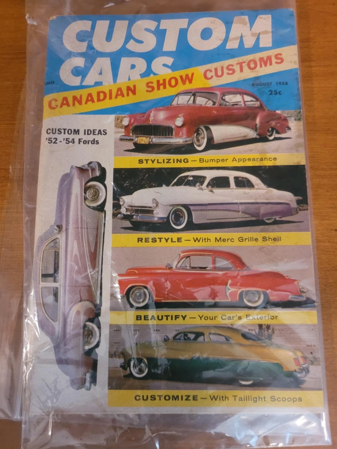 Selling a vintage Custom Cars magazine from August 1958. It's a pictorial featuring custom ideas for '52-'54 Fords, styling bumper appearances, restyle with Merc grille shell, beautify your car's exterior, and customize with taillight scoops. Great for car enthusiasts and collectors!