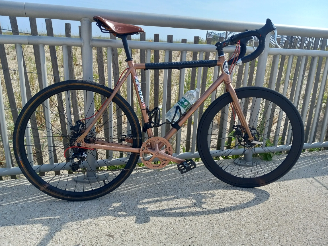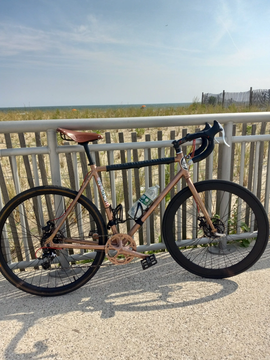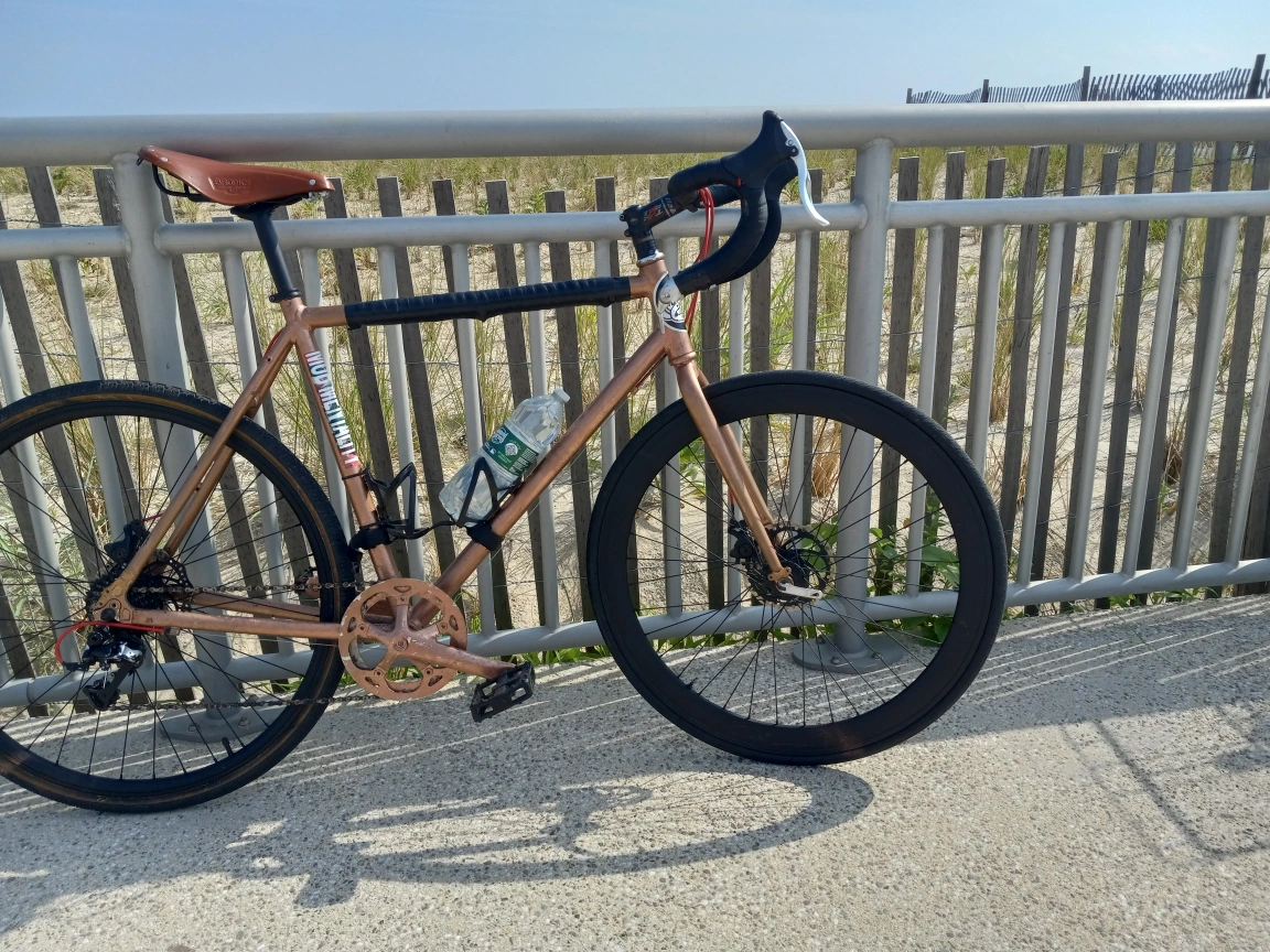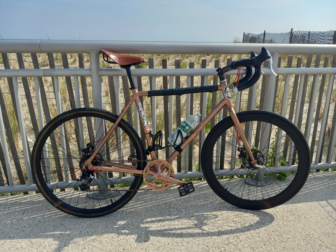 Selling a custom-built gravel bike with a unique metallic bronze finish! It features a comfortable brown saddle and drop handlebars wrapped in black tape. Perfect for both on and off-road adventures