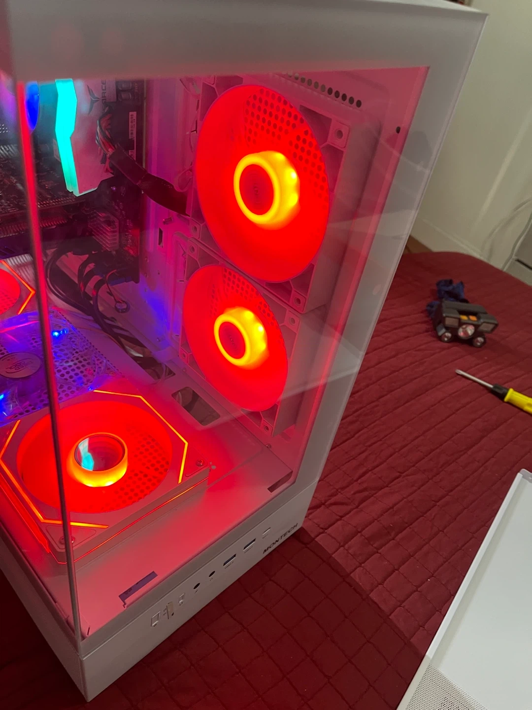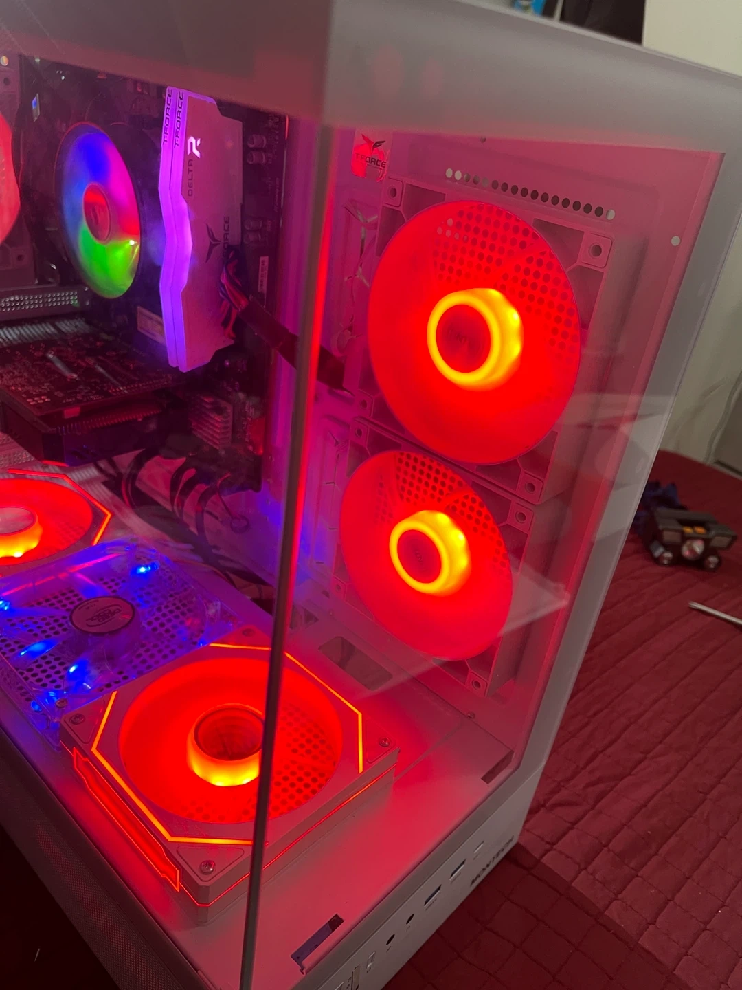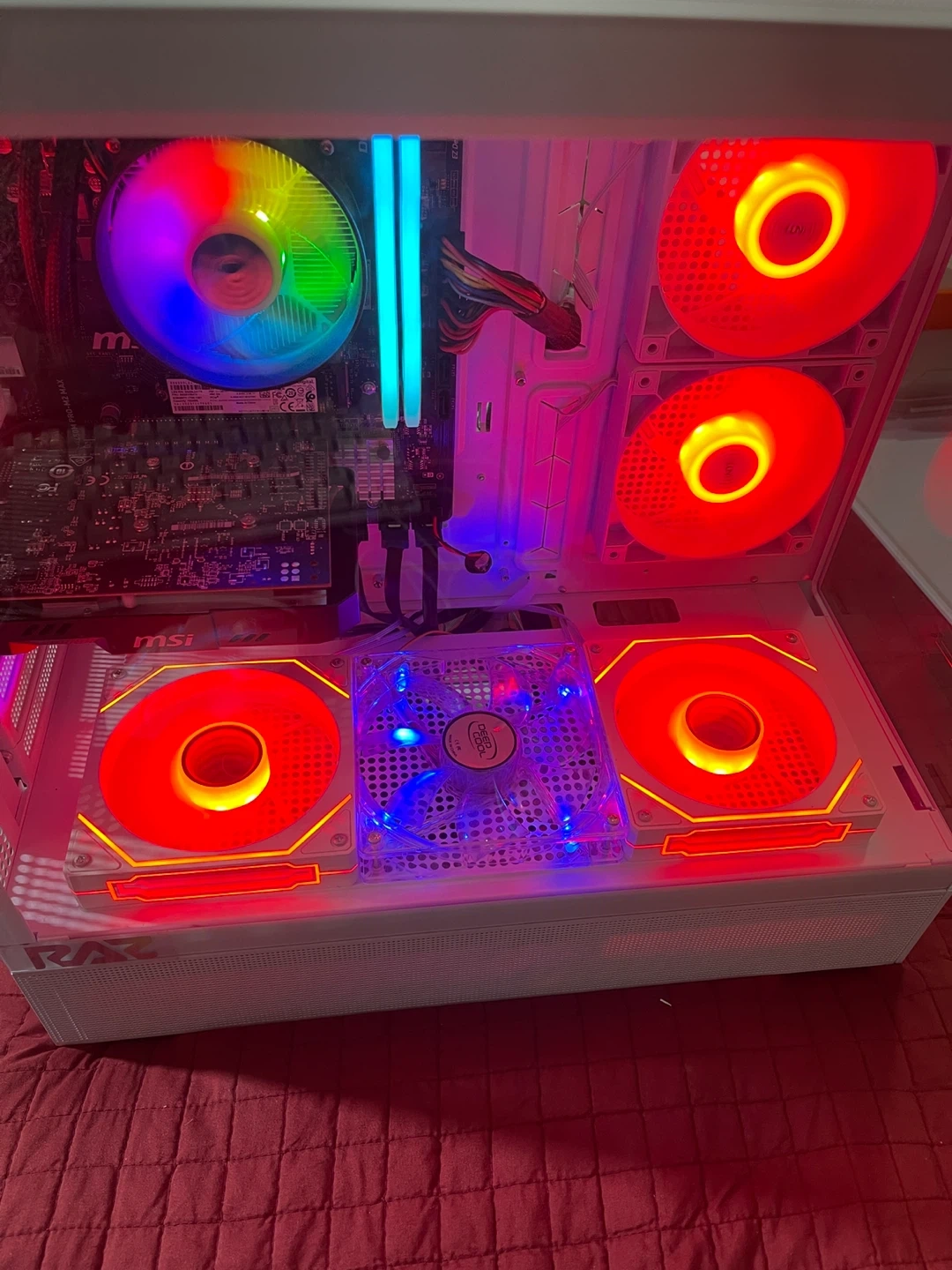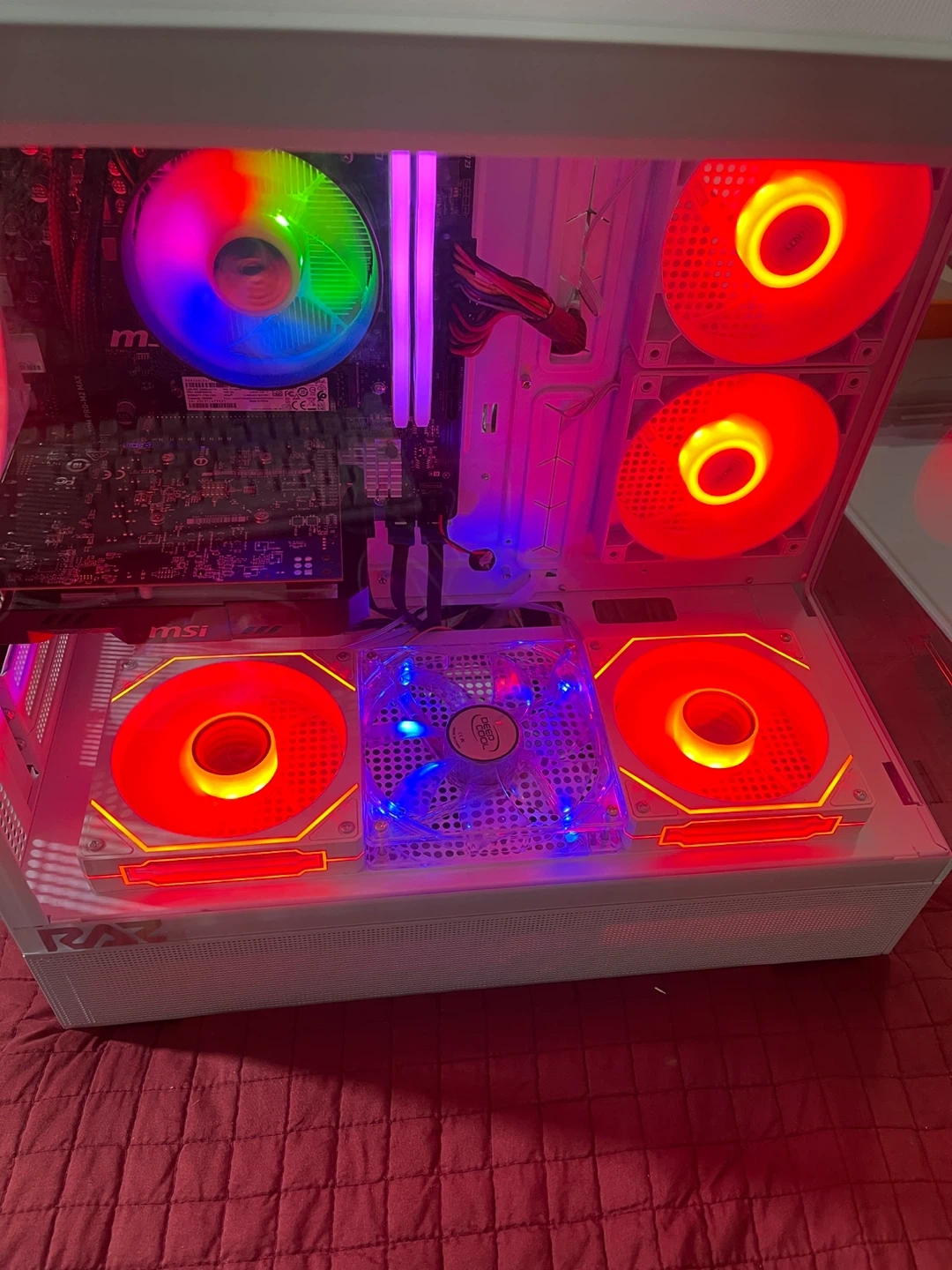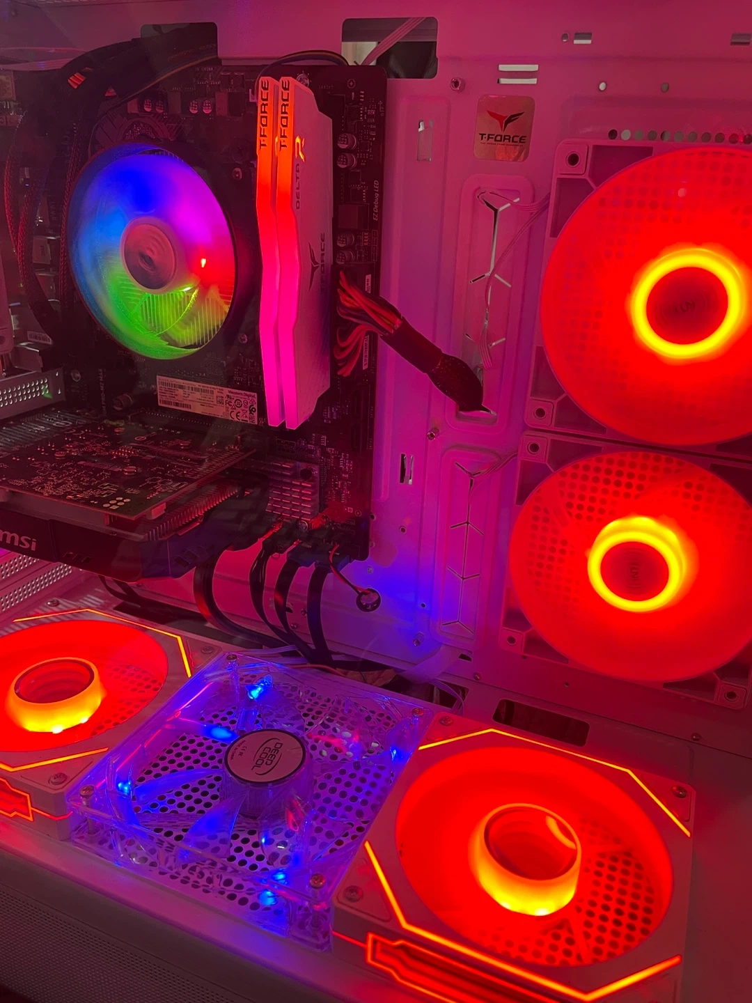 Selling a custom-built gaming PC. It features a white case with a glass side panel, showcasing the RGB lighting on the fans and components inside. The motherboard appears to be an MSI model, and the RAM is T-Force. Great for gaming or other demanding tasks!