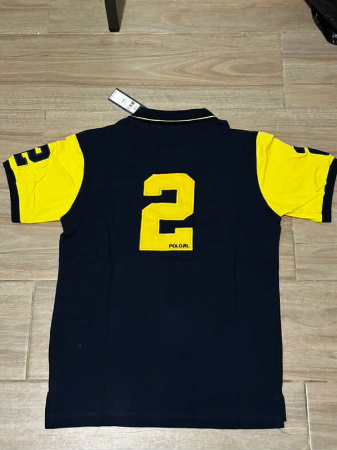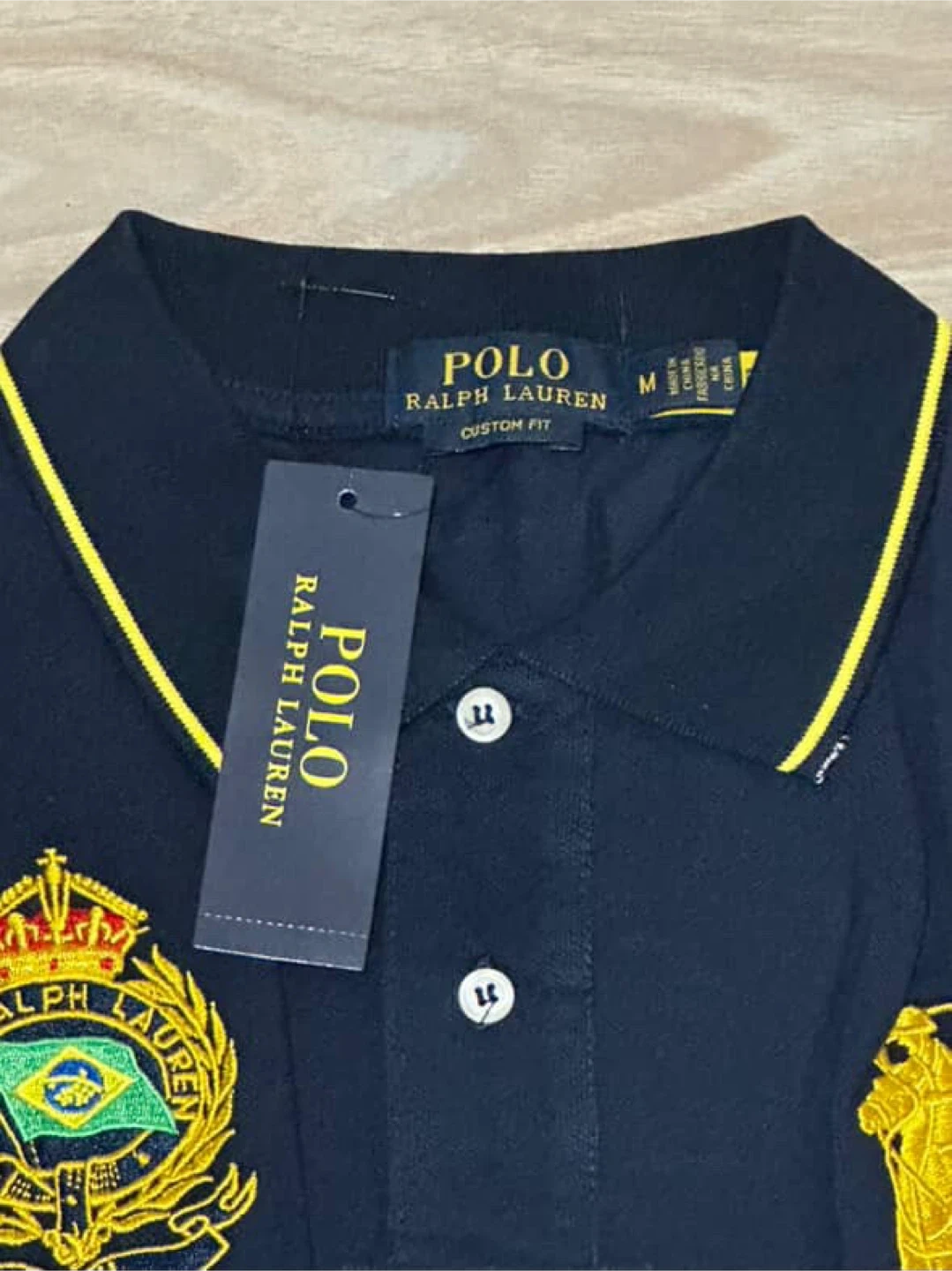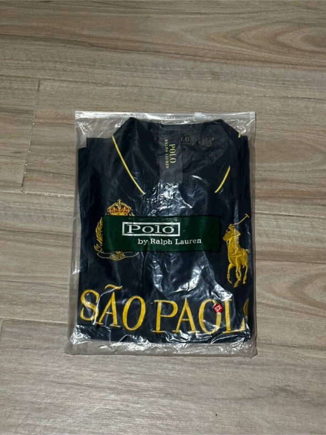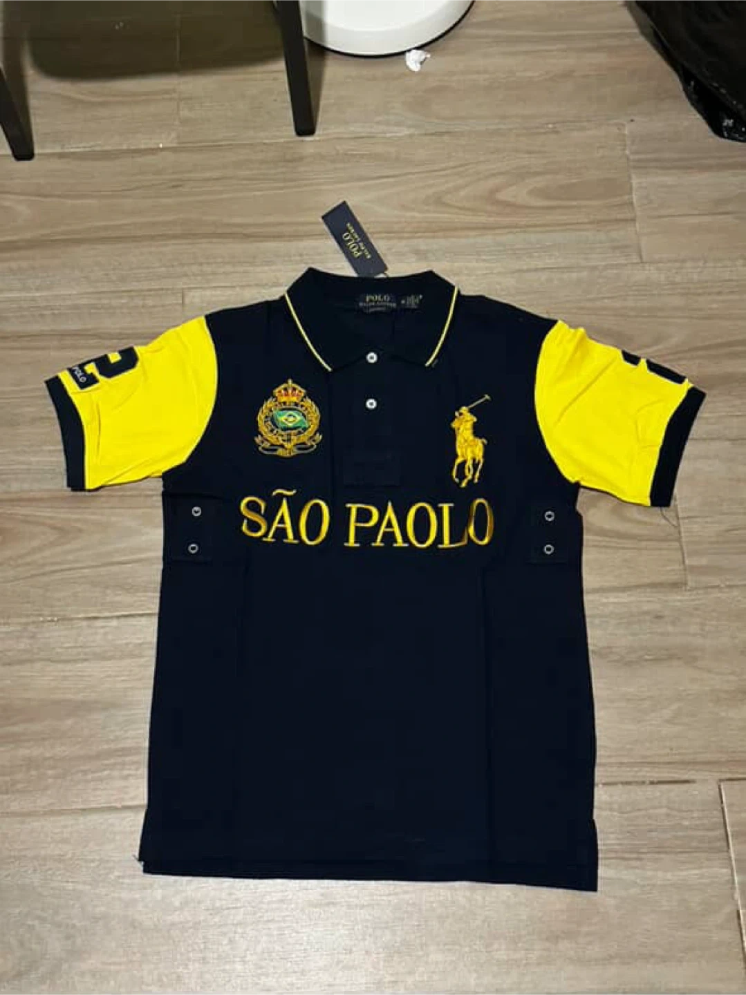 This is a Polo Ralph Lauren Custom Fit polo shirt featuring a São Paolo design. It's a size M and comes in a striking navy and yellow color combination. The shirt is brand new with tags still attached!