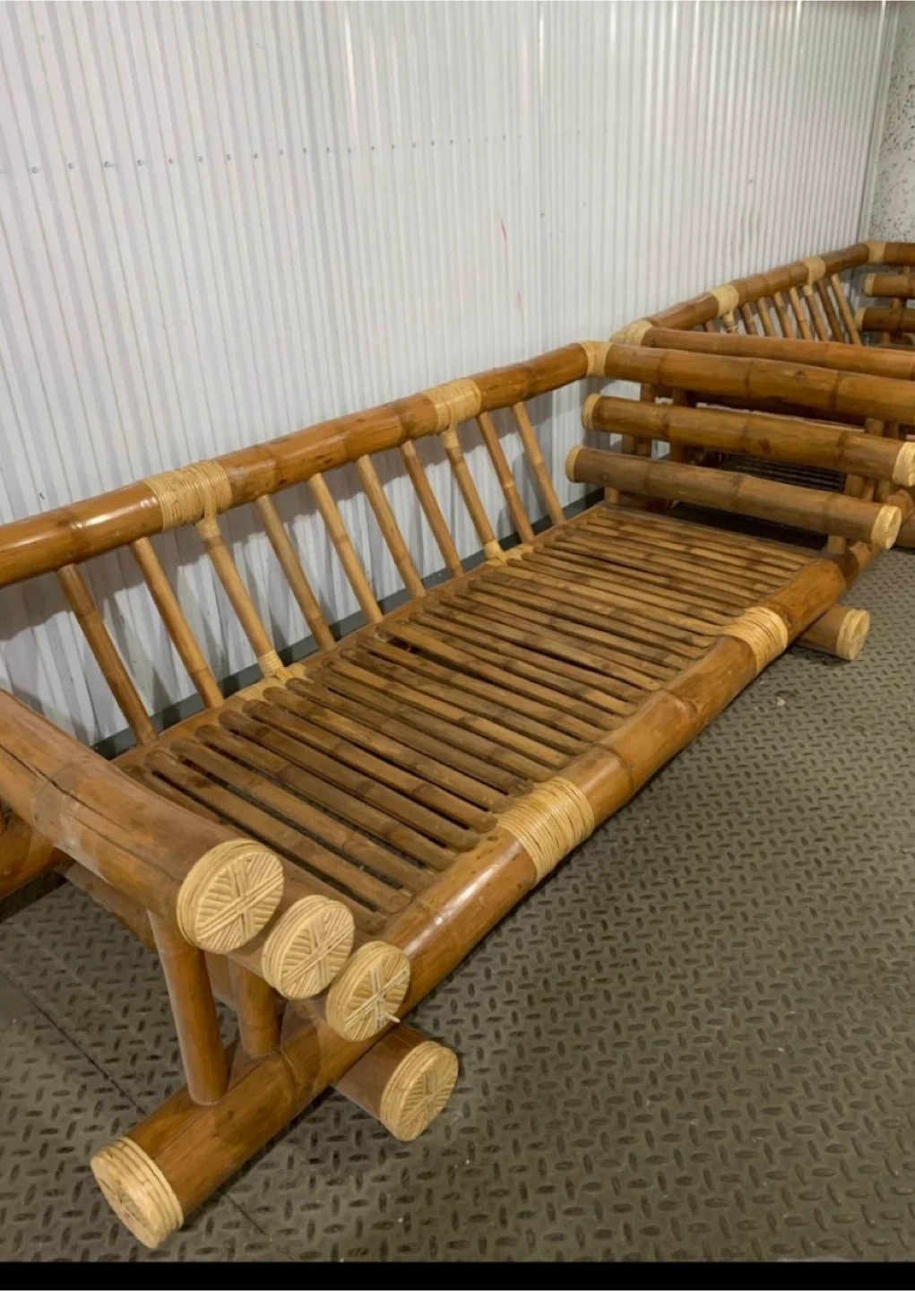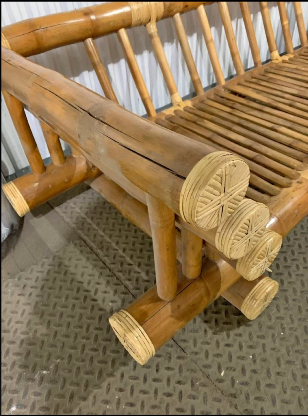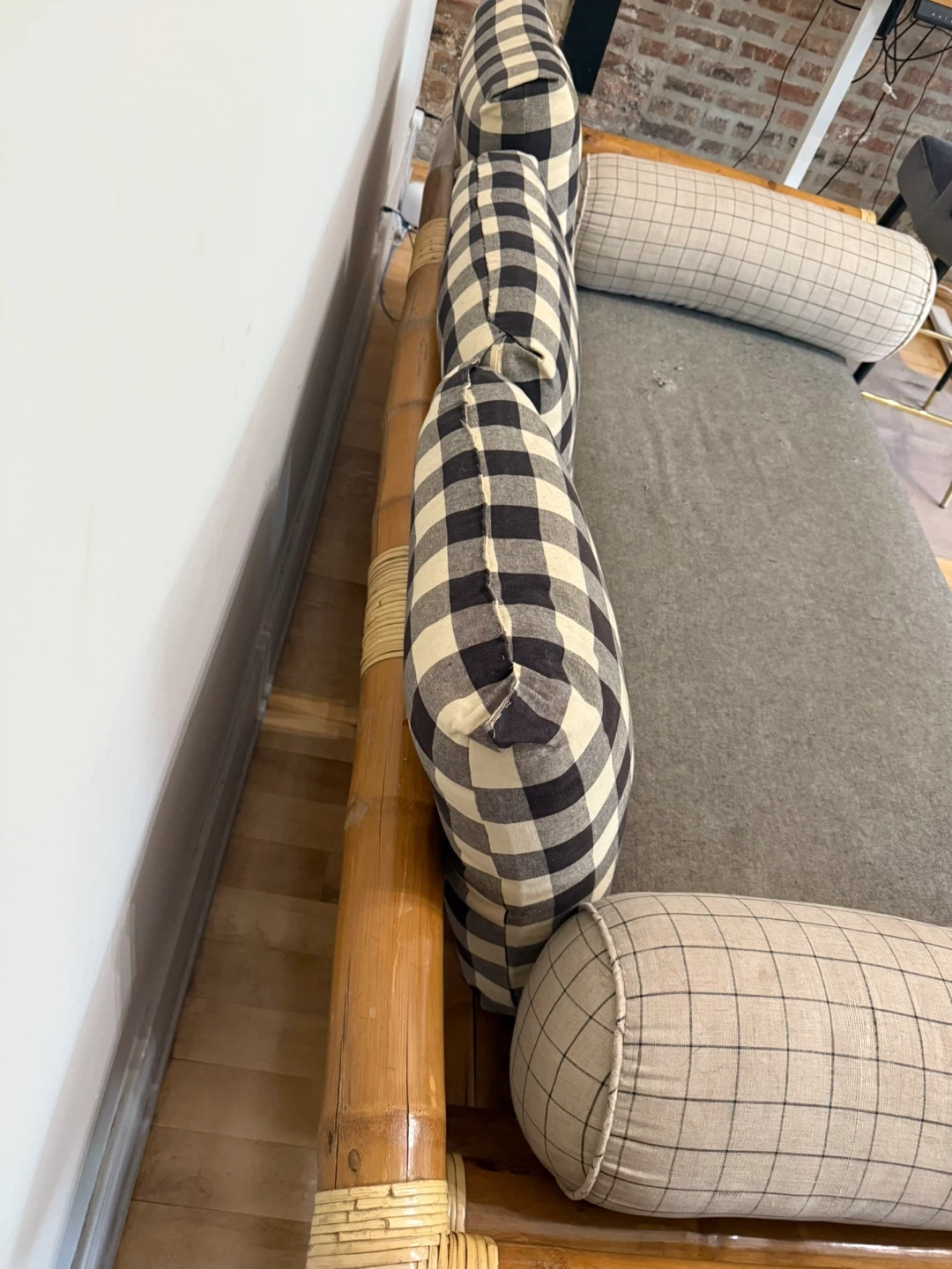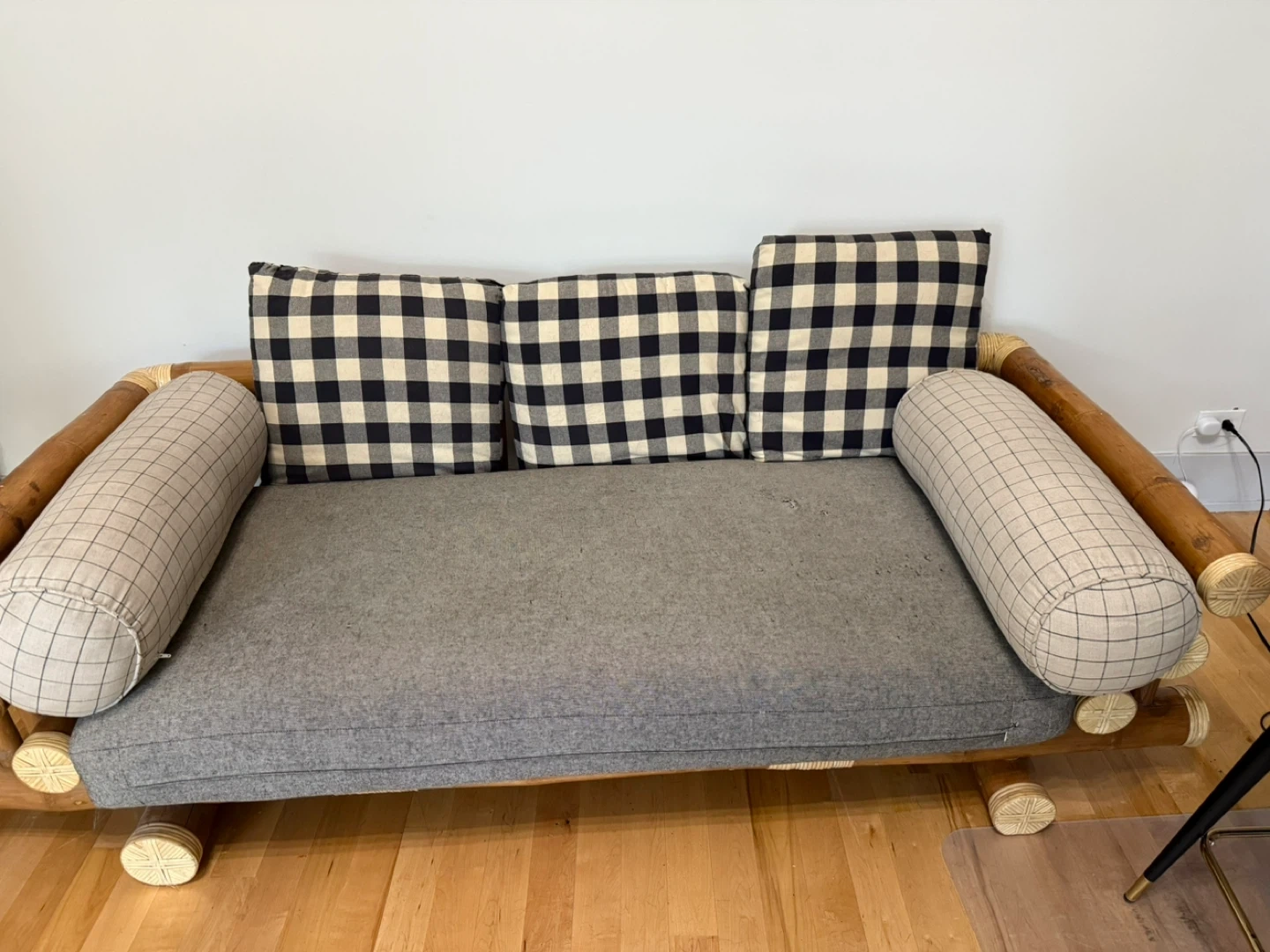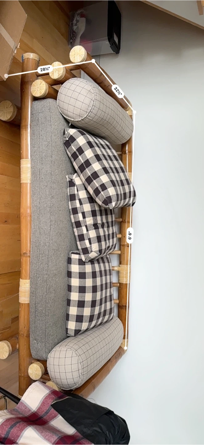 It comes with a gray cushion and several decorative pillows. The frame is made of real wood. Dimensions are approximately 76 inches long, 32 inches wide, and 28.5 inches high. Seat cushion has a small tear that can be replaced or repaired. Other than that perfect condition.