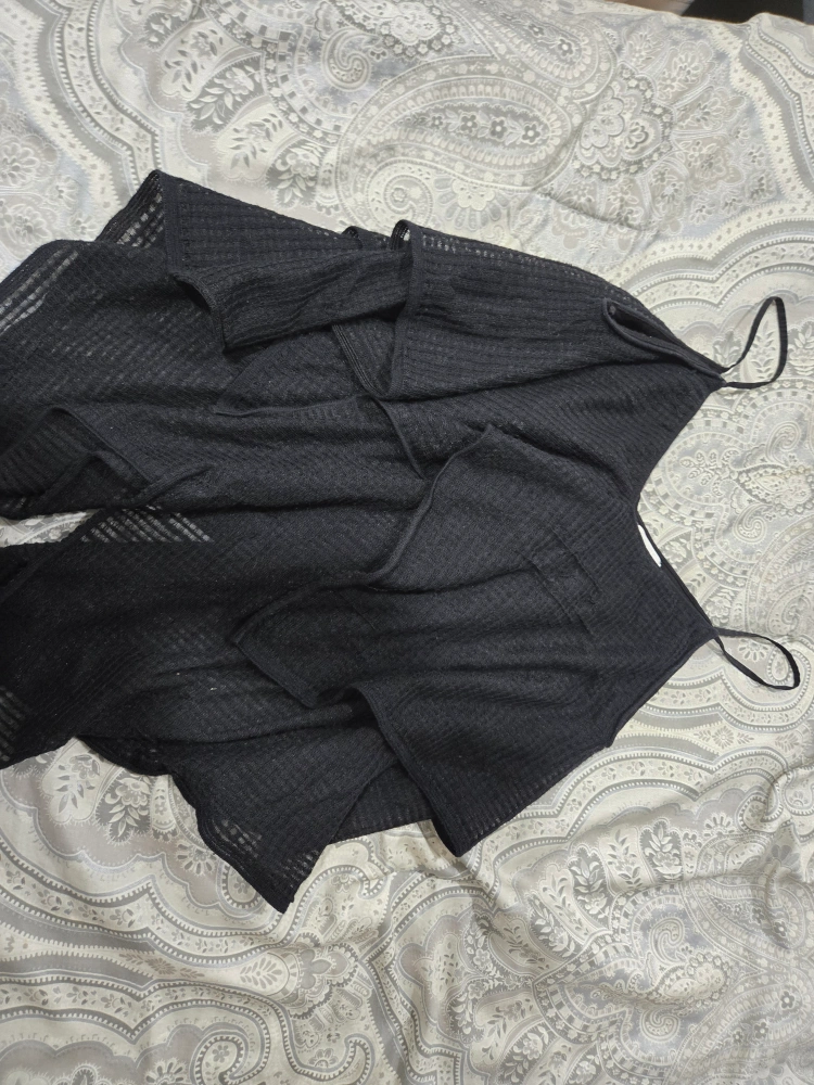 A black top, with thin straps. Features a V-neck. It is layered, giving it a nice flow. This top is perfect for a relaxing evening.