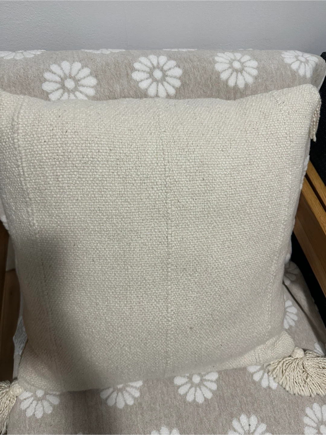 Off-white throw pillow with a textured weave. Features decorative tassels on the corners. Its neutral color makes it a versatile accent piece for any sofa or chair.