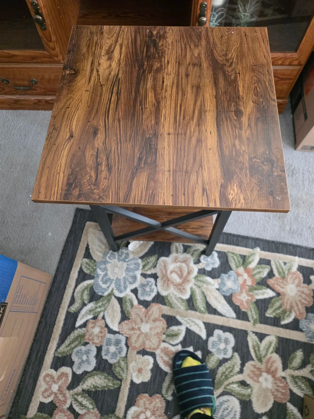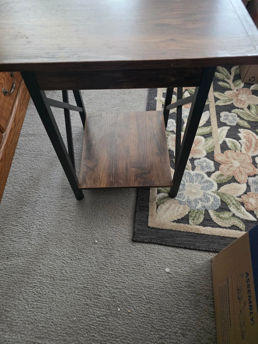 A nice end table with a wood grain laminate top and a black metal frame. It has a lower shelf for extra storage. It's a compact size, perfect for placing next to a couch or chair.