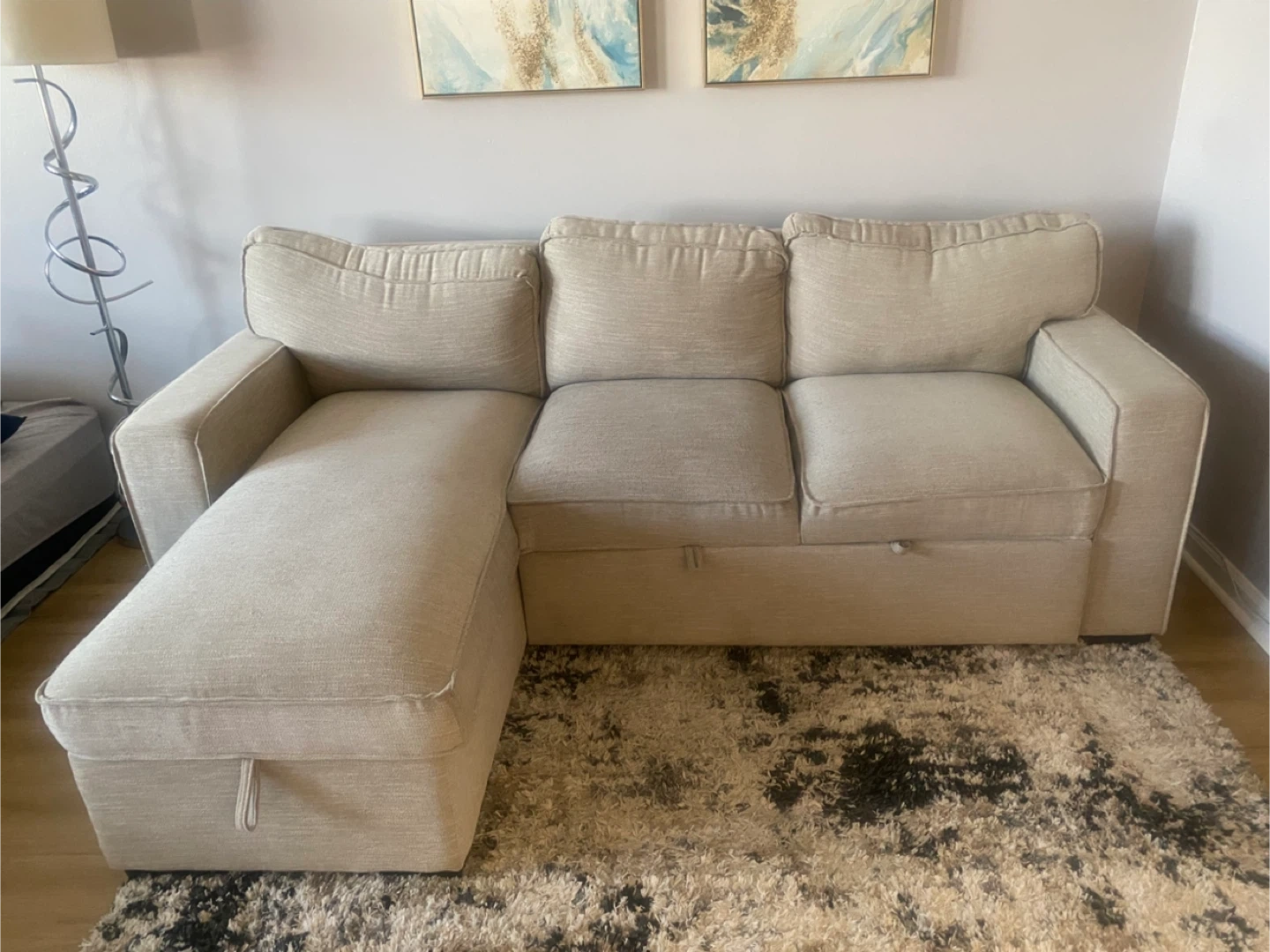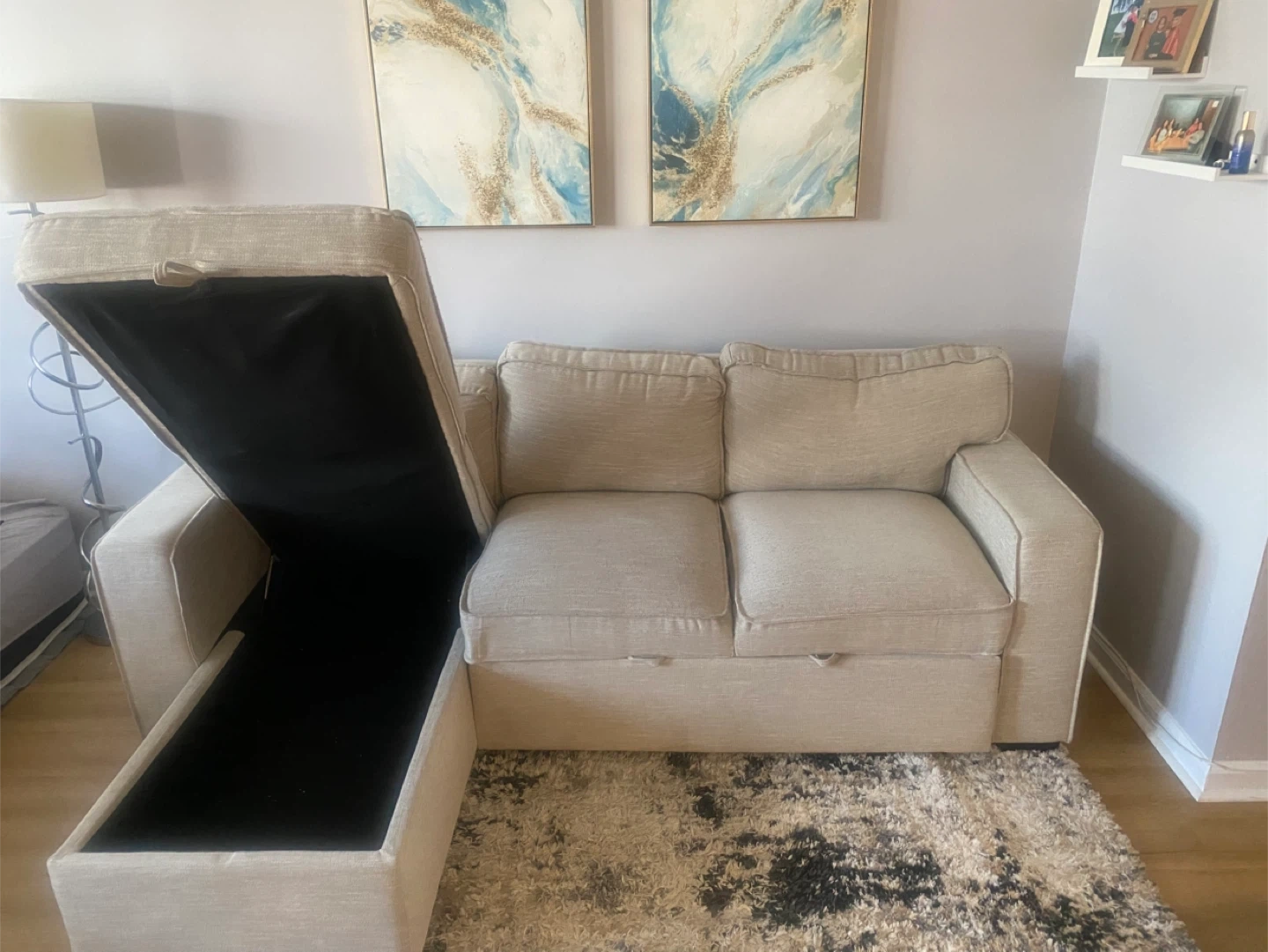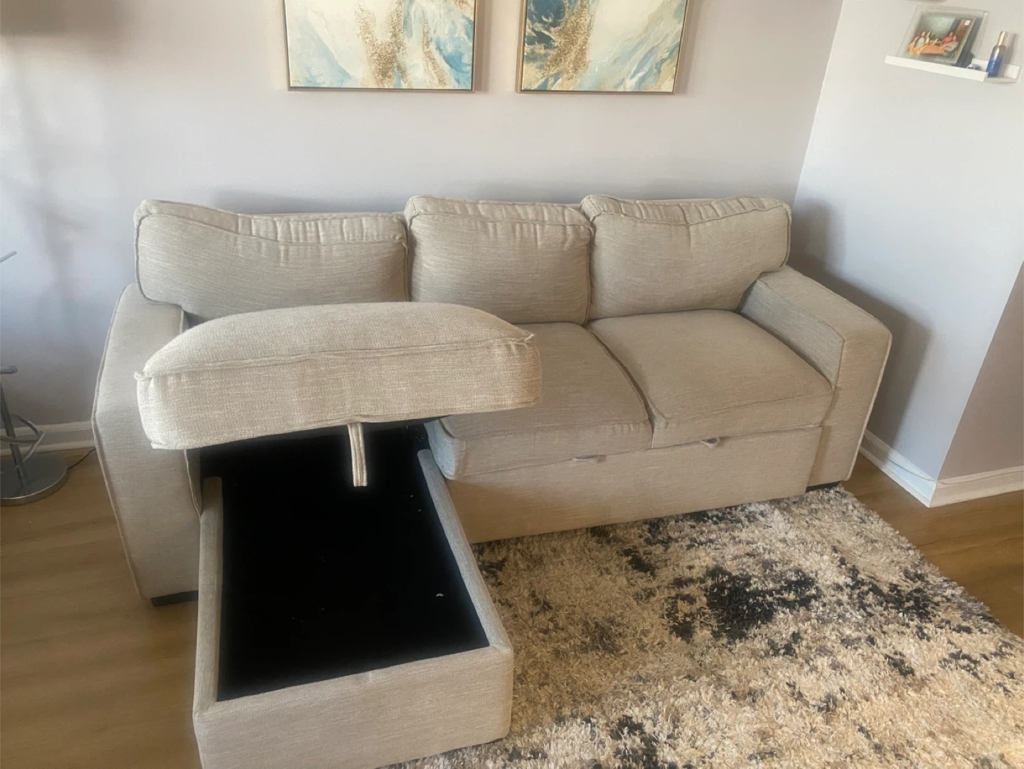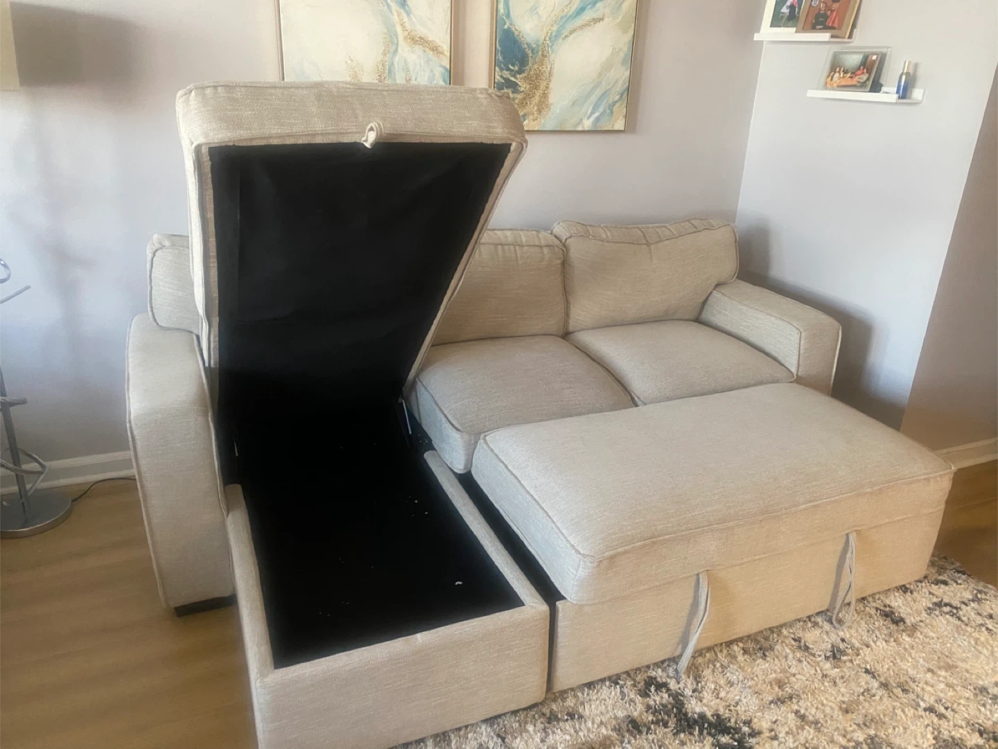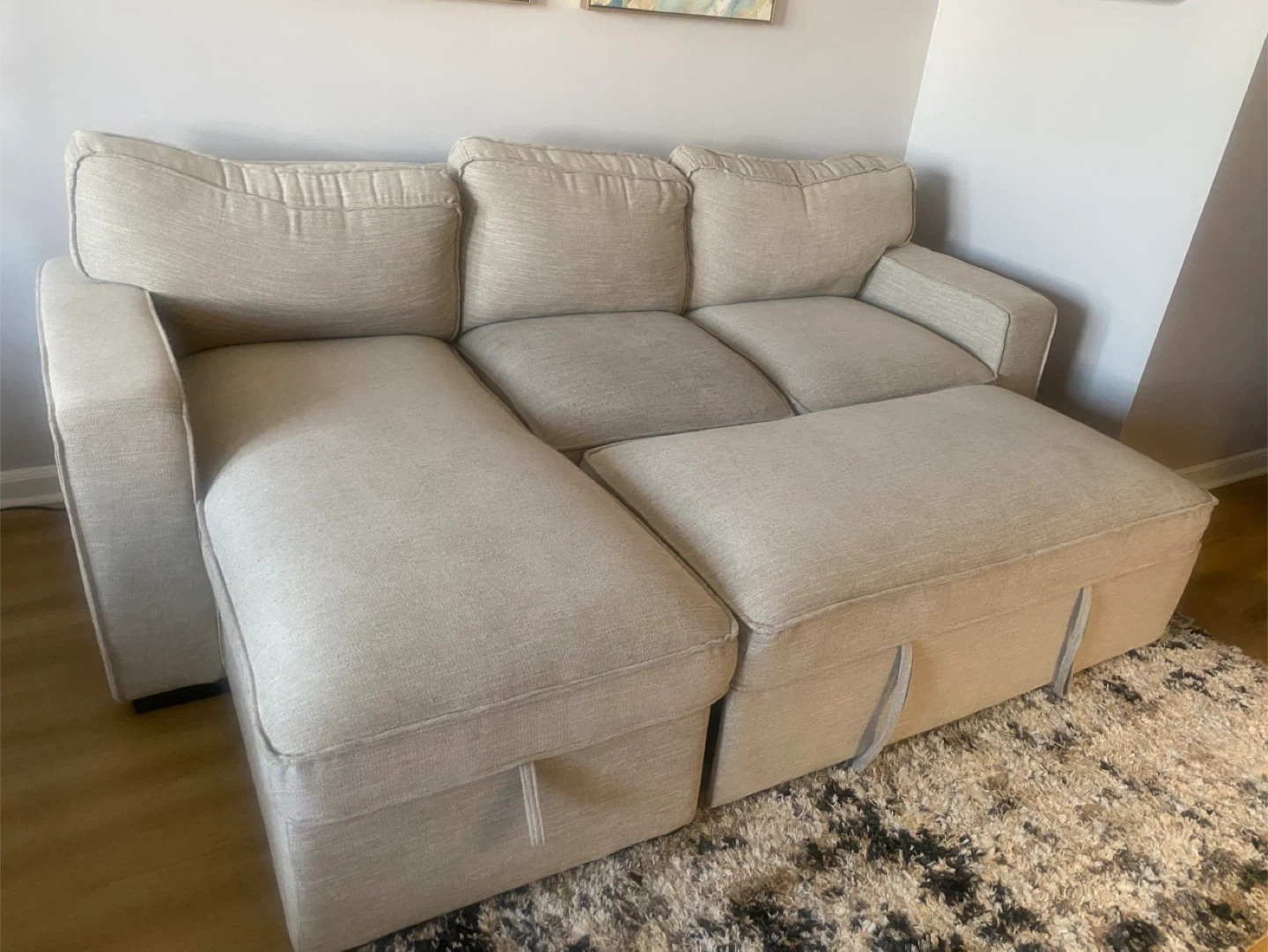 Comfortable sofa bed in a neutral beige fabric. It features a chair with hidden storage underneath and a pull-out section for extra seating or lounging, with removable cushions. This sofa is perfect for maximizing space in smaller living areas or apartments!