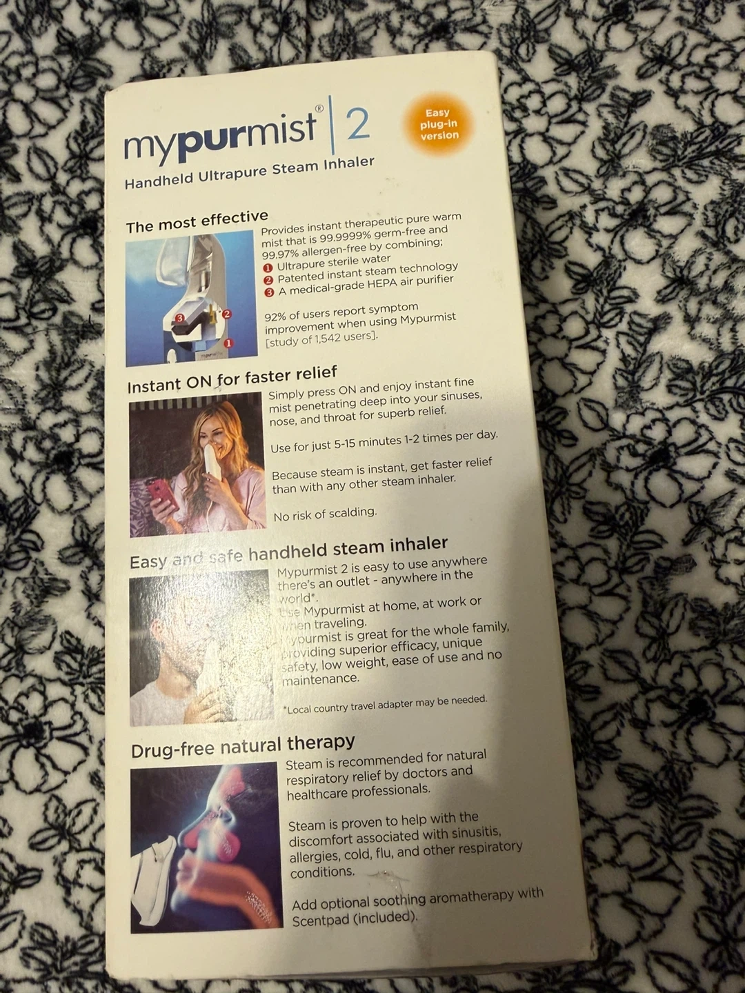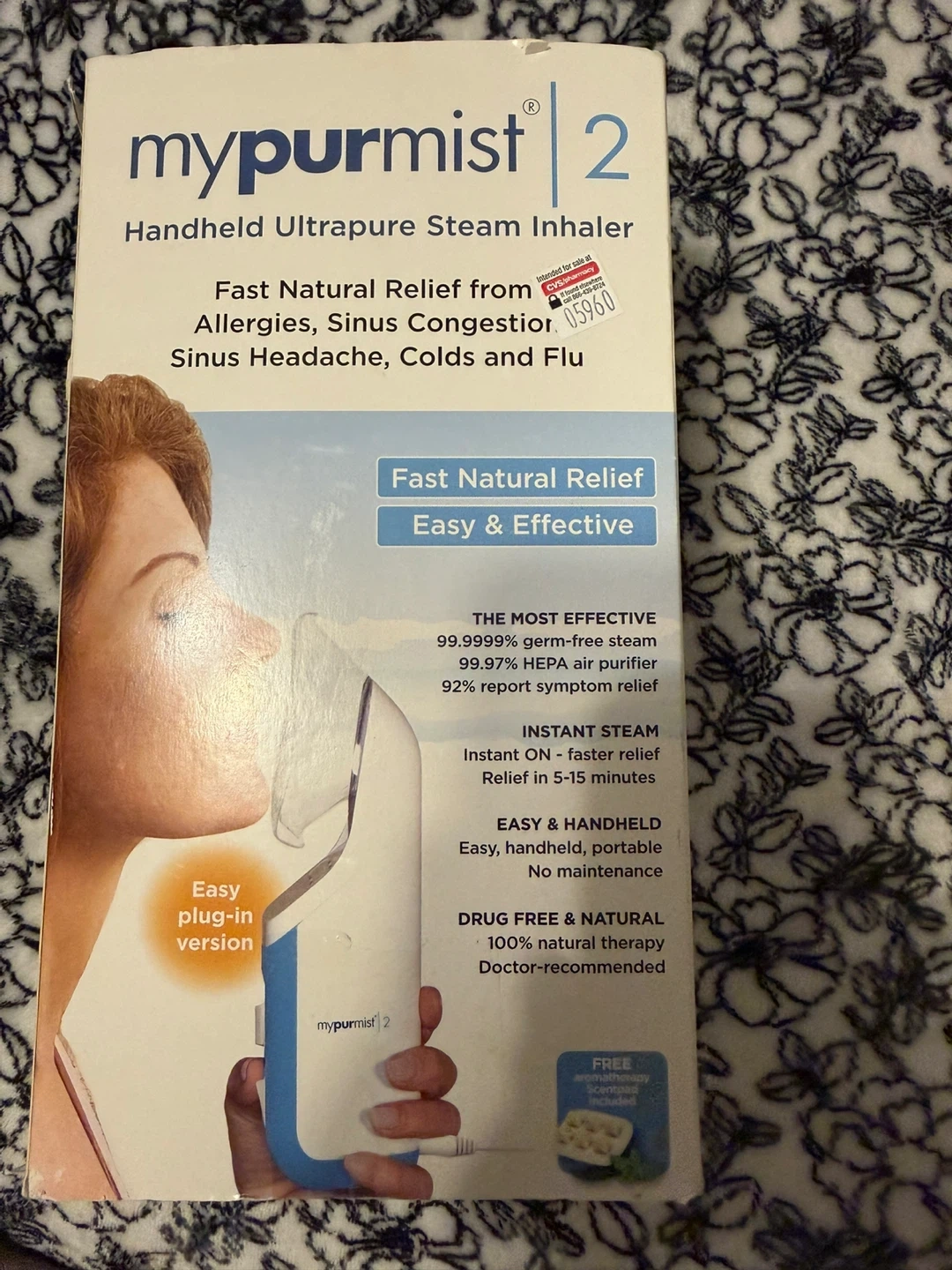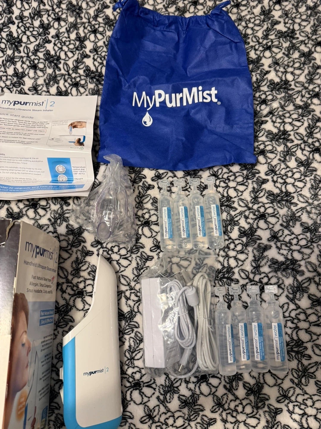 This MyPurMist 2 handheld steam inhaler provides instant, natural steam for relief. It's doctor-recommended and includes 8 MyPurMist ultrapure sterile water refills. It's easy to use and portable, perfect for home or travel!