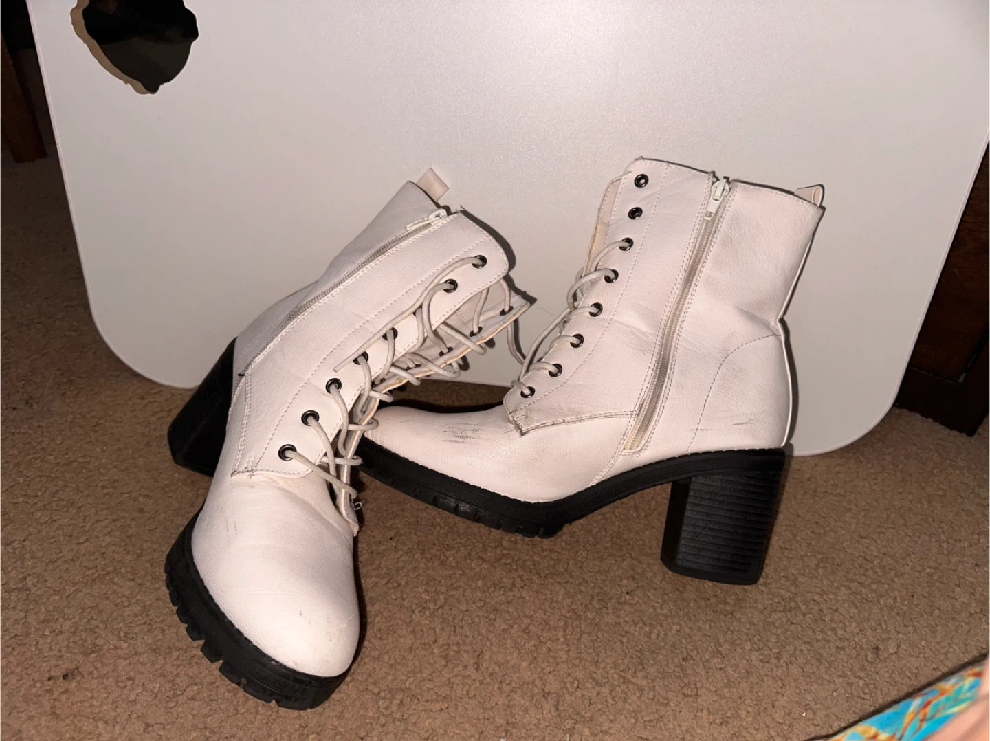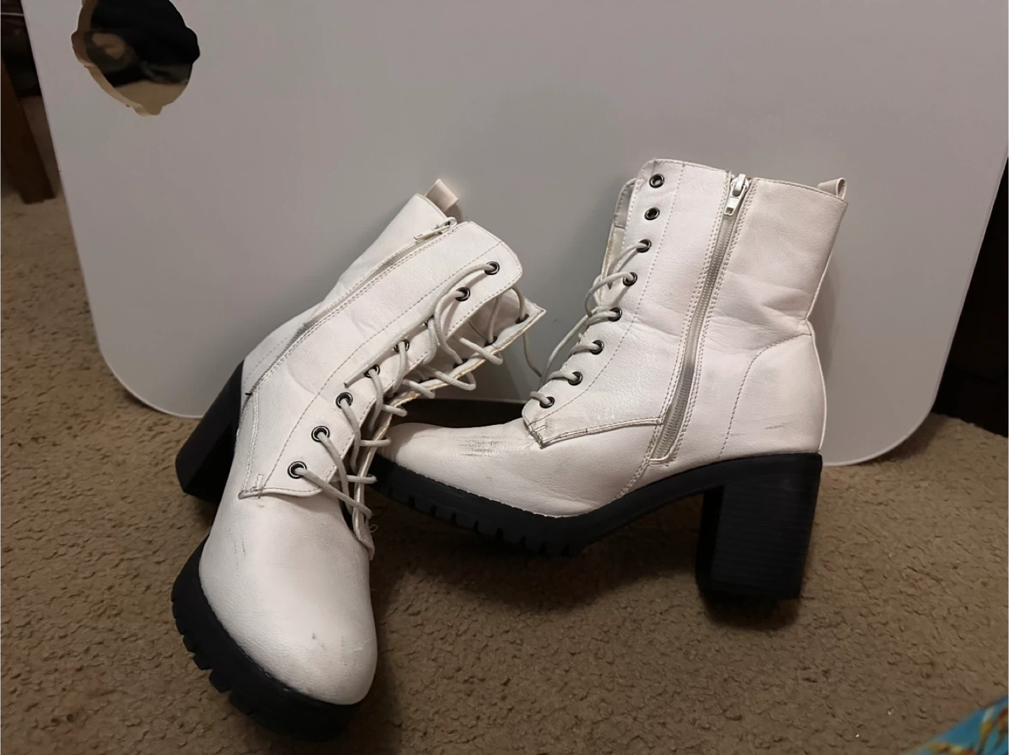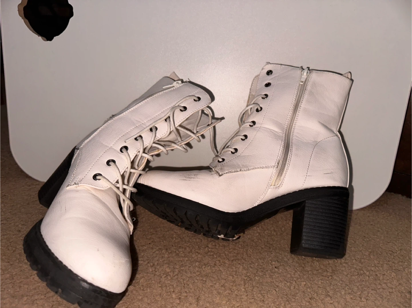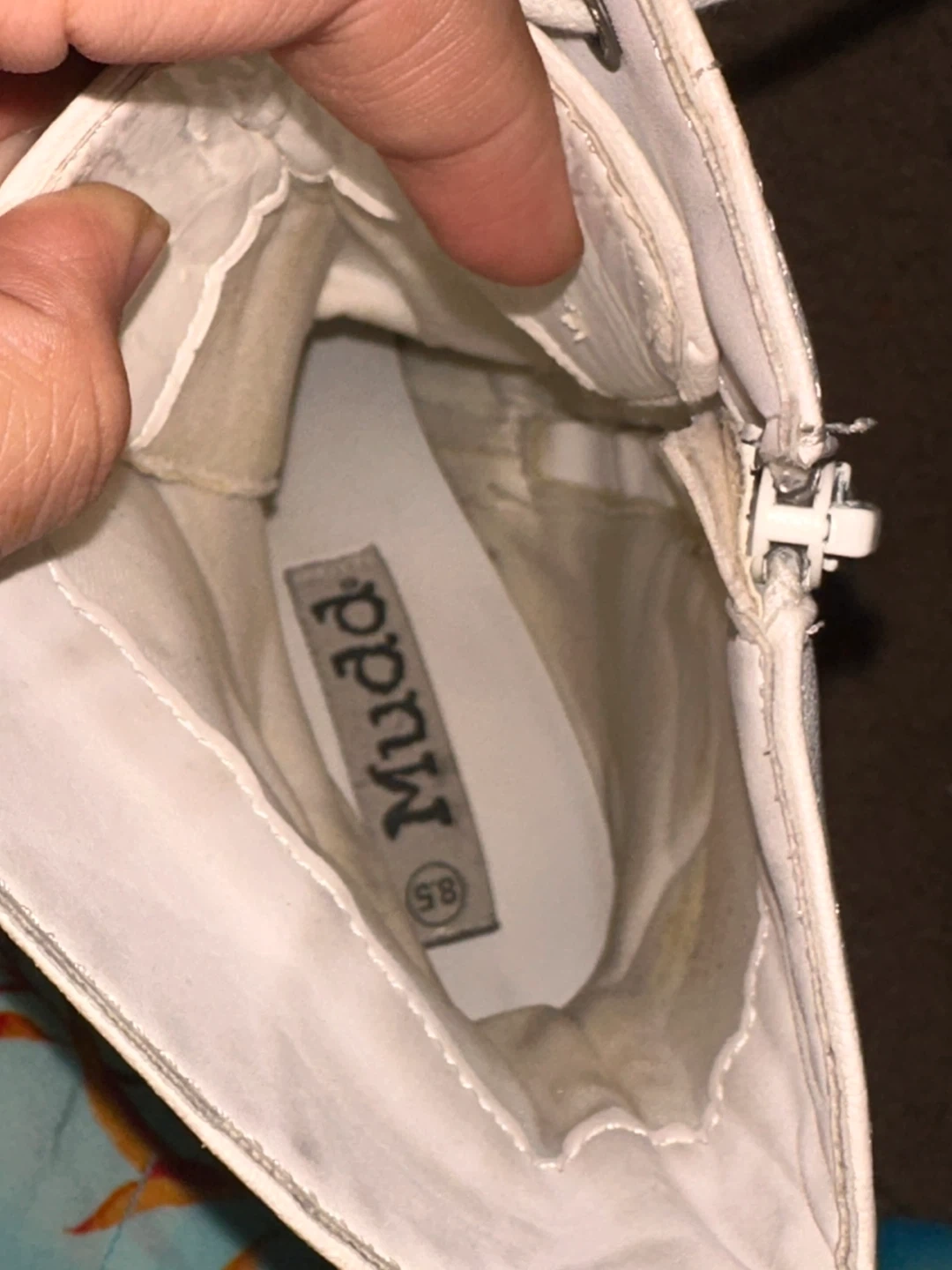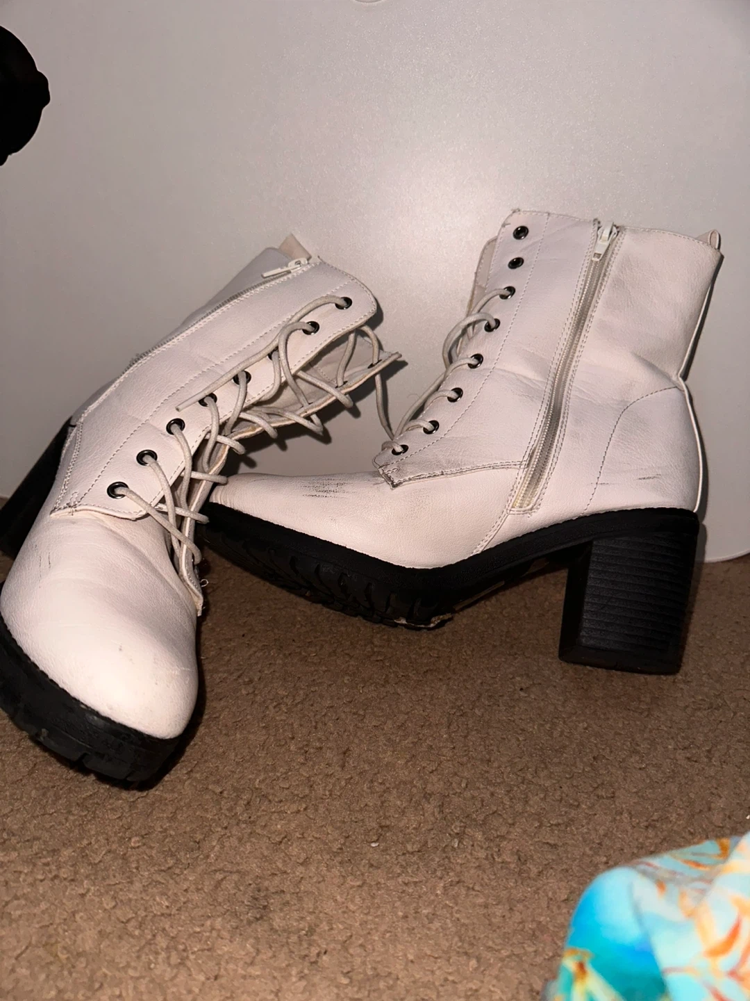 Selling a pair of Mudd white heeled boots in size 8.5. They have a lace-up front and a zipper on the side. There are some signs of wear, as shown in the photos.
