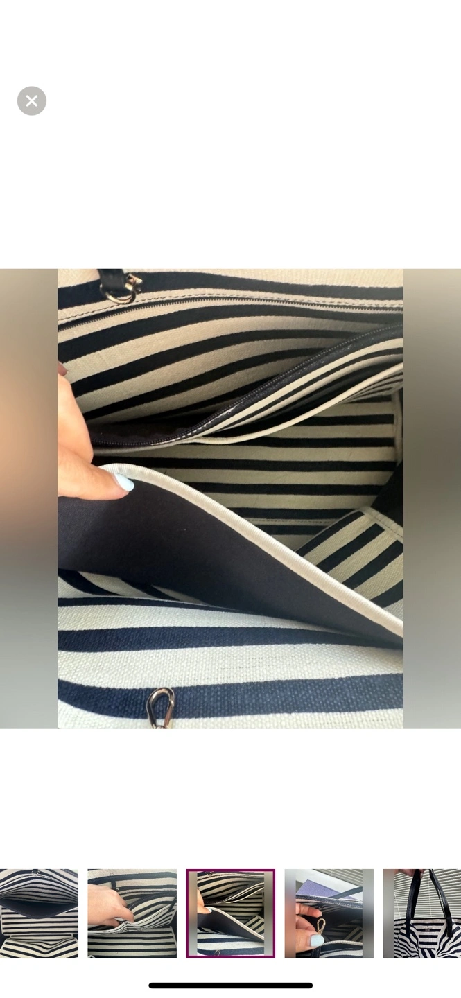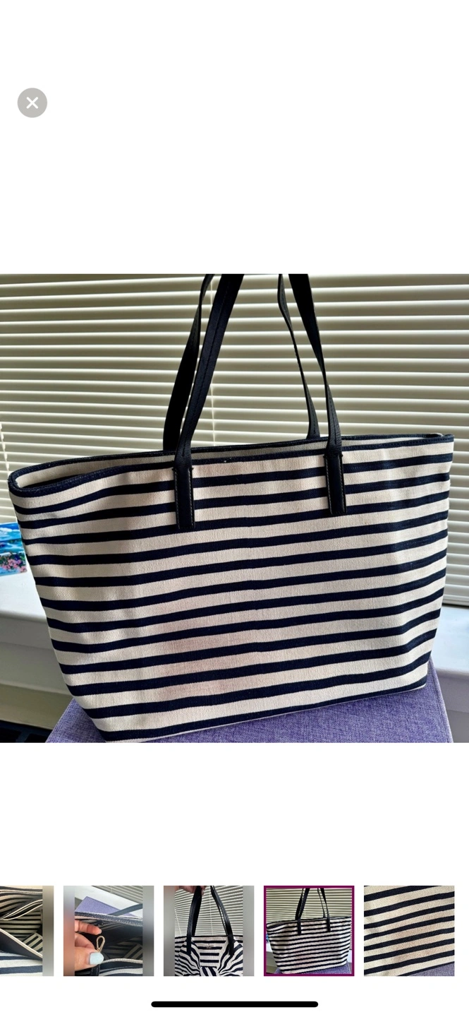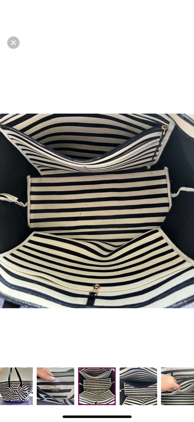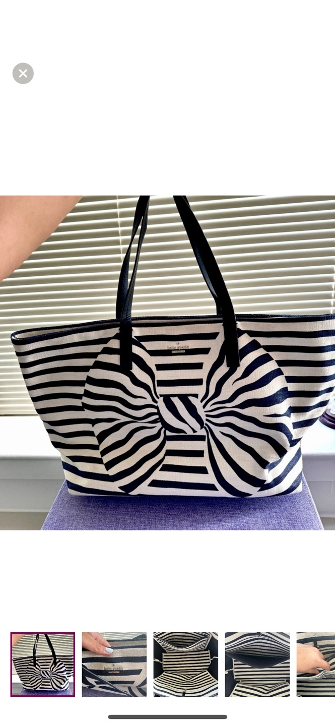 Large tote bag/weekender bag. Black and white striped pattern. Bow detail on the front. Inside has multiple pockets. Leather