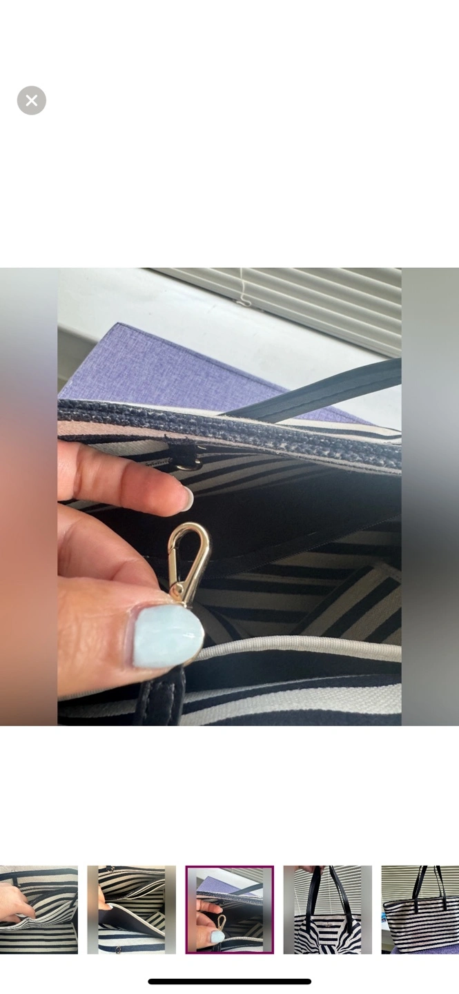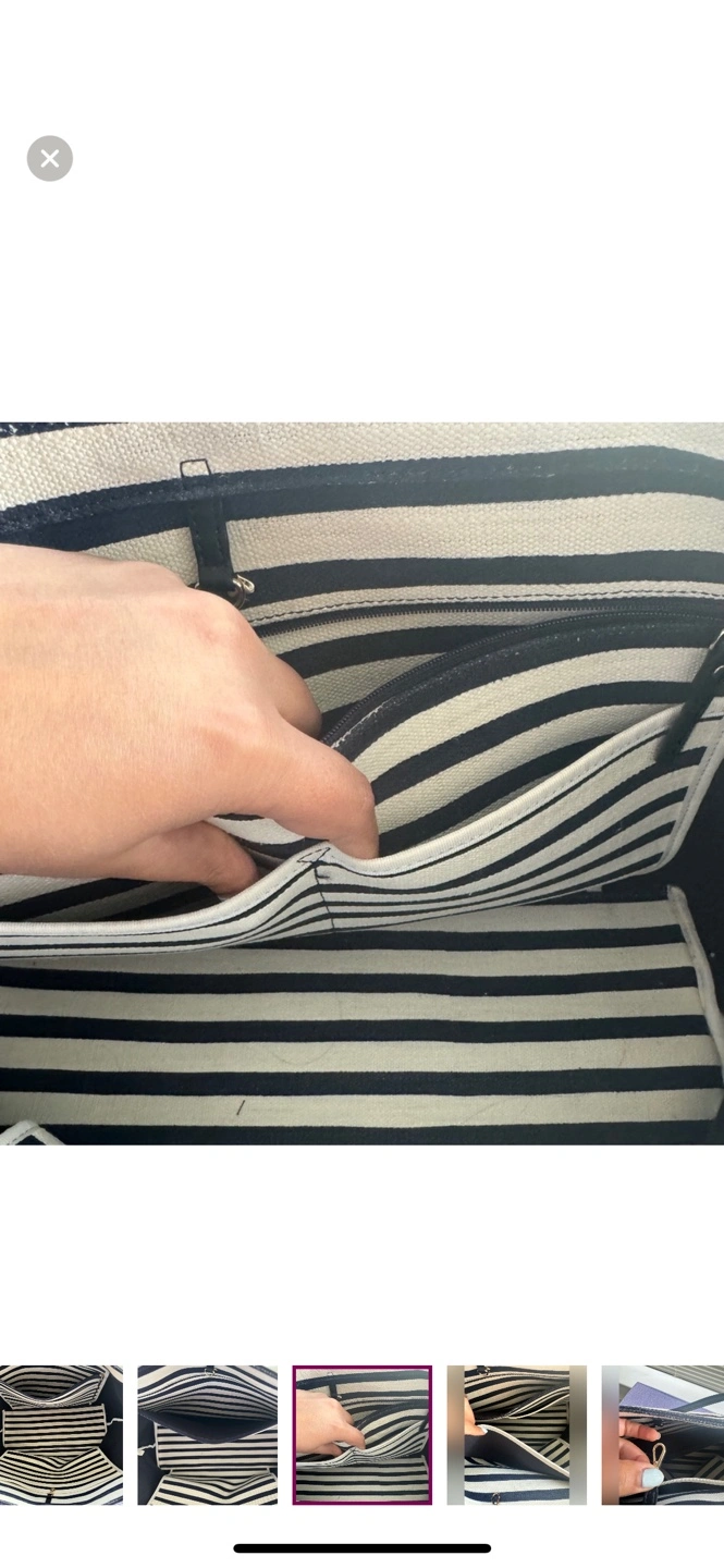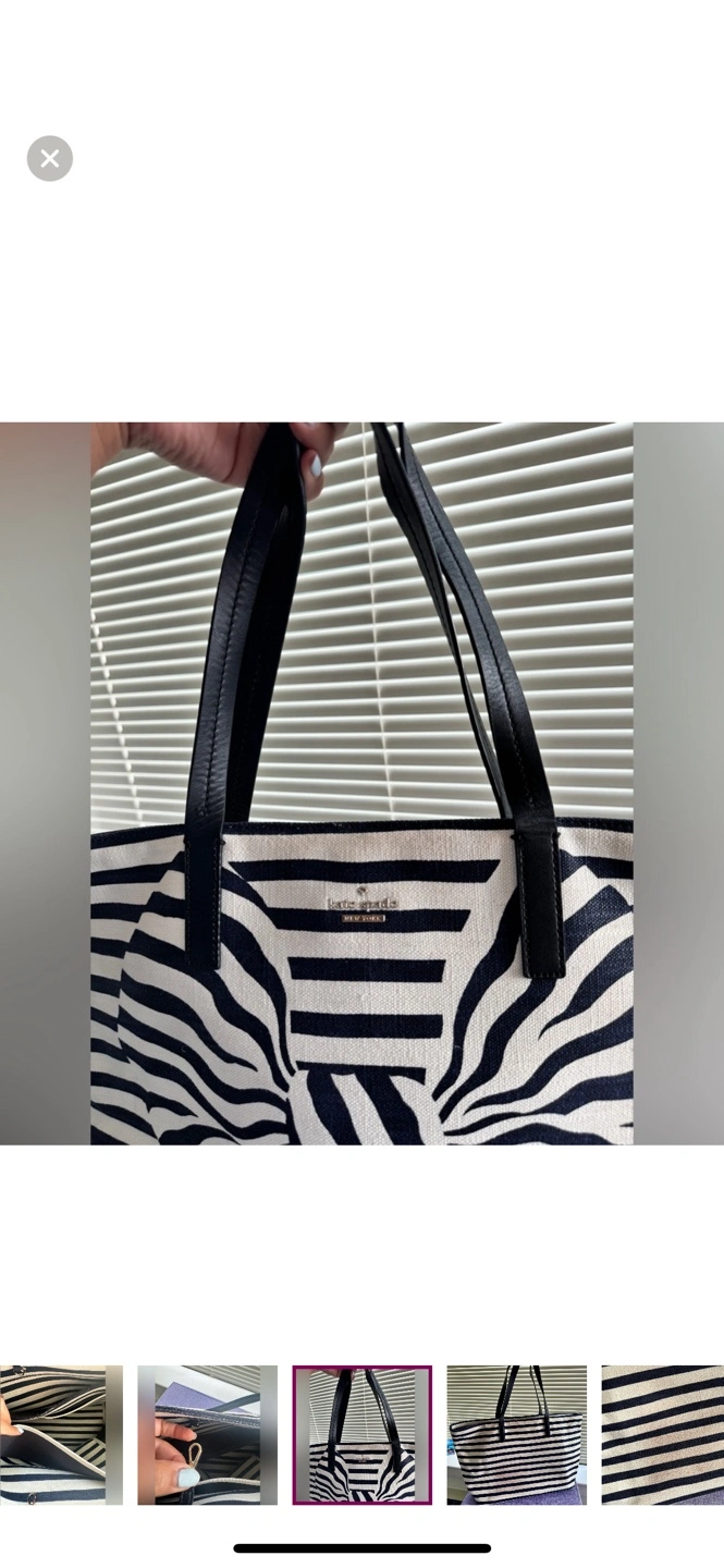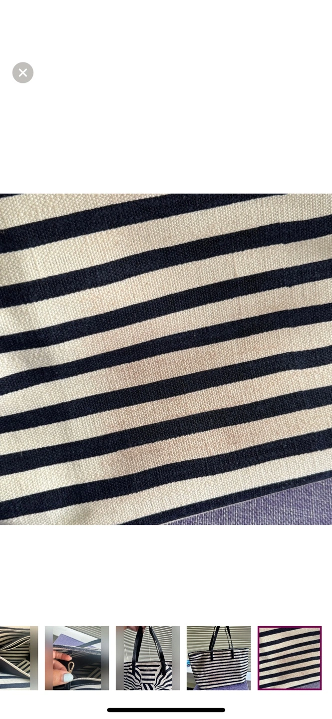 Large tote bag/weekender bag. Black and white striped pattern. Bow detail on the front. Inside has multiple pockets. Leather