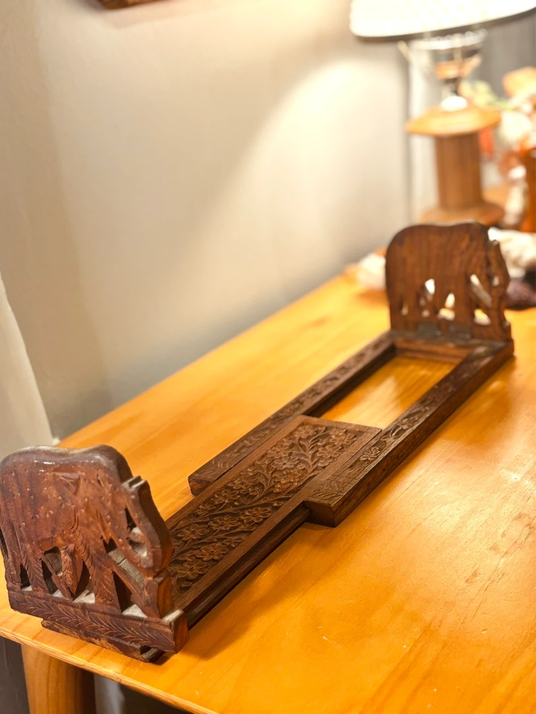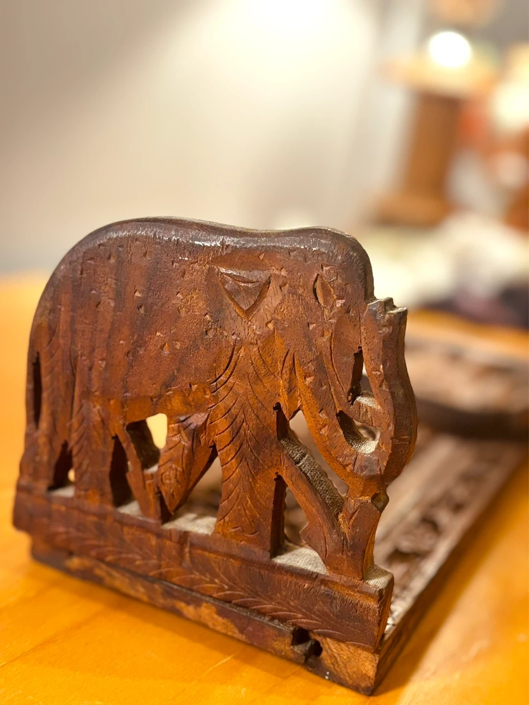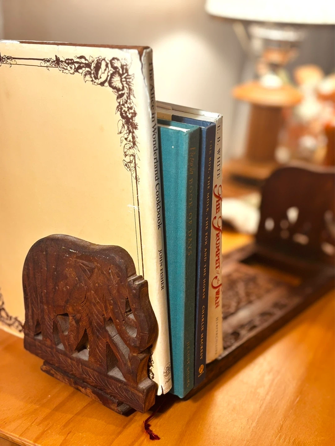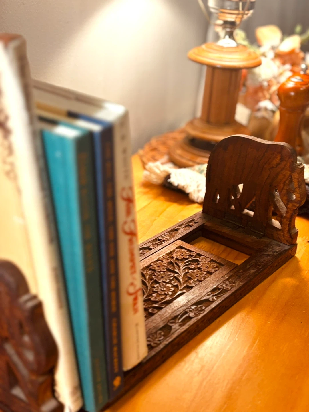 Beautifully bookends with adjustable length and intricate floral details and elephant motifs. Hand-carved wood. These'll add a unique decorative touch to any bookshelf!