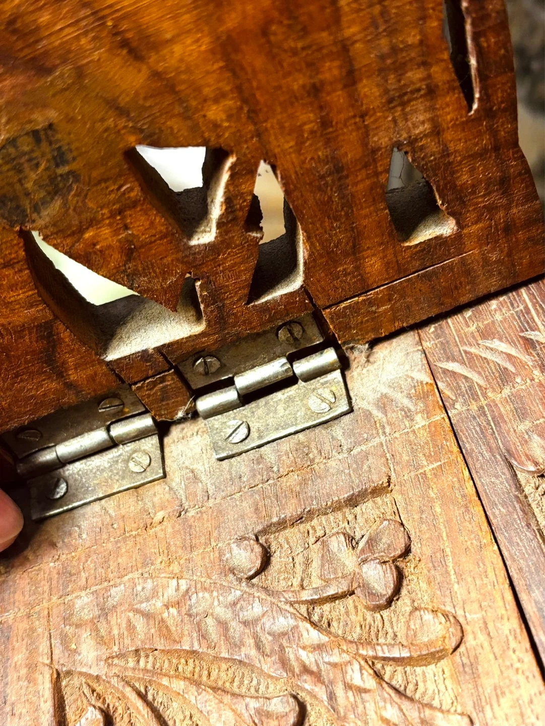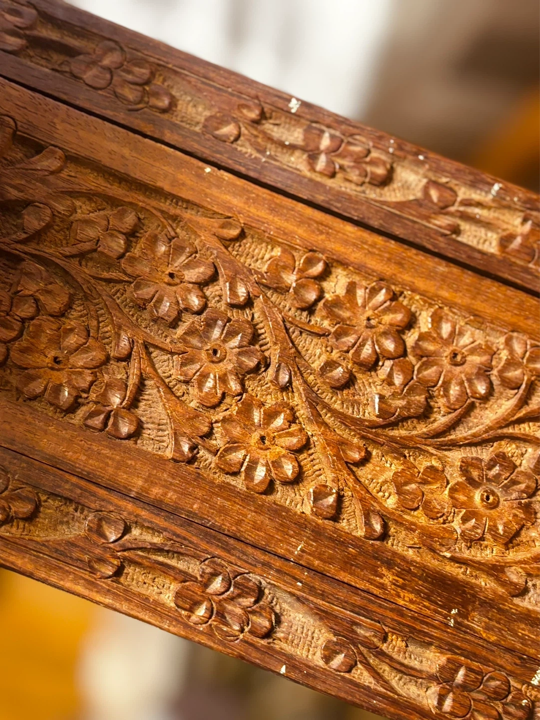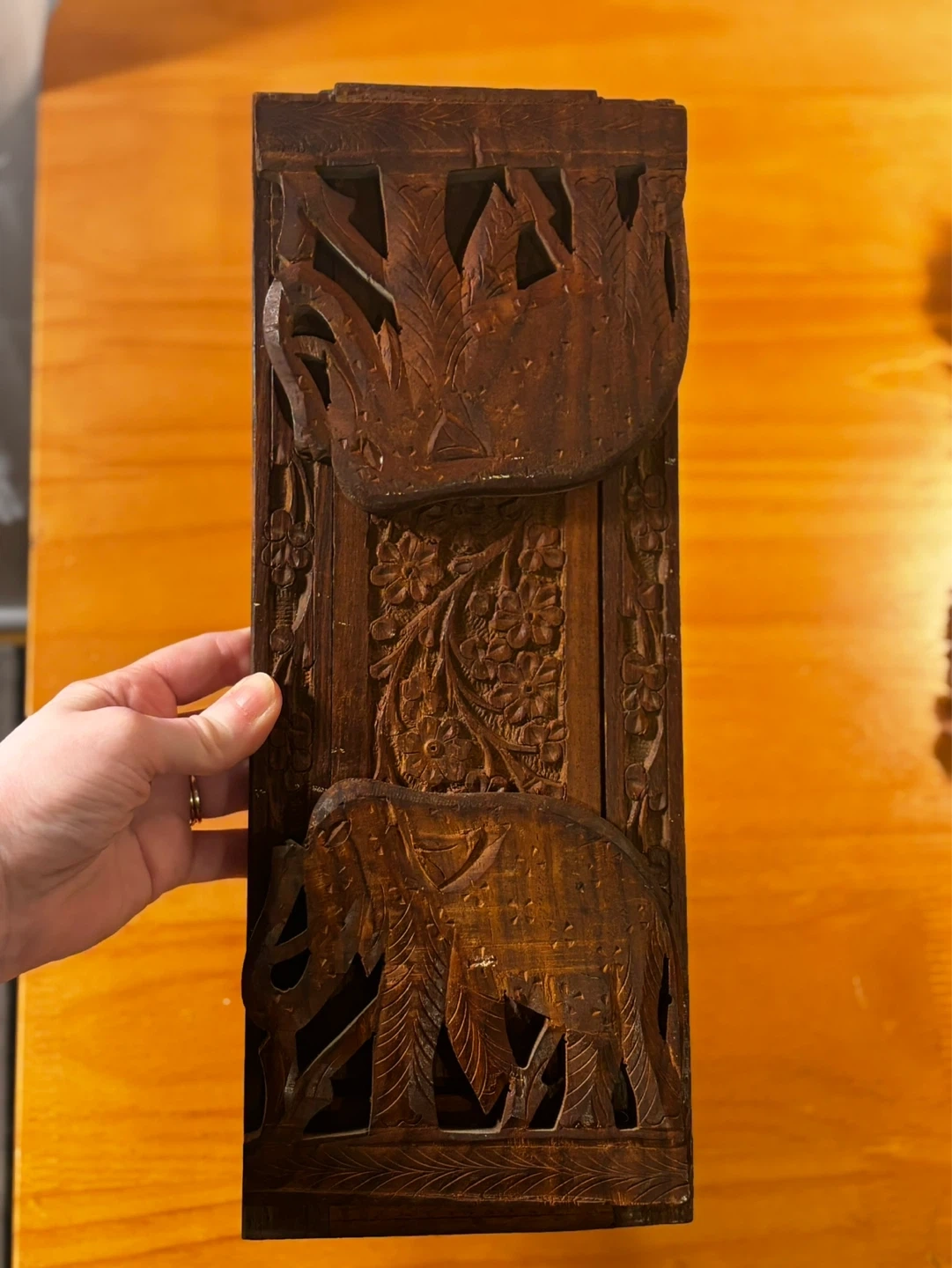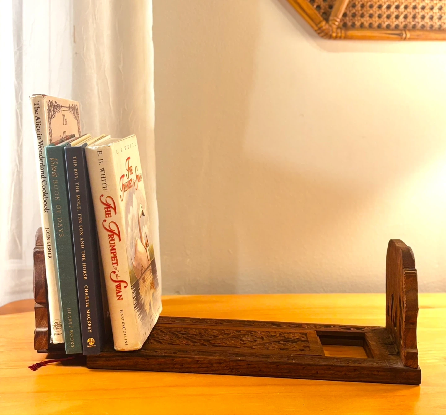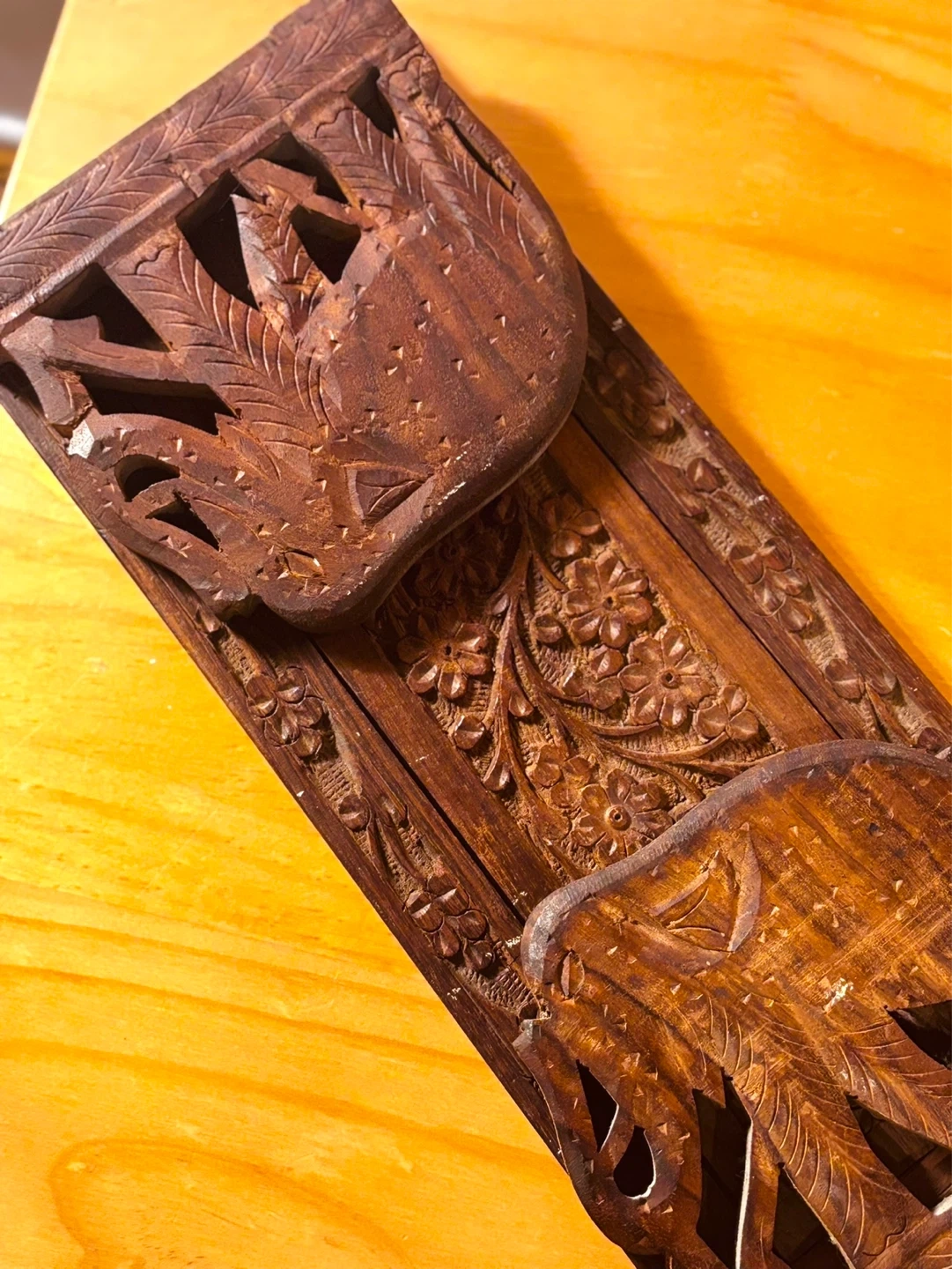 Beautifully bookends with adjustable length and intricate floral details and elephant motifs. Hand-carved wood. These'll add a unique decorative touch to any bookshelf!