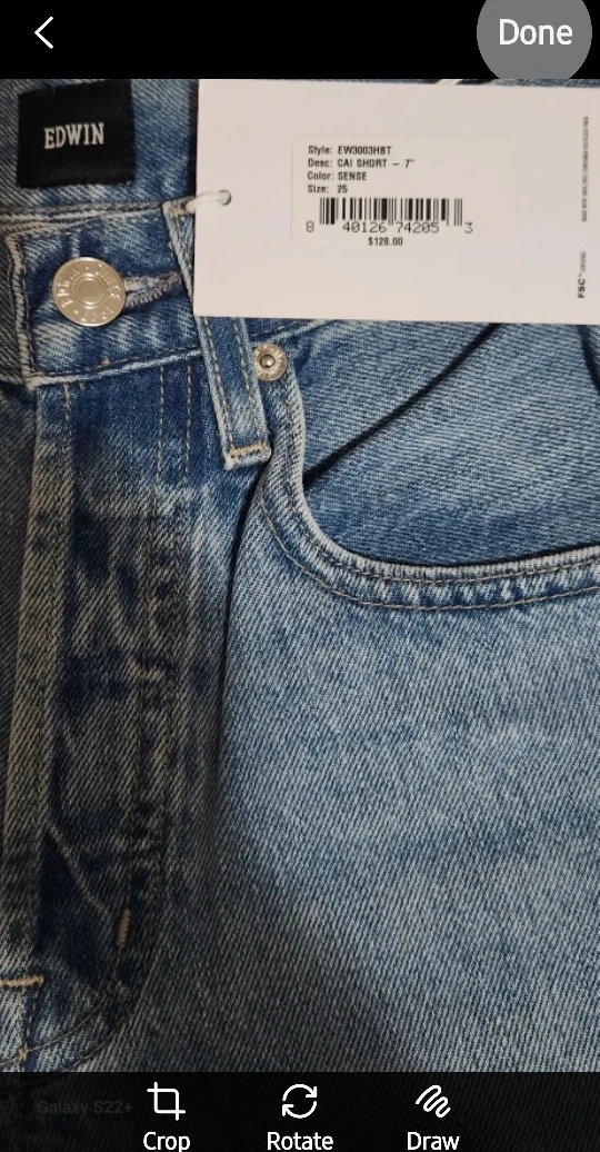 These Edwin Cai denim shorts are in great condition and ready for a new home! They're a stylish light blue wash, size 25, and have a cool, modern look. The original price was $128