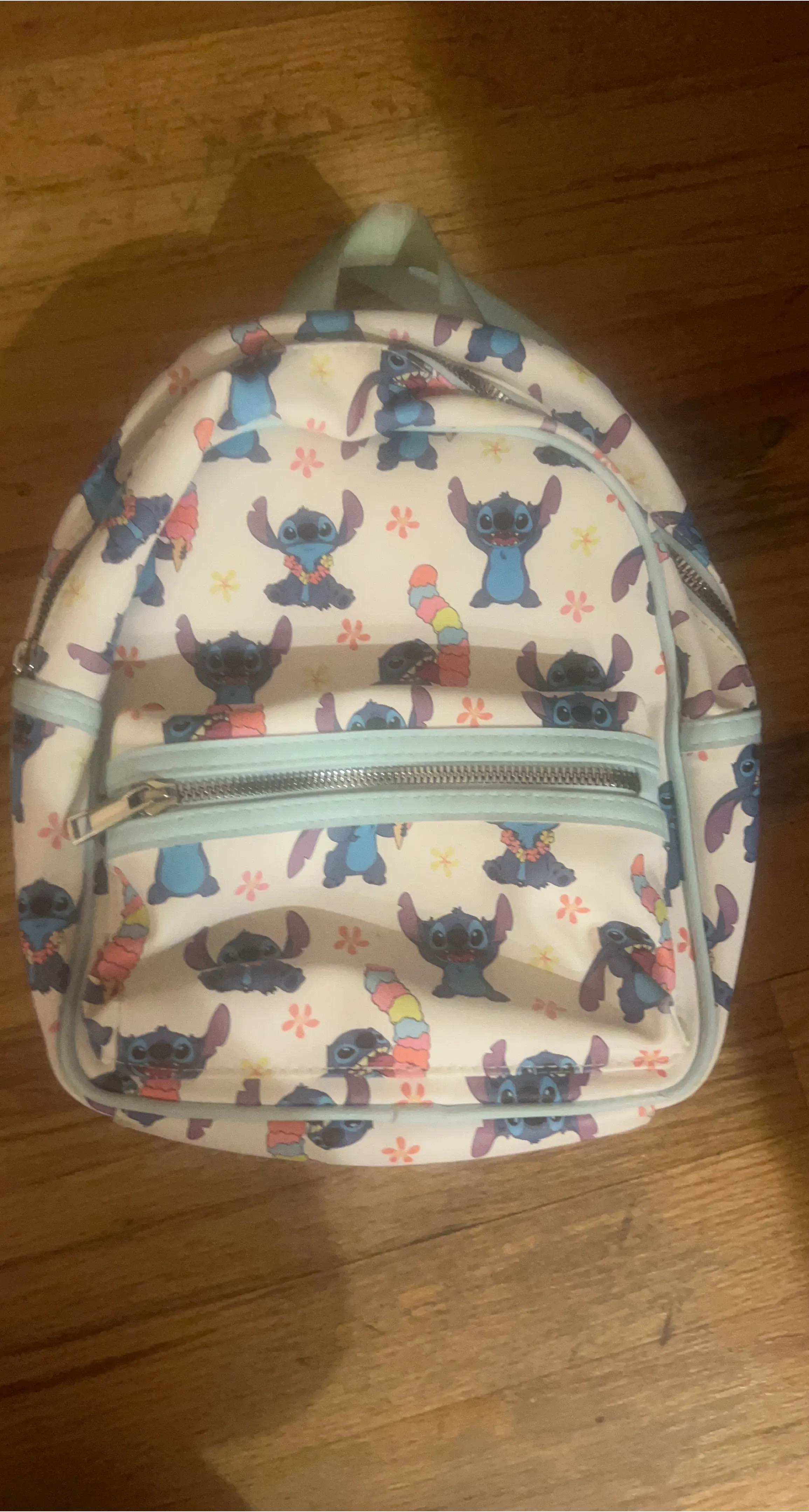 Super cute Loungefly Disney Lilo & Stitch mini backpack! The bag is white with an all-over print of Stitch and flowers. The straps and trim are a light blue color. Perfect for any Disney or Stitch fan