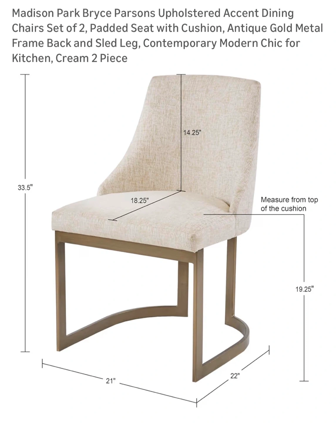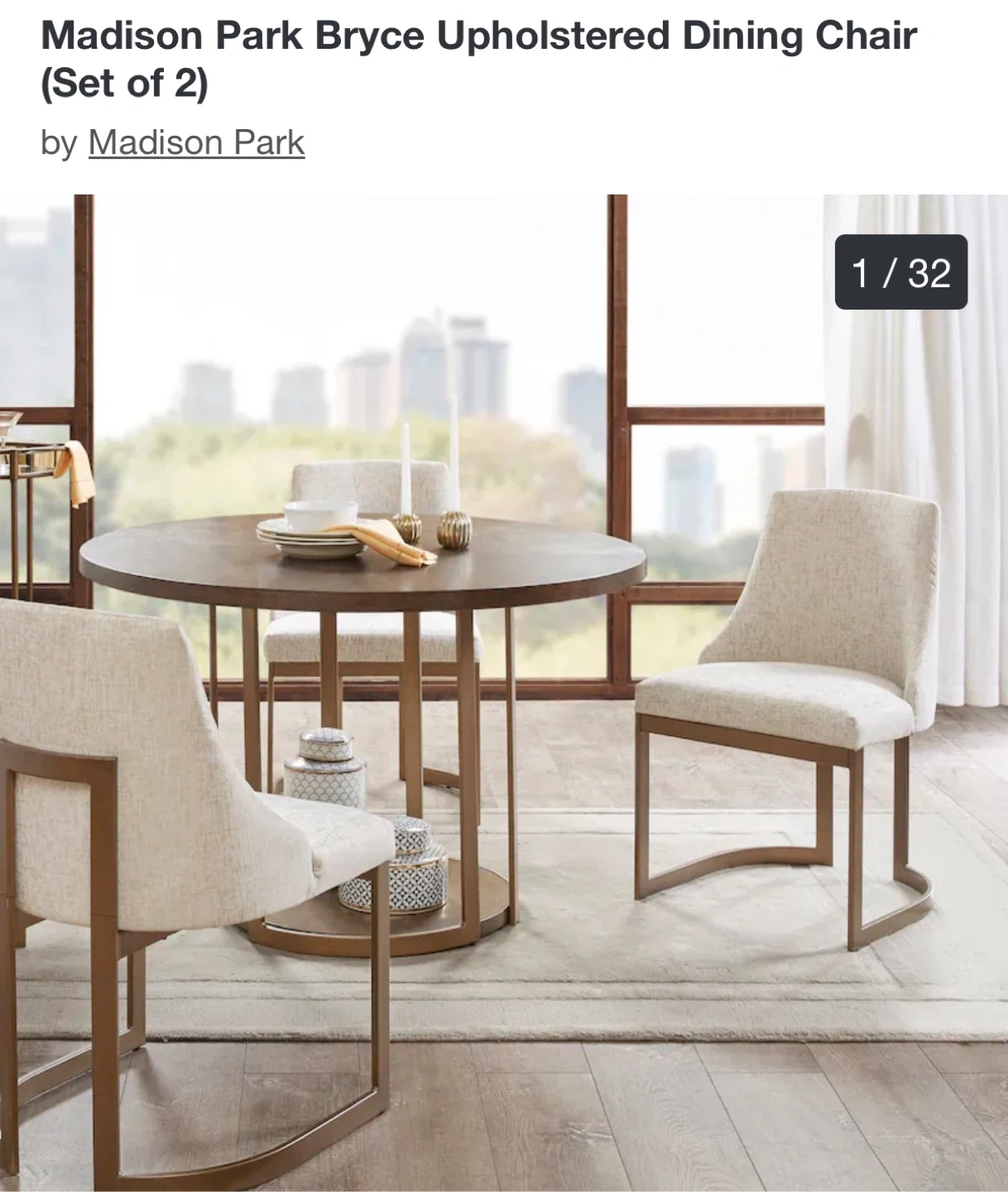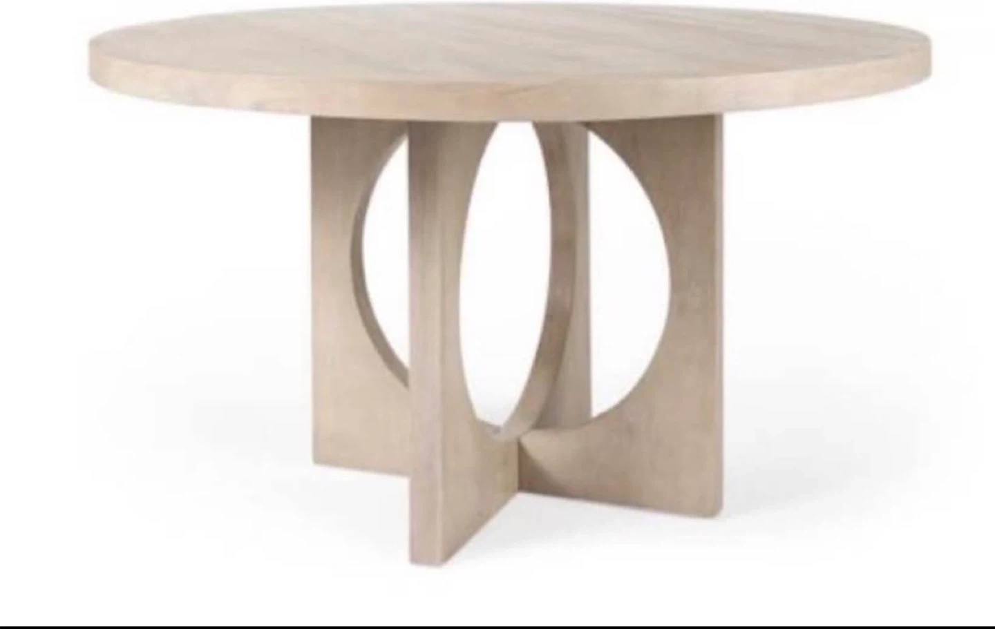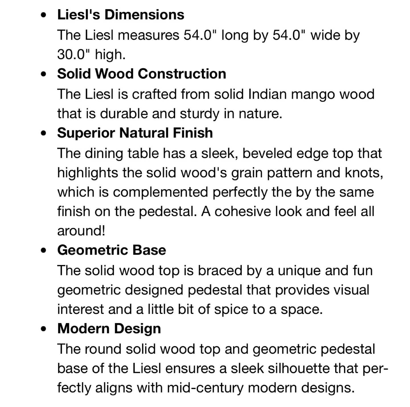 This round dining room set features a solid wood dining table with a superior natural finish. It has a unique geometric base and a modern design. The table measures 54" long by 54" wide by 30" high. Also included is 4 Madison Park Bryce dining chairs. Each chair features a sculpted, curved backrest for a modern yet timeless appeal.