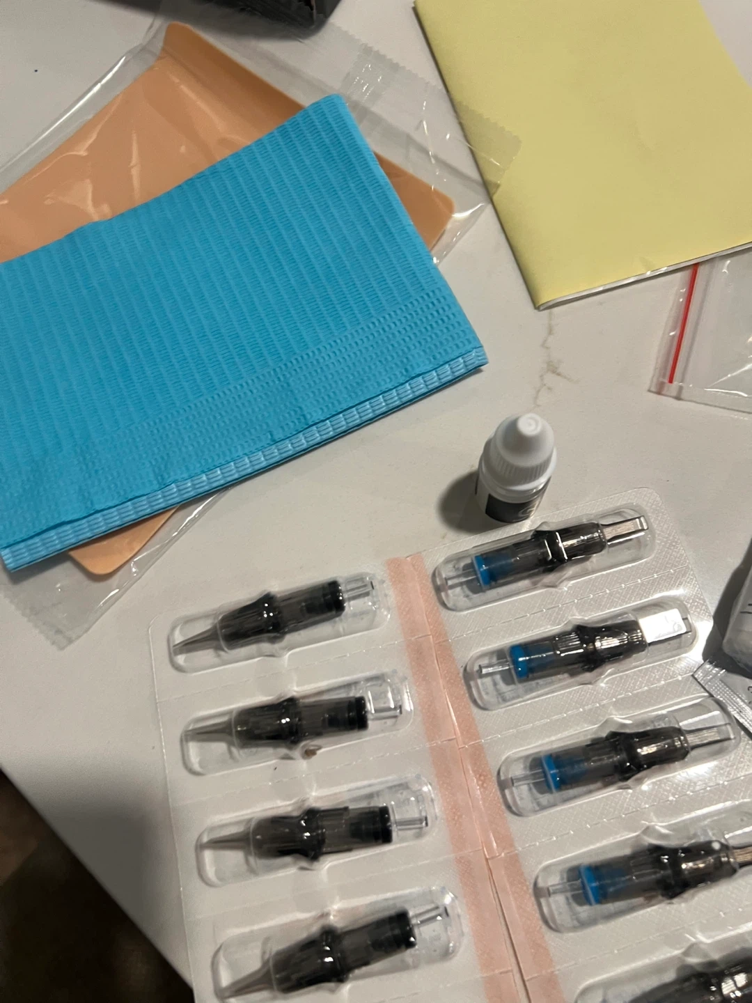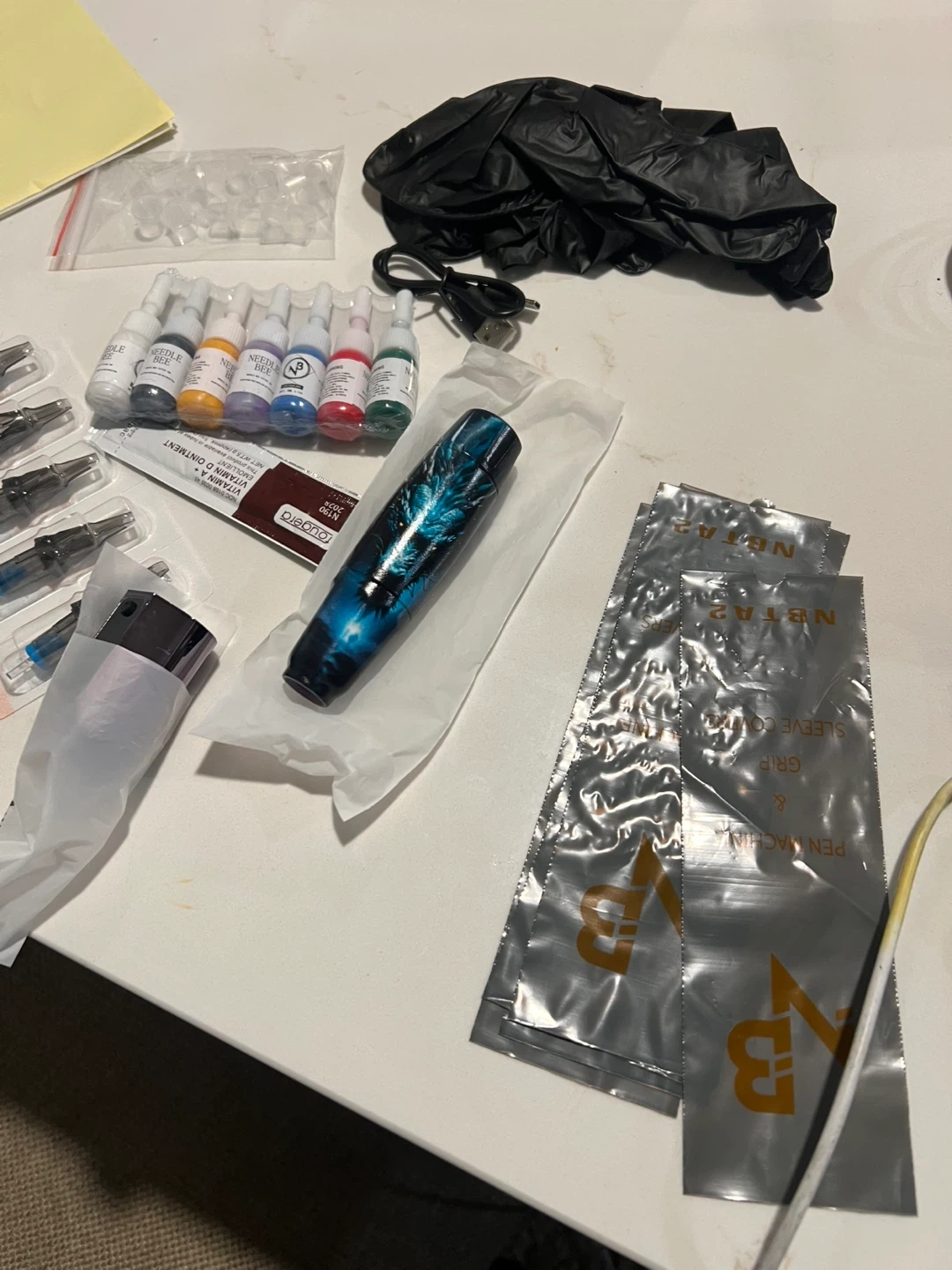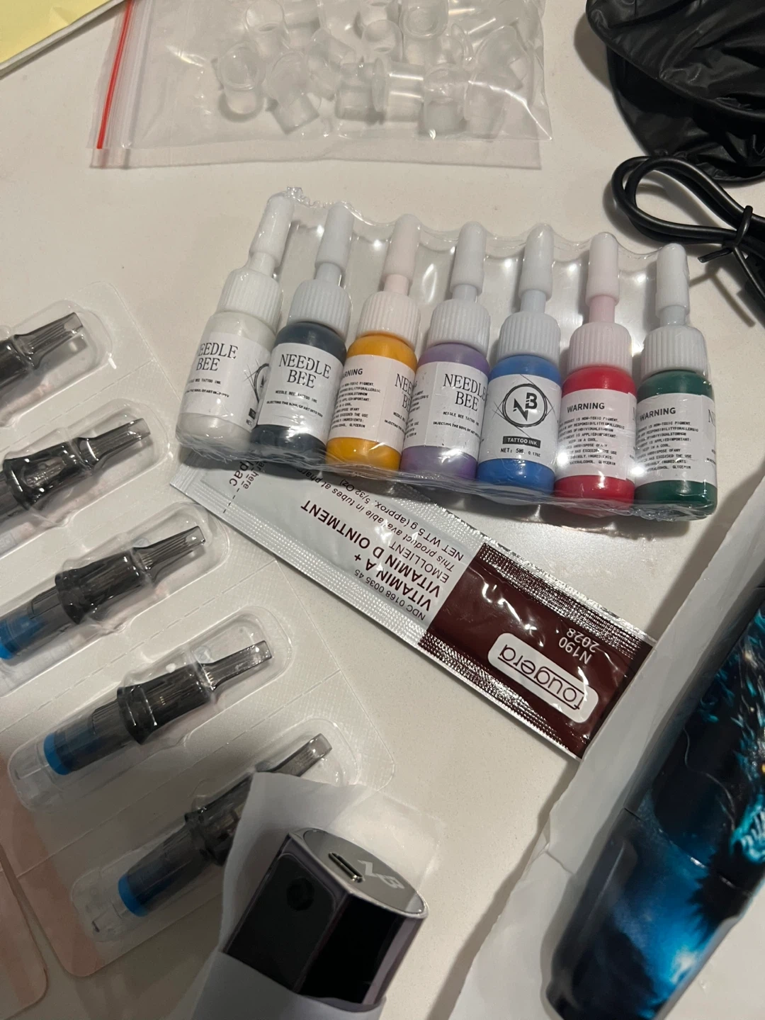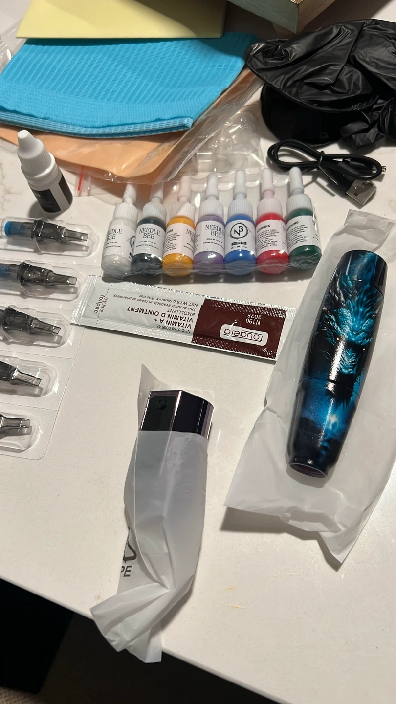 This tattoo pen machine kit includes a pen, multiple ink bottles, and various needles. It also comes with gloves and vitamin A+D ointment for aftercare. All components are neatly organized for use. Full kit brand new