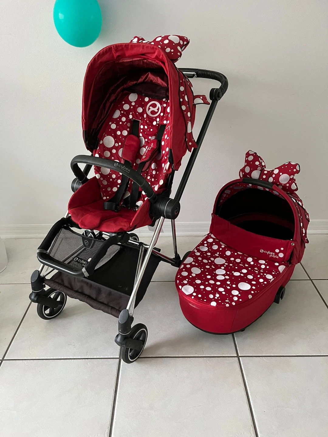 Selling a Cybex Mios stroller in the adorable Minnie Mouse edition! It's red with white polka dots and features a cute bow. This stroller comes with both the stroller seat and the bassinet attachment, so it's perfect from newborn to toddler age. The stroller is in great condition and ready for a new home!