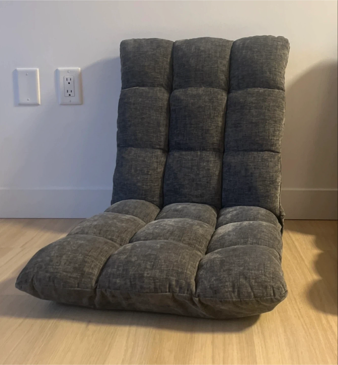 This is a gray adjustable floor chair. It's perfect for relaxing and lounging around! The chair is in great condition and ready for a new home. Can adjust the backrest from 90 degrees to 180 degrees.