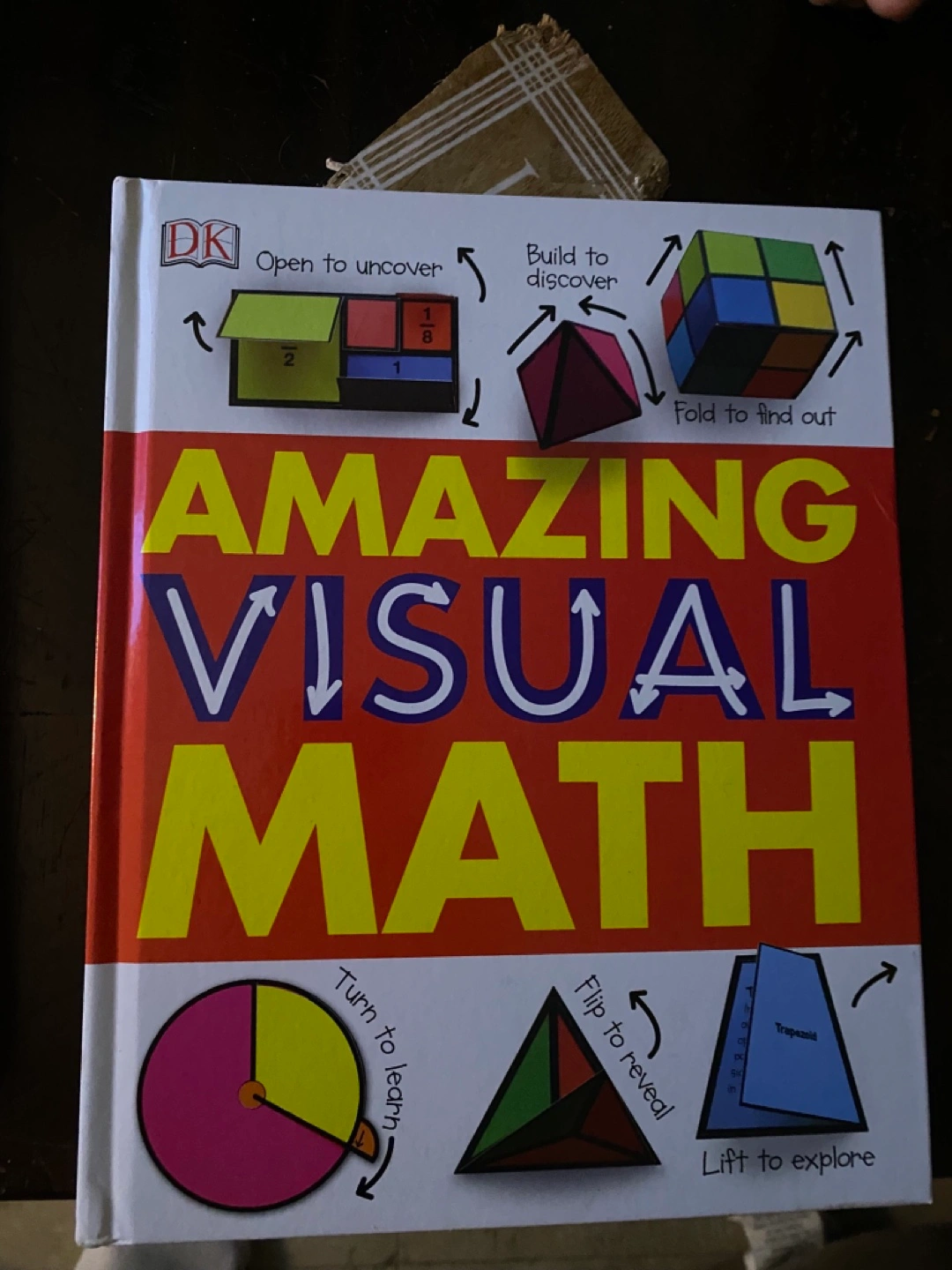 Three children's books. The Ultimate Construction Site Book by Anne-Sophie Baumann and Didier Balicevic features flaps, pop-ups, and pull tabs. Where's Waldo? by Martin Handford. Amazing Visual Math by DK.