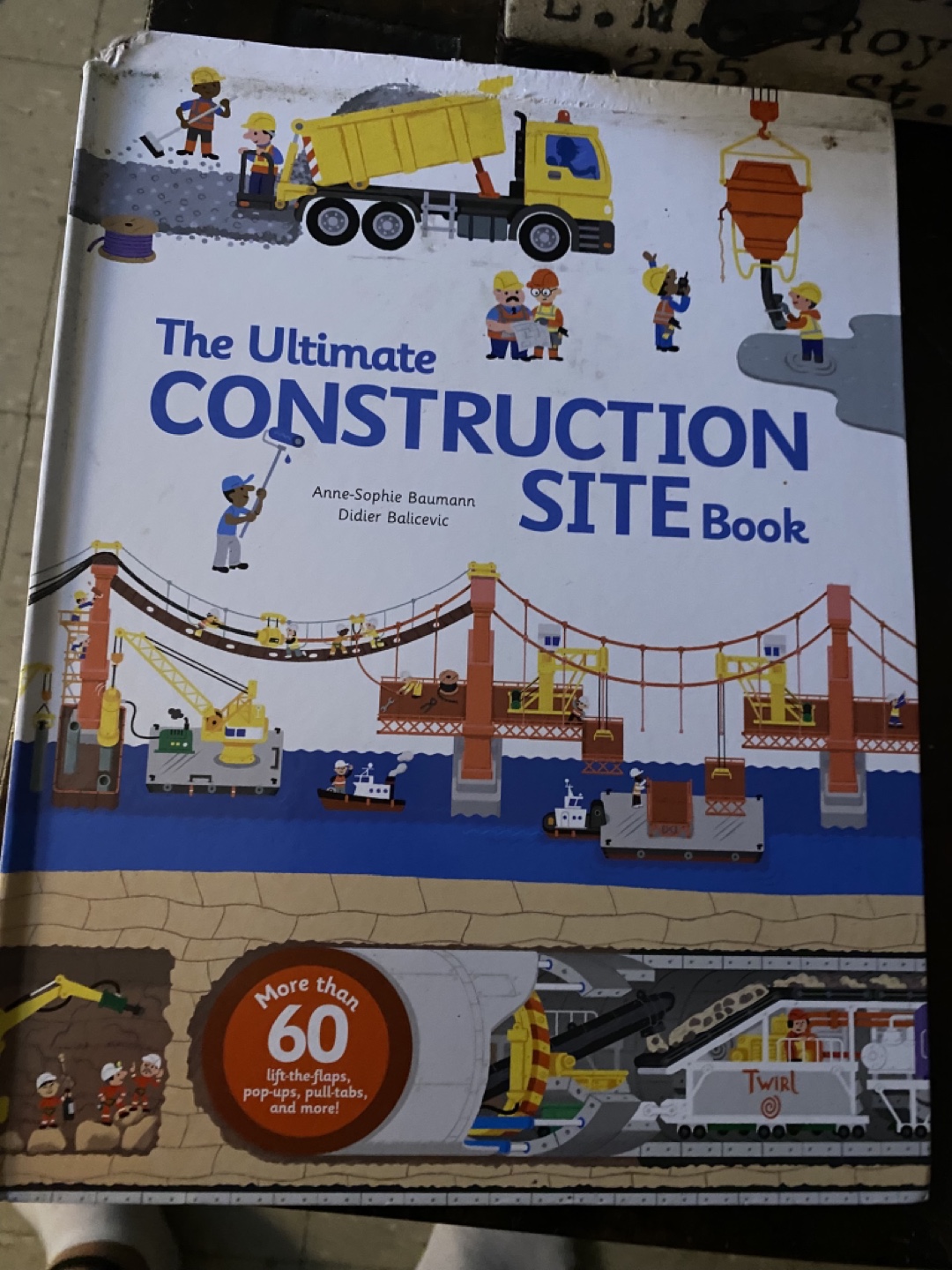 Three children's books. The Ultimate Construction Site Book by Anne-Sophie Baumann and Didier Balicevic features flaps, pop-ups, and pull tabs. Where's Waldo? by Martin Handford. Amazing Visual Math by DK.