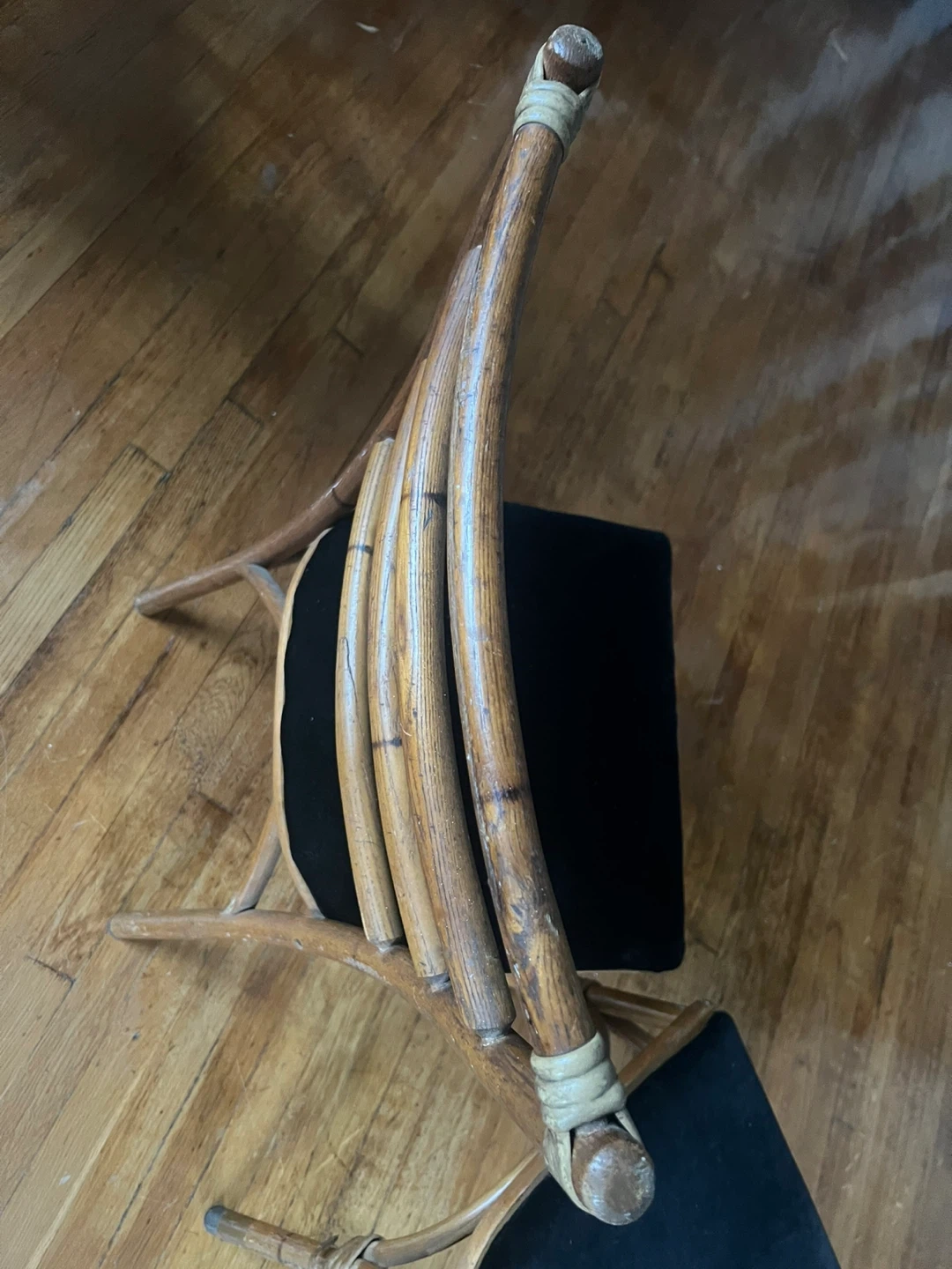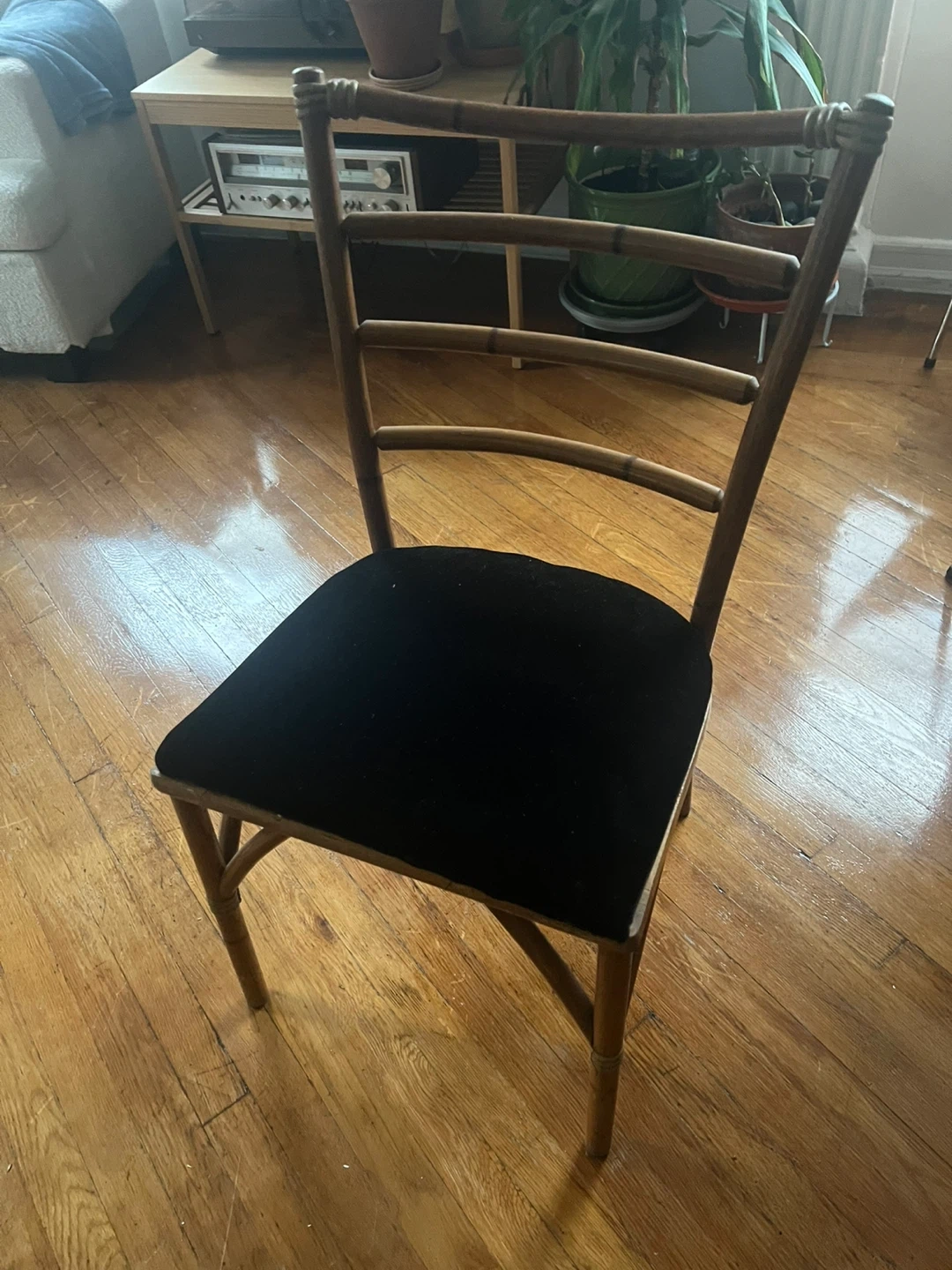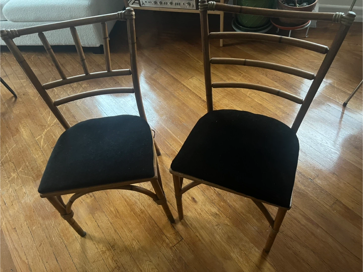 Selling a set of two bamboo chairs. They have a unique look with a black velvet seat. They are in good condition and would be a nice addition to any room!