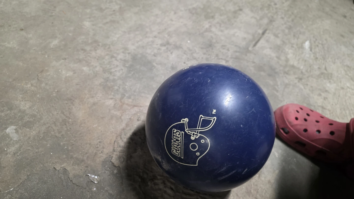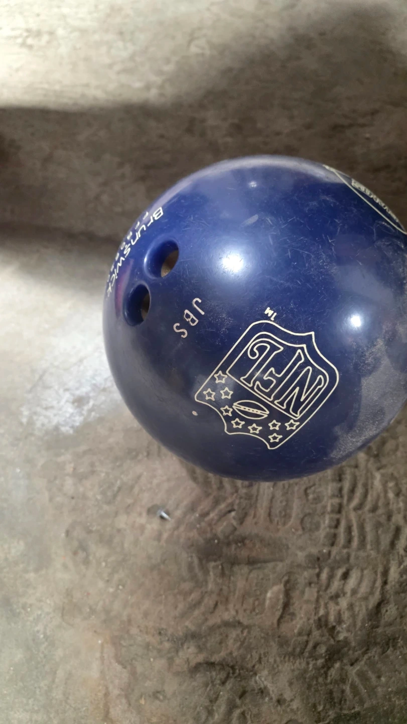 This is a dark blue Brunswick bowling ball featuring the NFL logo and a "Giants" helmet graphic. It has three finger holes. It's great for any football or bowling enthusiast!
