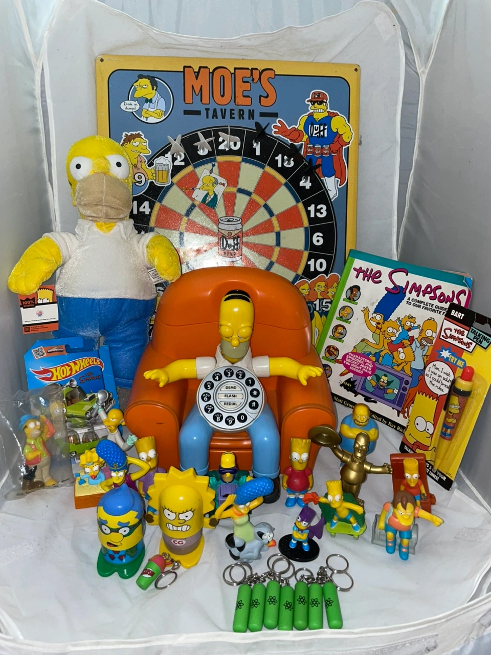 HOMER SIMPSON house phone talking ringtones. Moe’s Tavern magnetic dartboard.The Simpsons complete guide to our favorite family. New Homer Simpson 12”nanco plush. New Hot wheels the homer, New Simpsons talking Bart pen 16 simpsons toys mixed characters. 8 keychains. Total 30 pieces.