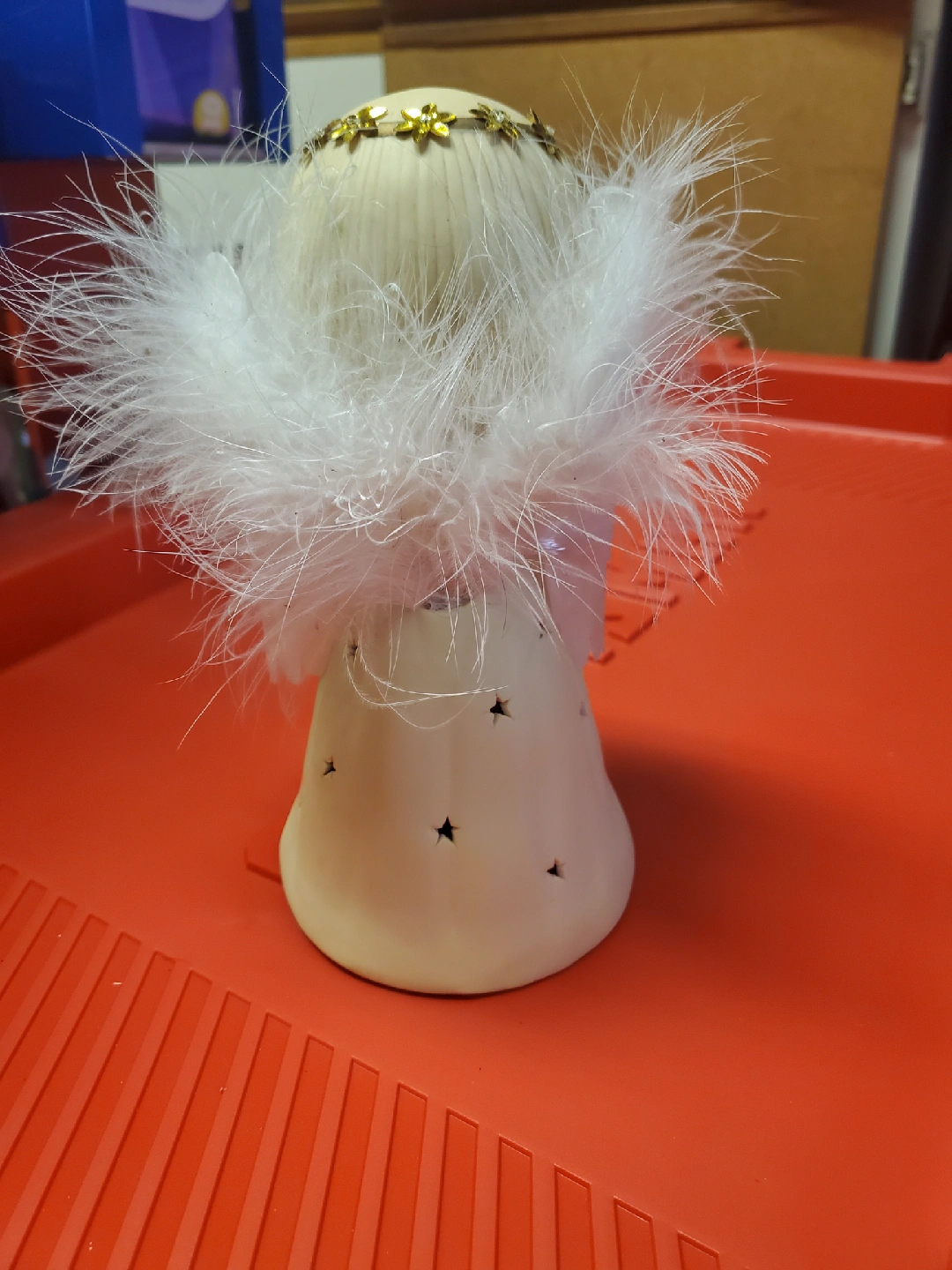 This is a beautiful angel figurine. It has a cream color with stars on the dress and a gold crown. The wings are made of feathers. also lights up.