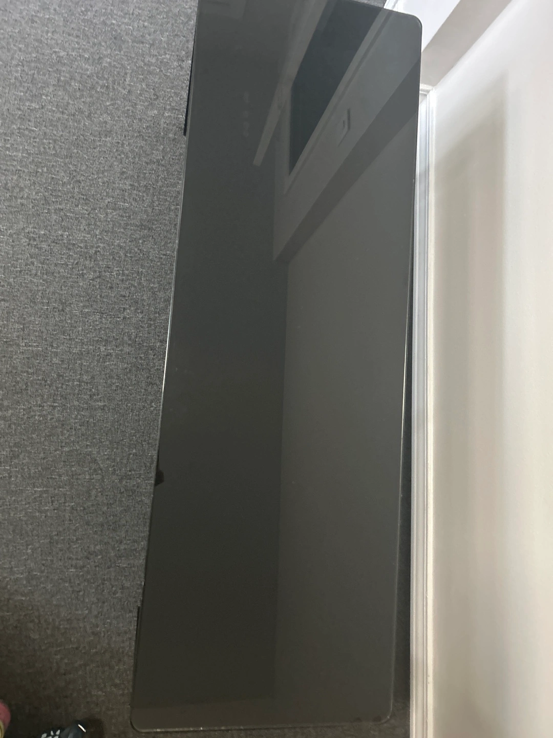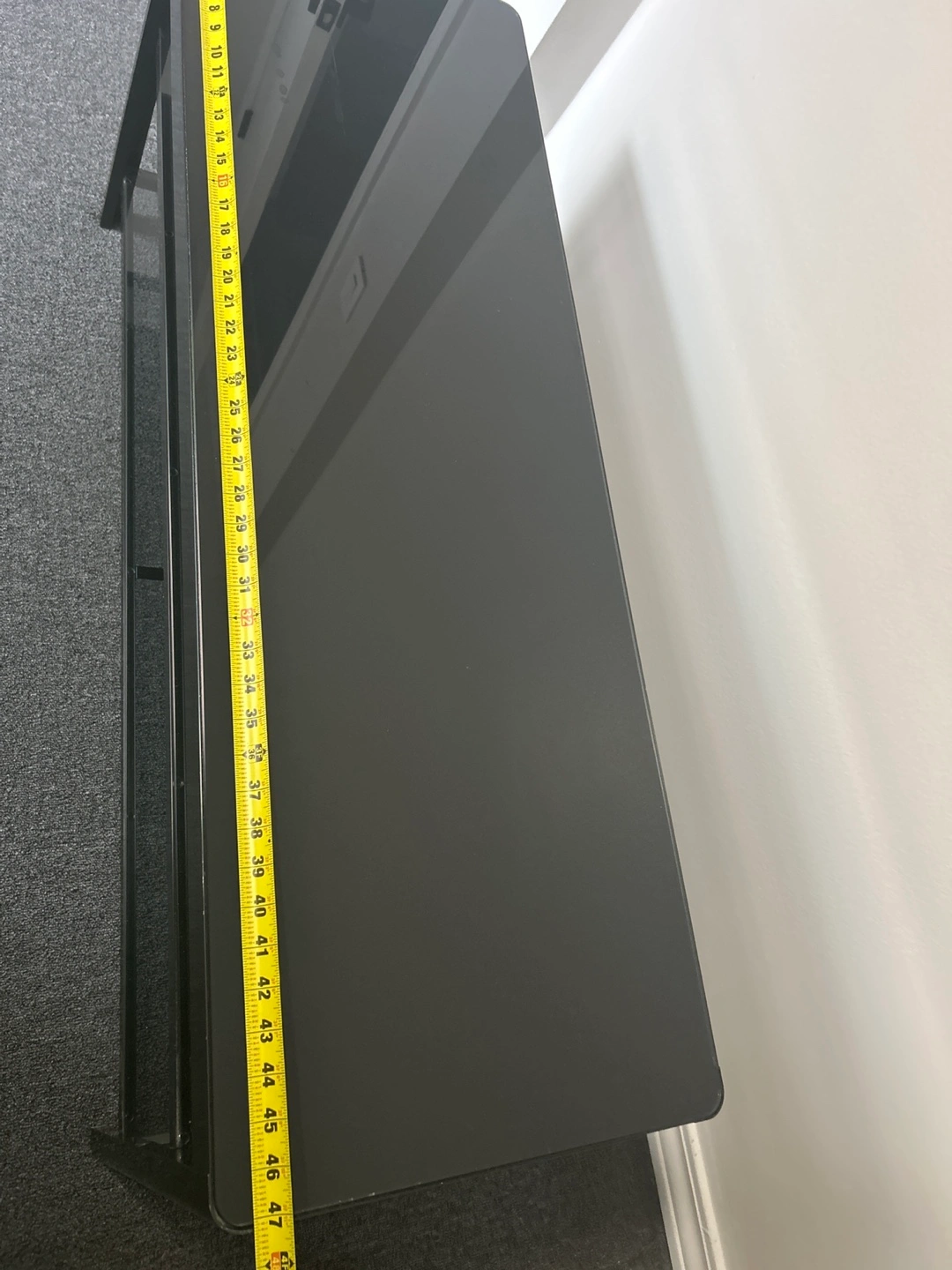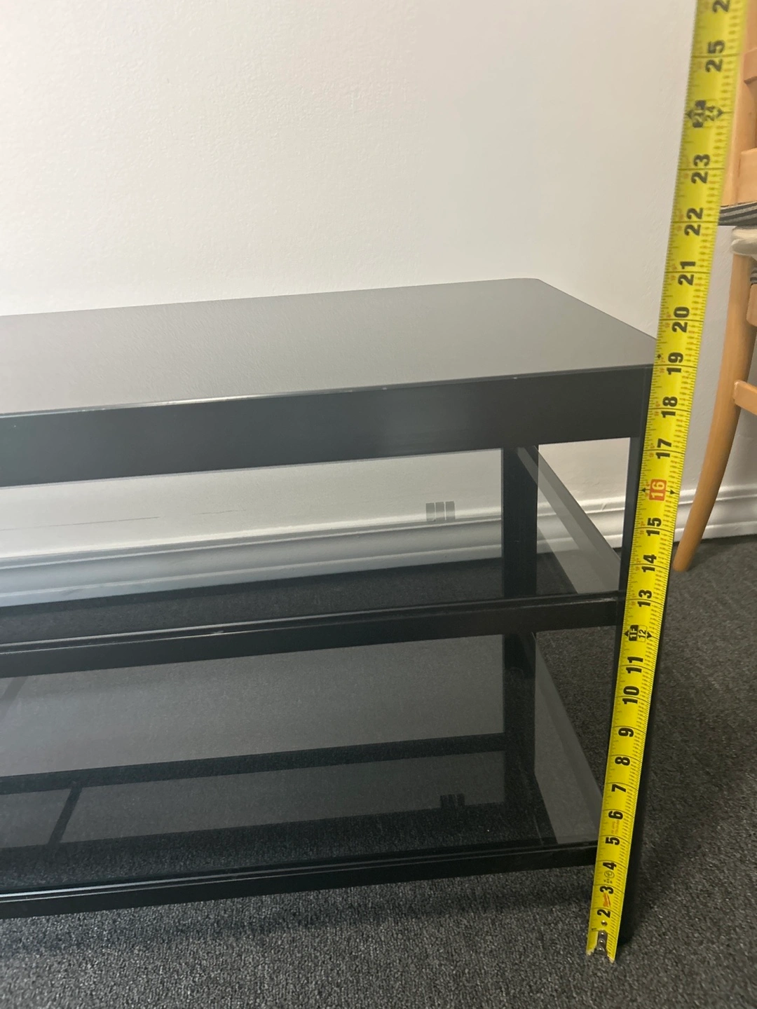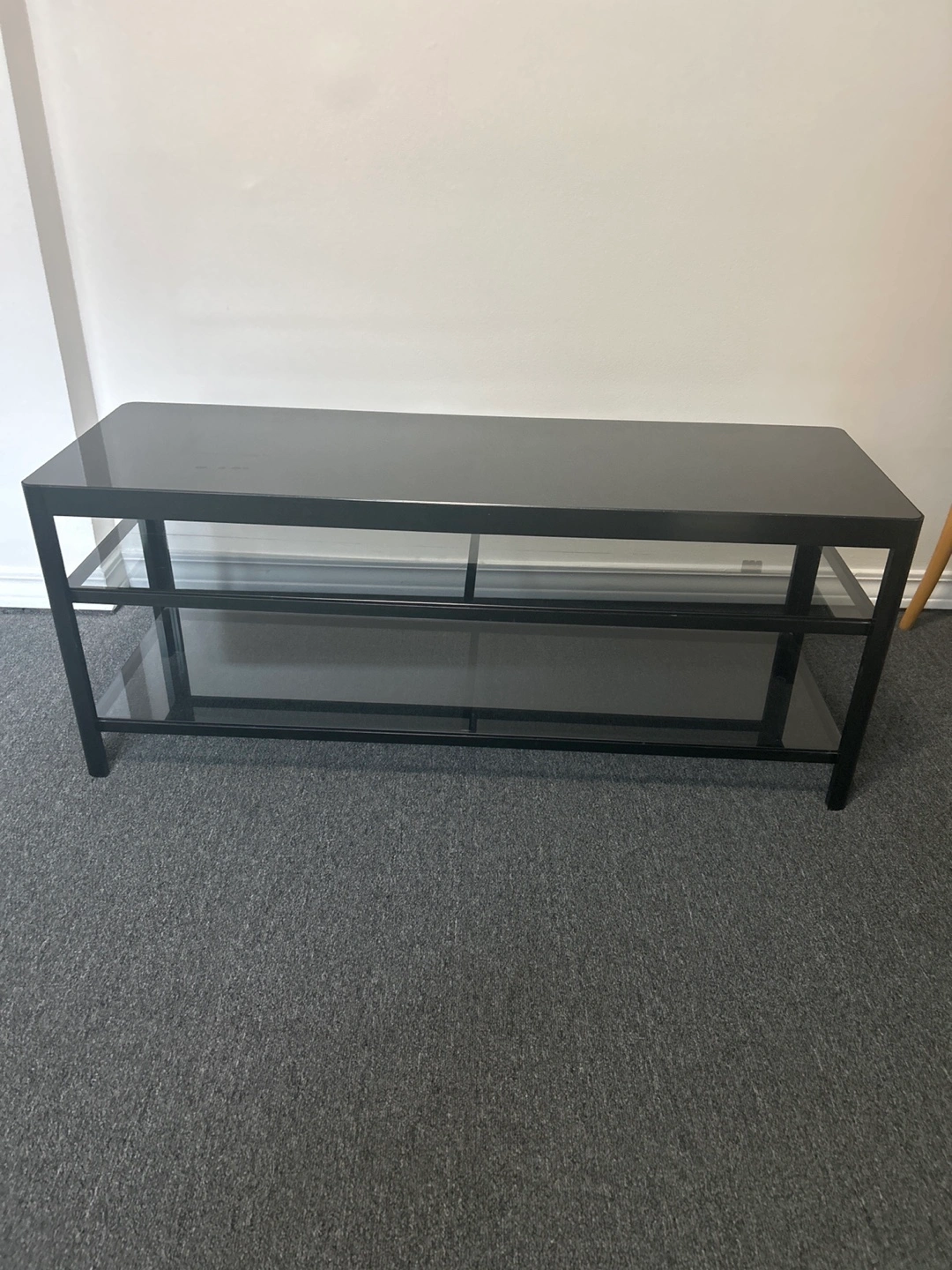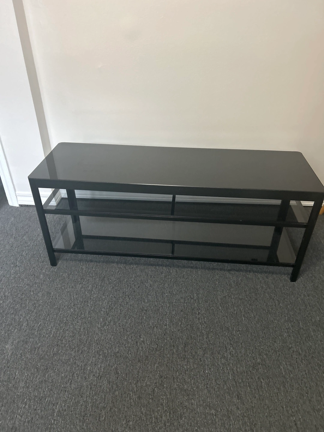 Selling a sleek black TV stand! It measures approximately 47 inches in width and has a modern design with glass shelves. Perfect for your living room or entertainment area
