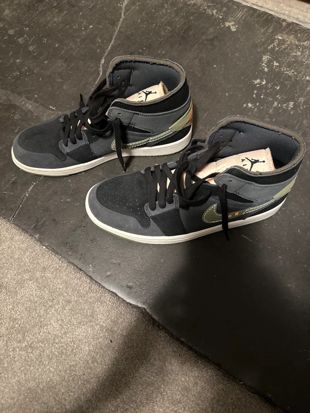 Classic Air Jordan 1 Mid sneakers in black and gray. Features a durable suede and synthetic upper with a comfortable rubber sole. These are mid-top athletic shoes.