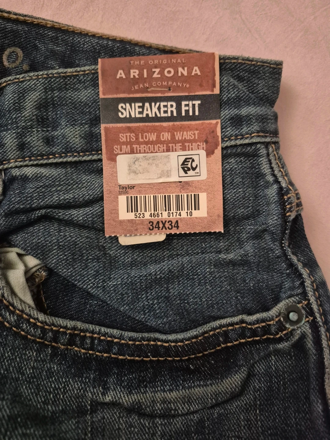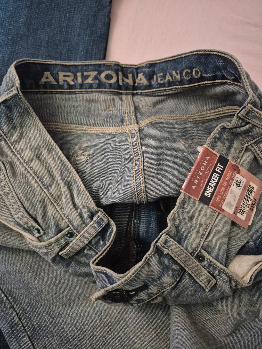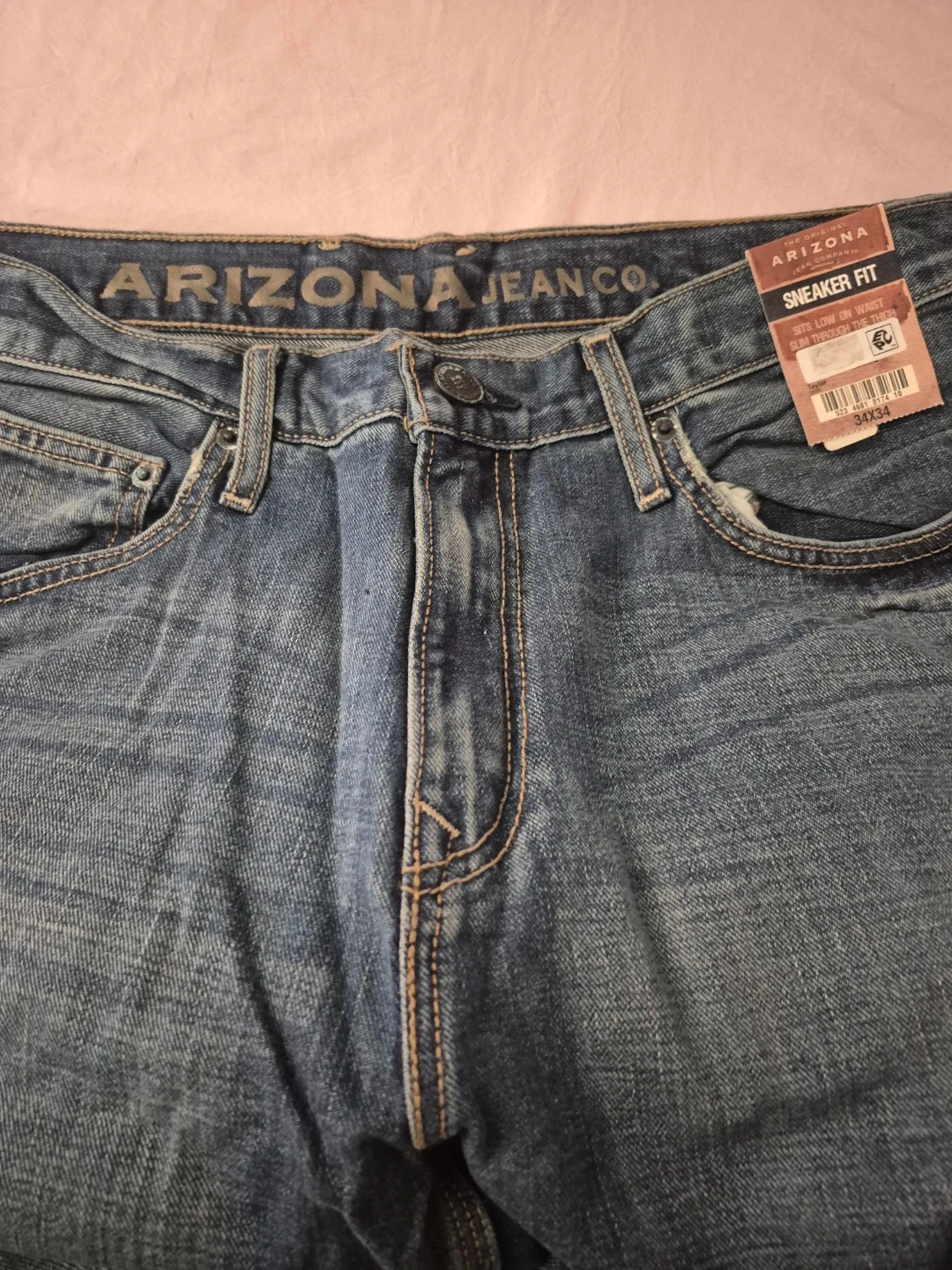 Arizona Jean Company men's sneaker fit jeans. Sits low on waist, slim through the thigh. Size 34x34. Classic denim material.