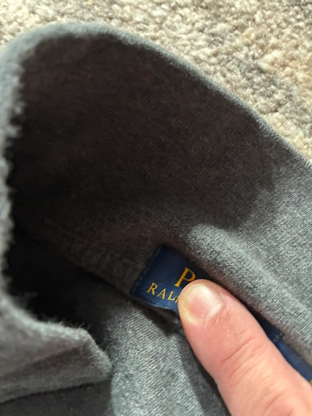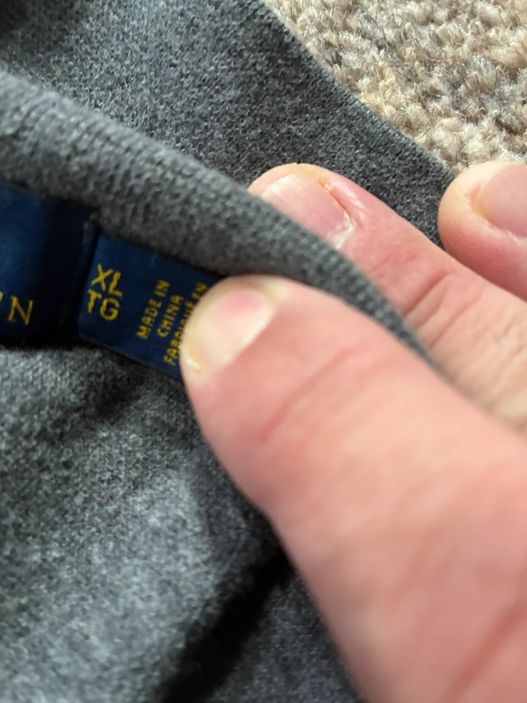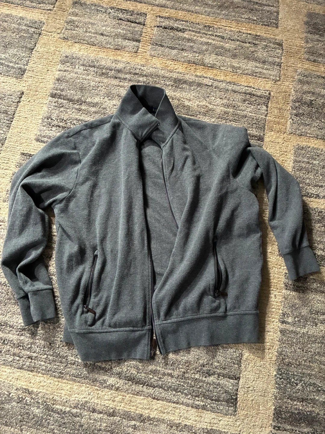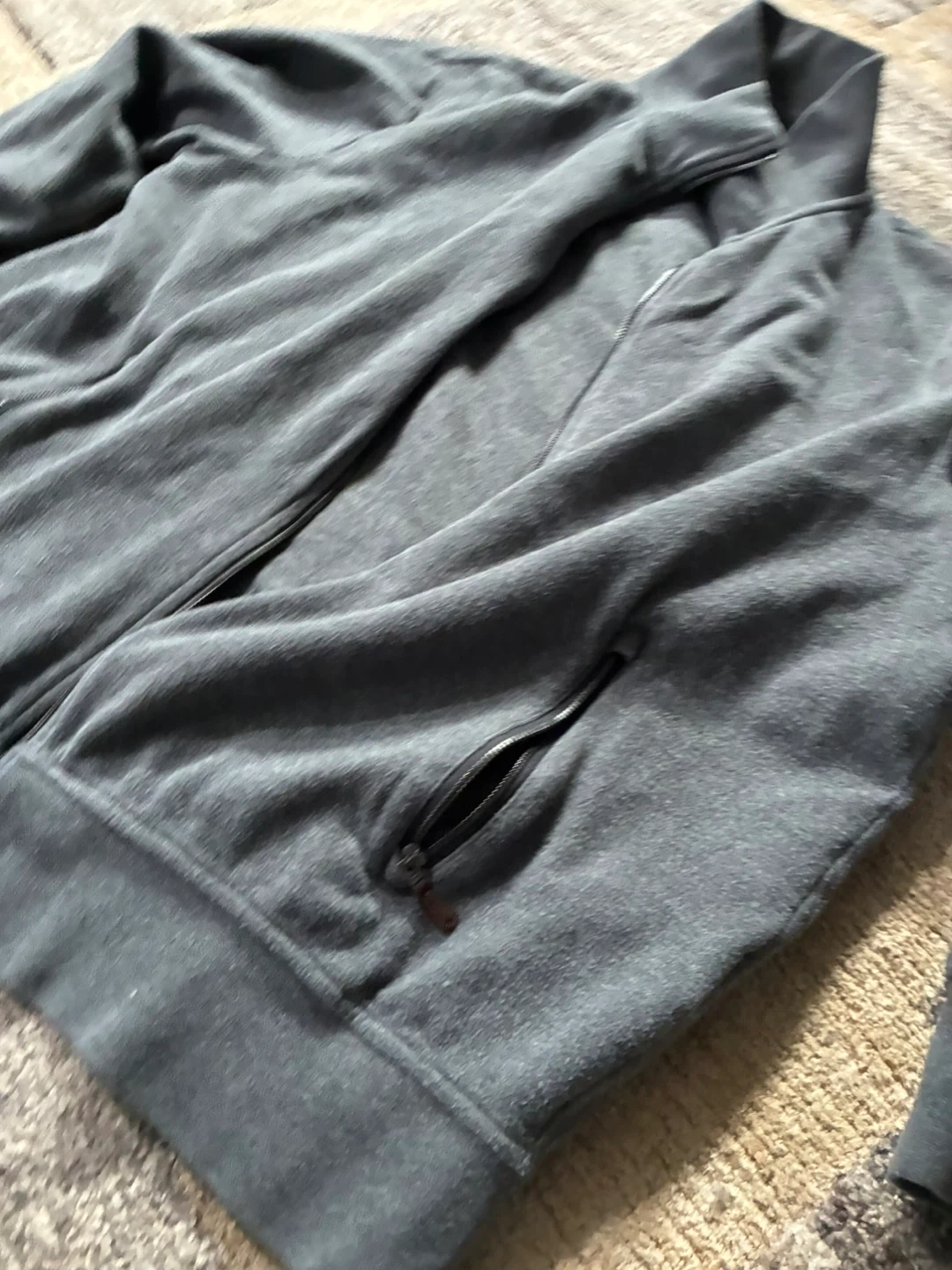 Gray Polo Ralph Lauren full zip track jacket. Size XL. It's made of a soft fabric and has zippered pockets.
