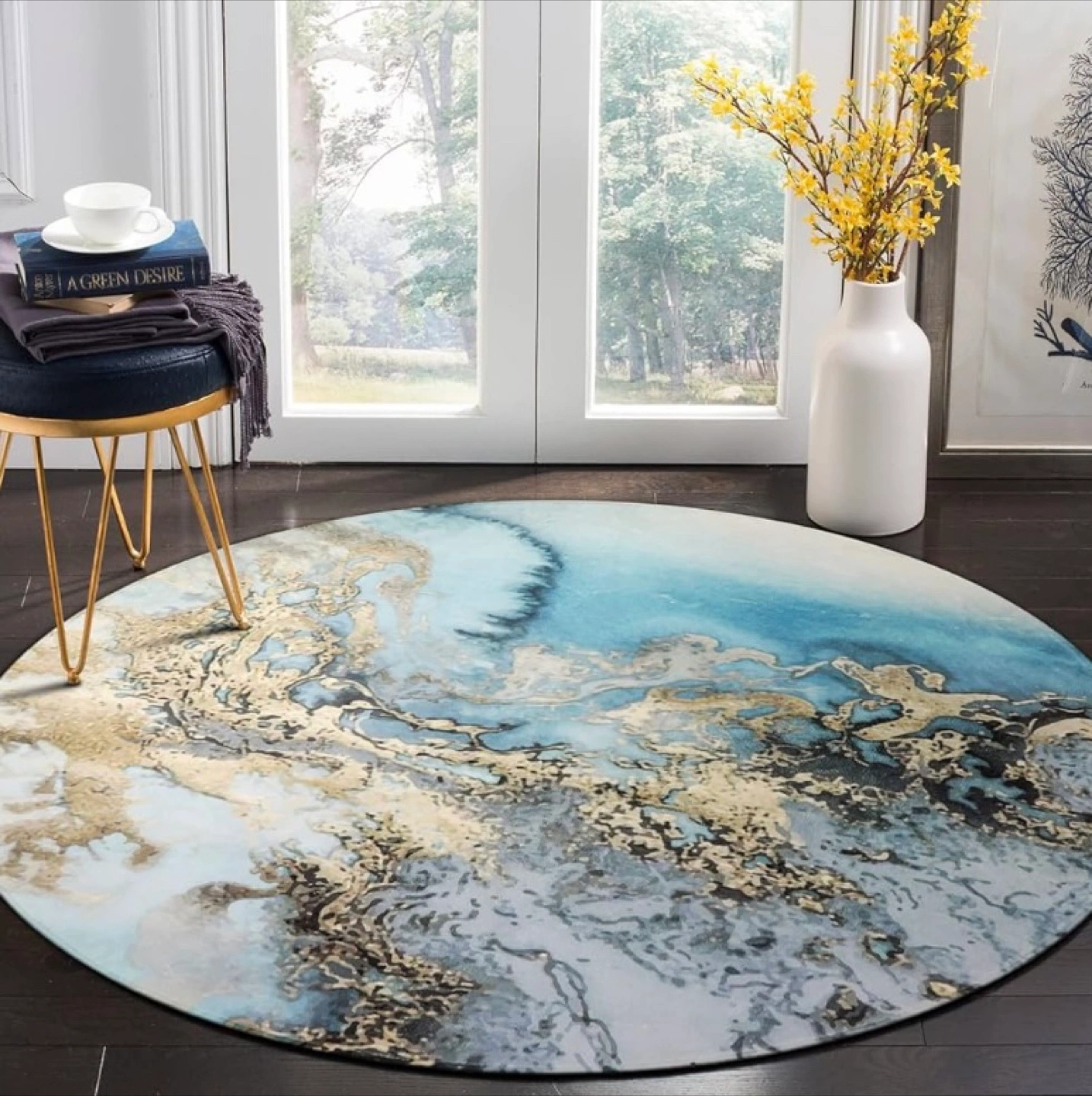 A round rug with a striking blue and gold marble design. A beautiful addition for any room. Imagine relaxing by the fireplace, feeling the soft texture of this rug under your feet.