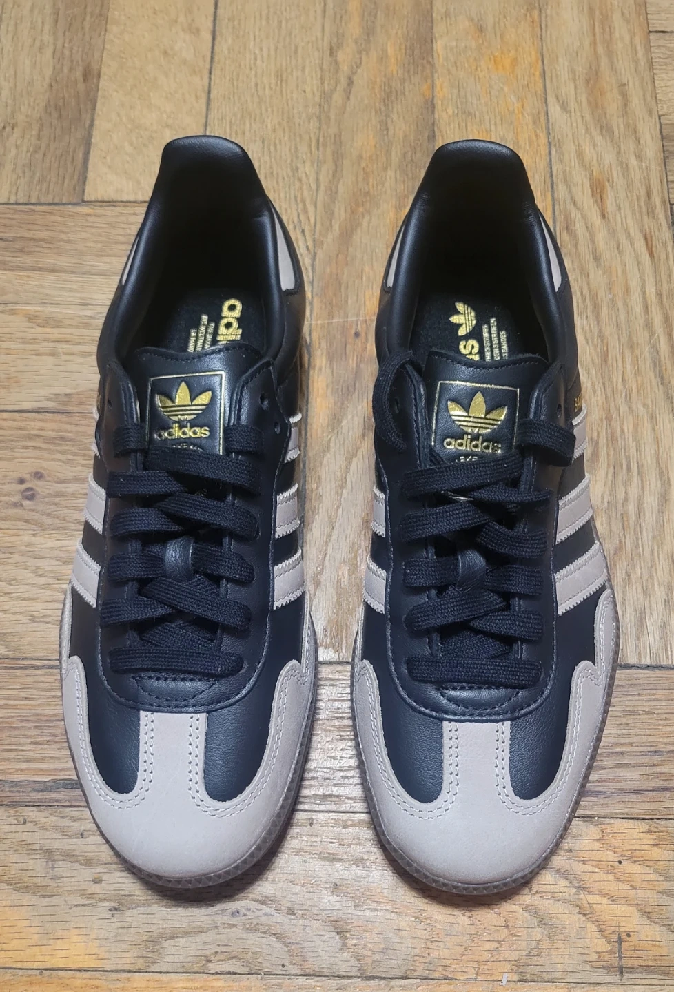 Classic Adidas Samba sneakers in a black and tan colorway. US Men's size 9. Leather upper with rubber sole.