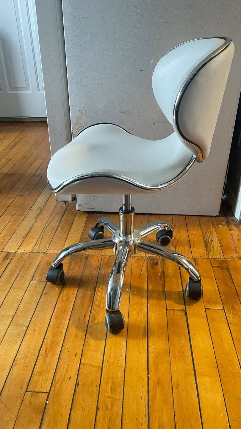 Selling a white saddle stool chair. It features a unique ergonomic design with a saddle-shaped seat for comfort. The chair has a chrome base with rolling casters for easy movement. Perfect for a home office or salon setting! Used for a few months but very well taken care of