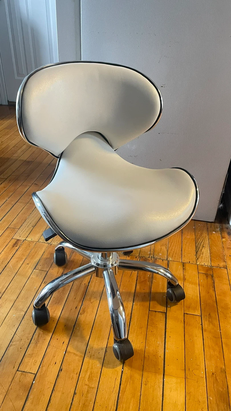 Selling a white saddle stool chair. It features a unique ergonomic design with a saddle-shaped seat for comfort. The chair has a chrome base with rolling casters for easy movement. Perfect for a home office or salon setting! Used for a few months but very well taken care of