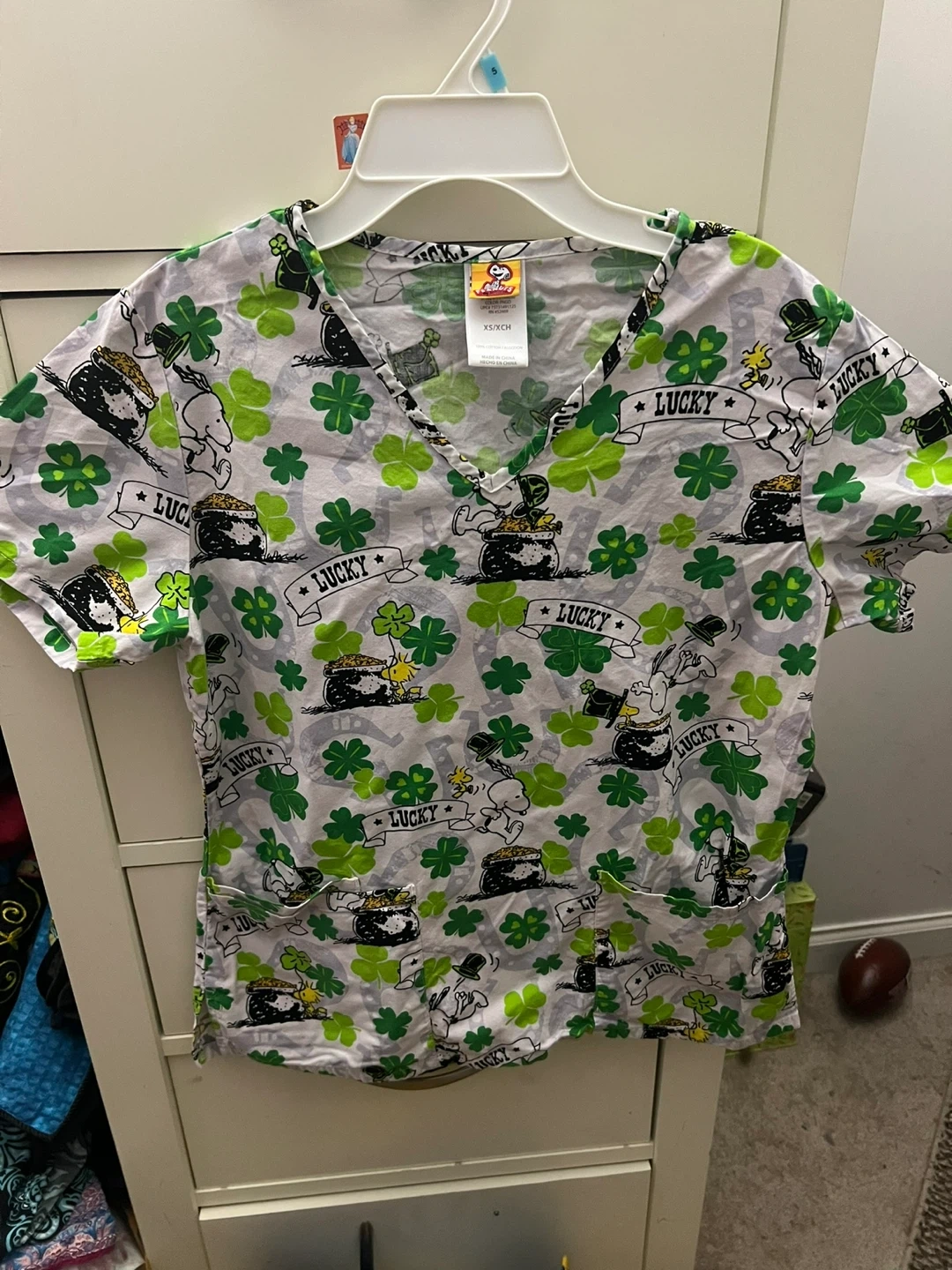 This Peanuts scrub top features a fun St. Patrick's Day print with Snoopy and Woodstock. It's a size XS/CH and has a V-neck with two front pockets. Great for adding some festive flair to your work attire!