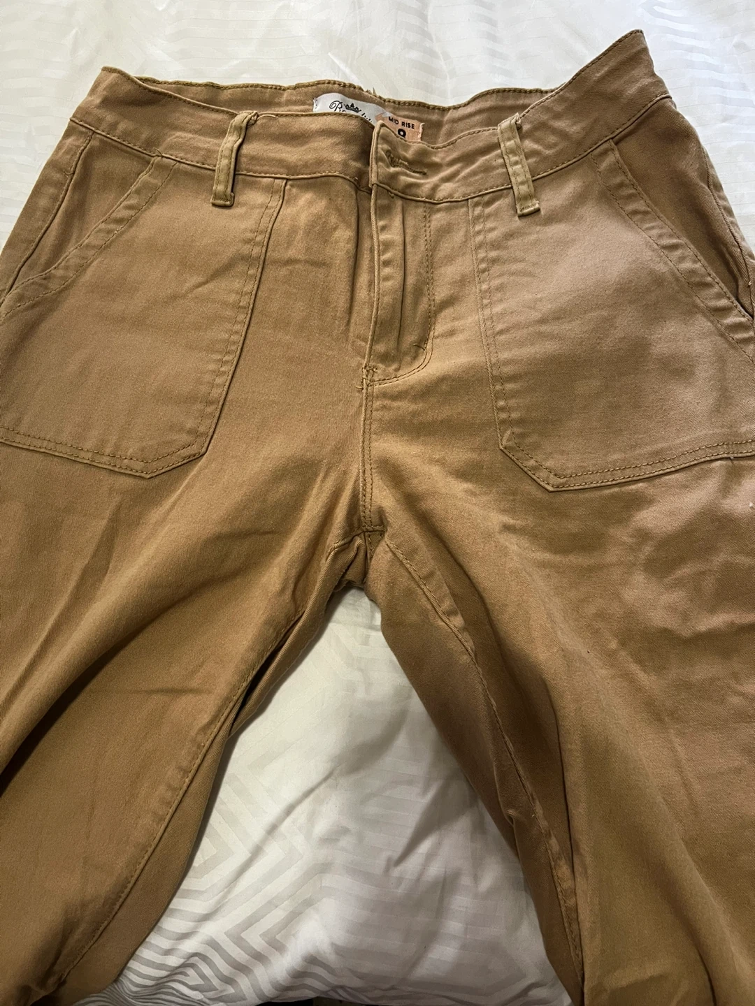 These Poppy & Bloom cargo pants are a size 9 in a tan color. They have a mid-rise fit and multiple pockets. The material is a soft cotton blend.
