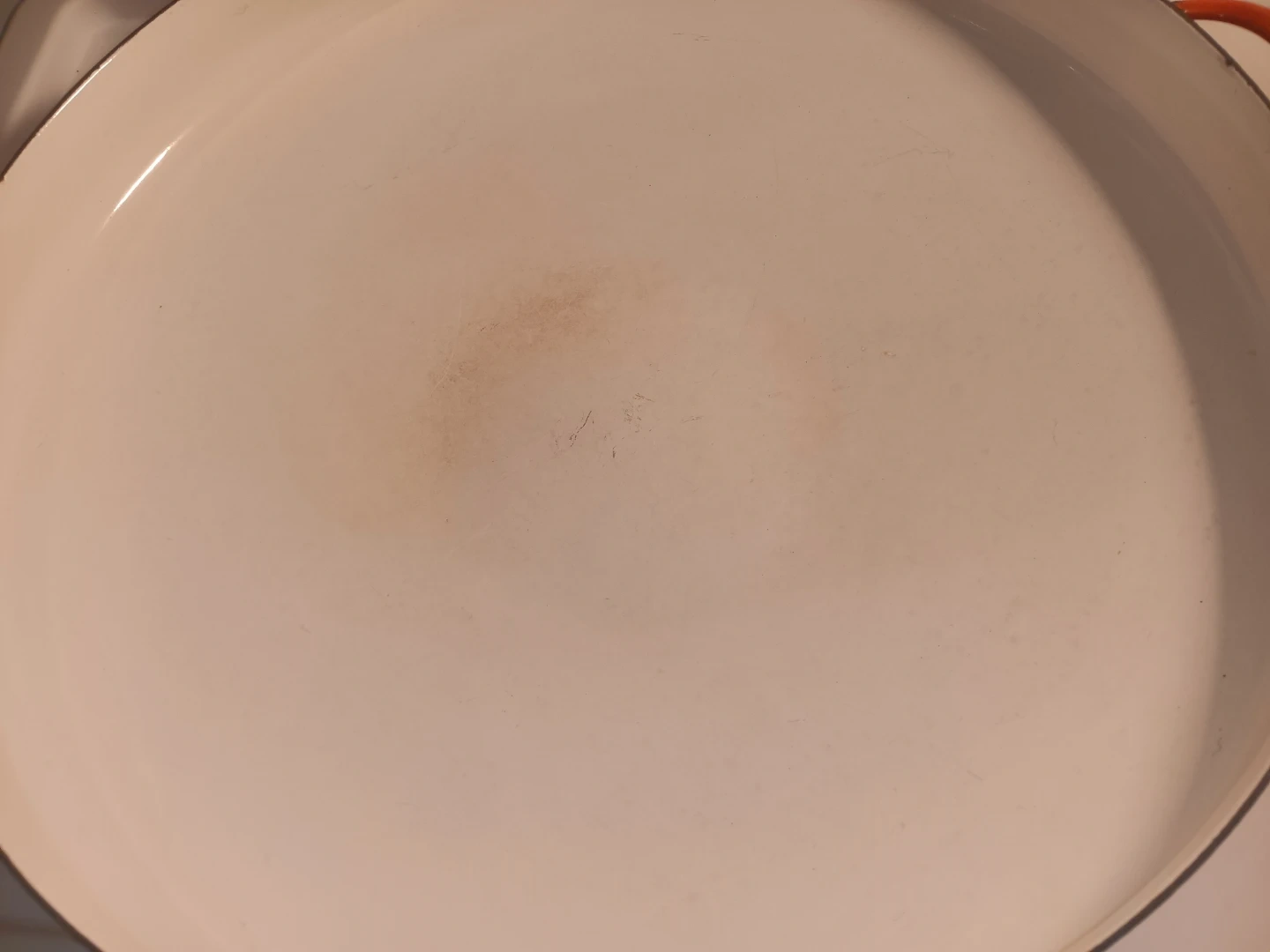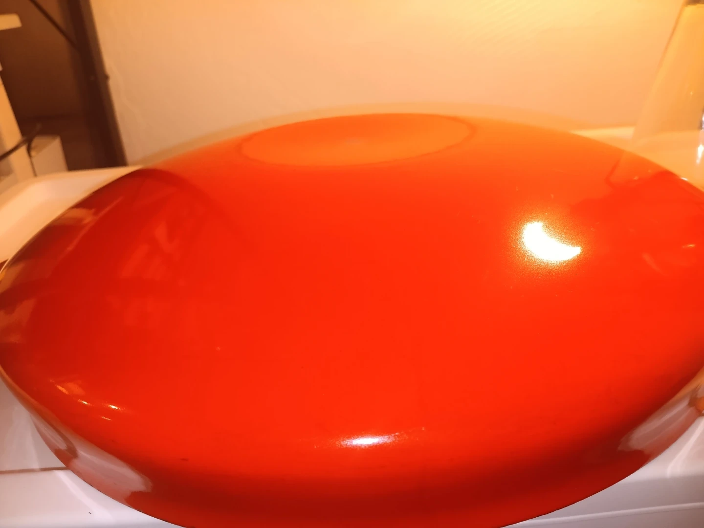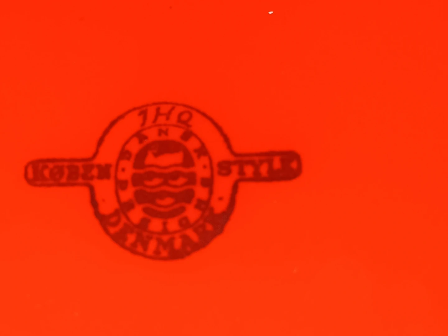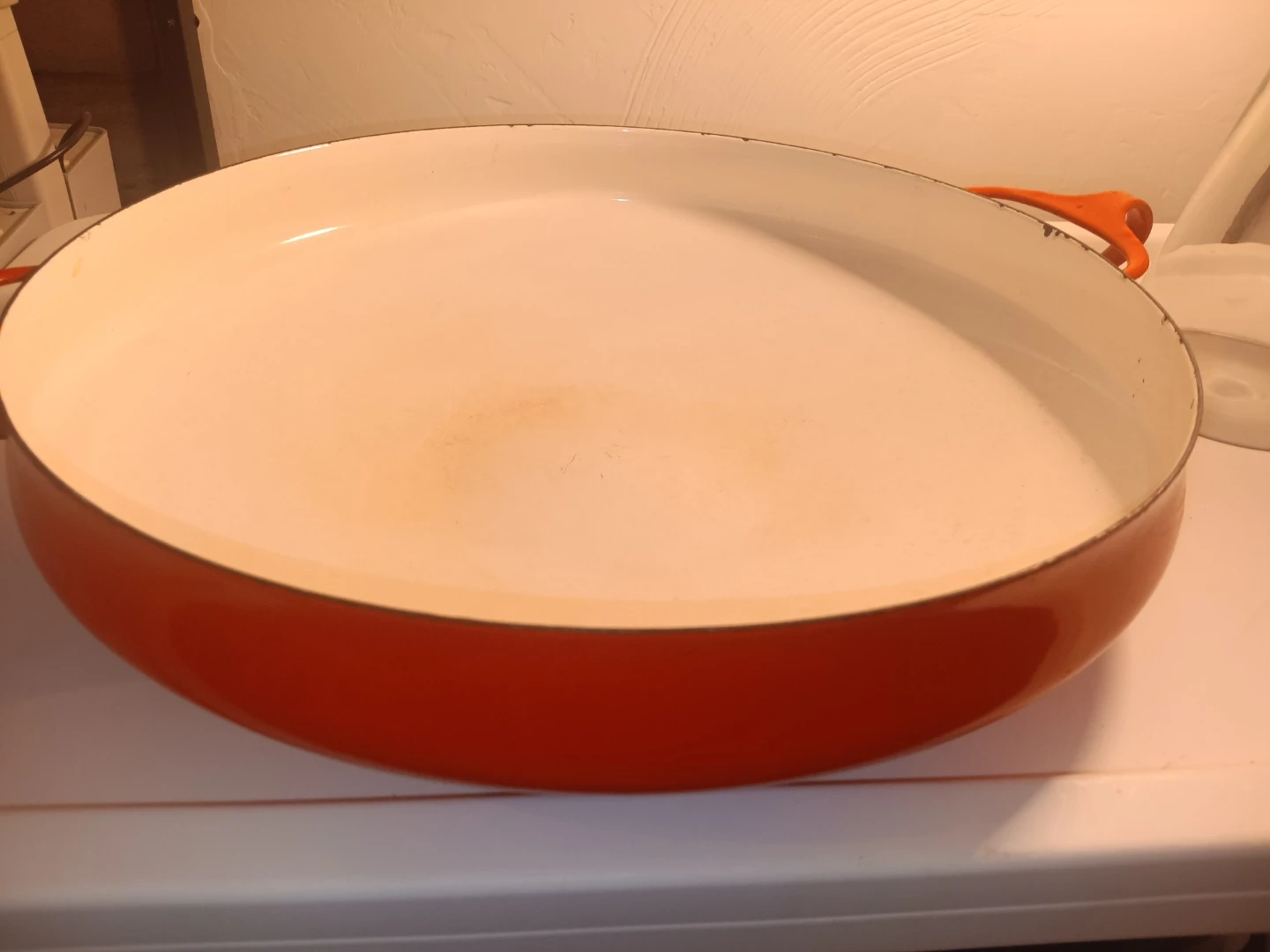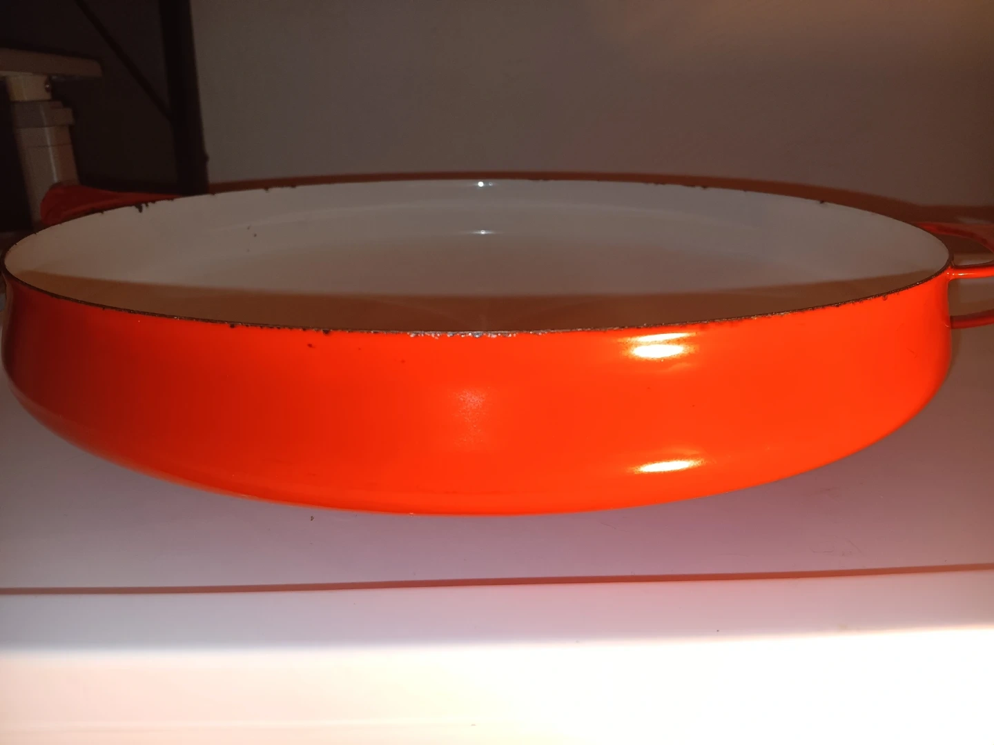 This is a vintage Kobenstyle enameled cast iron pot. It's bright orange with a white interior. It's a classic piece from Denmark.