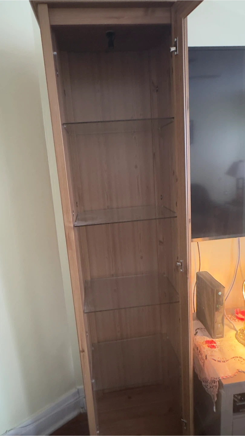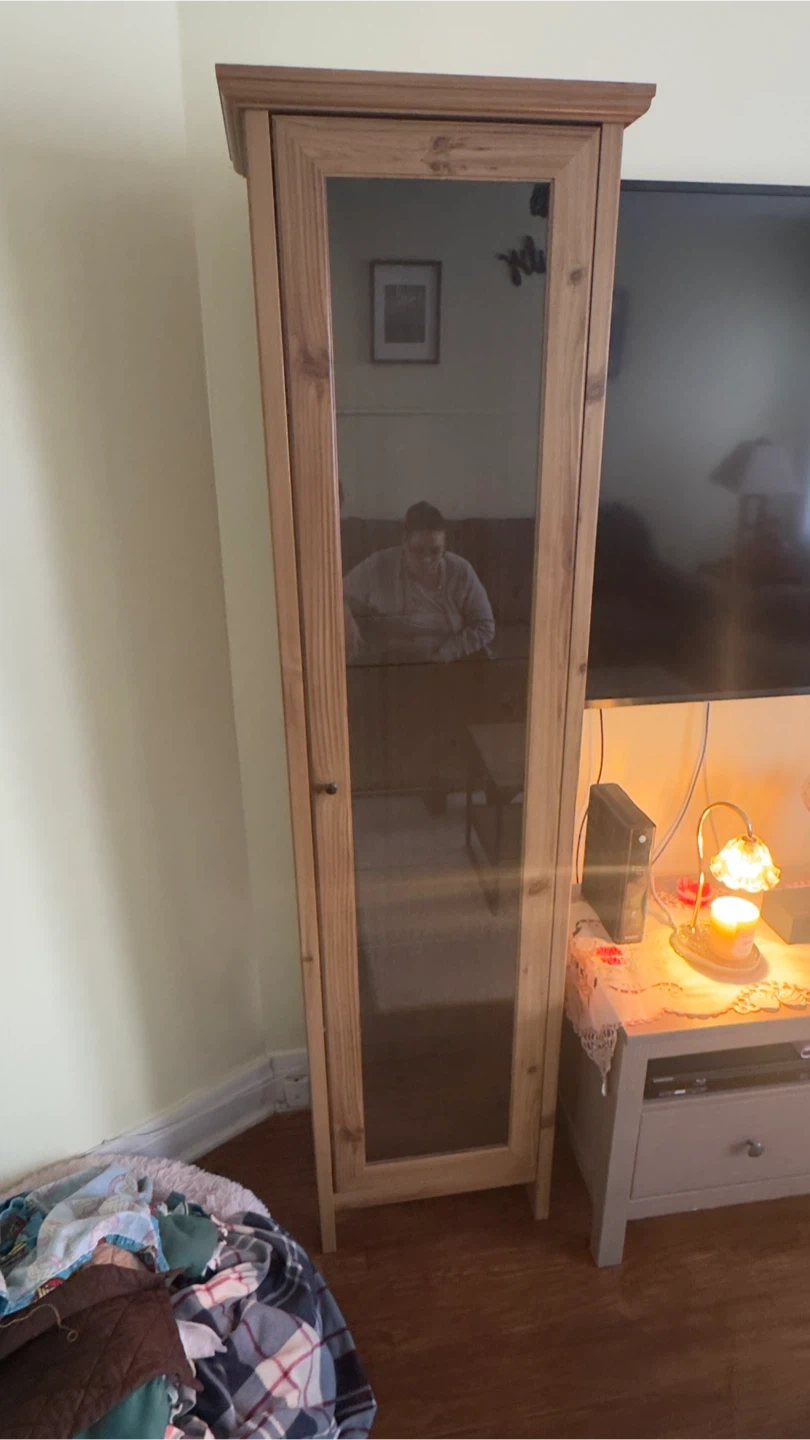 Selling a wooden display cabinet with glass doors. It's perfect for displaying collectibles or storing items. Cabinet has 5 glass shelves and a light at the top the works and lights up the inside. Cabinet is in great condition.
