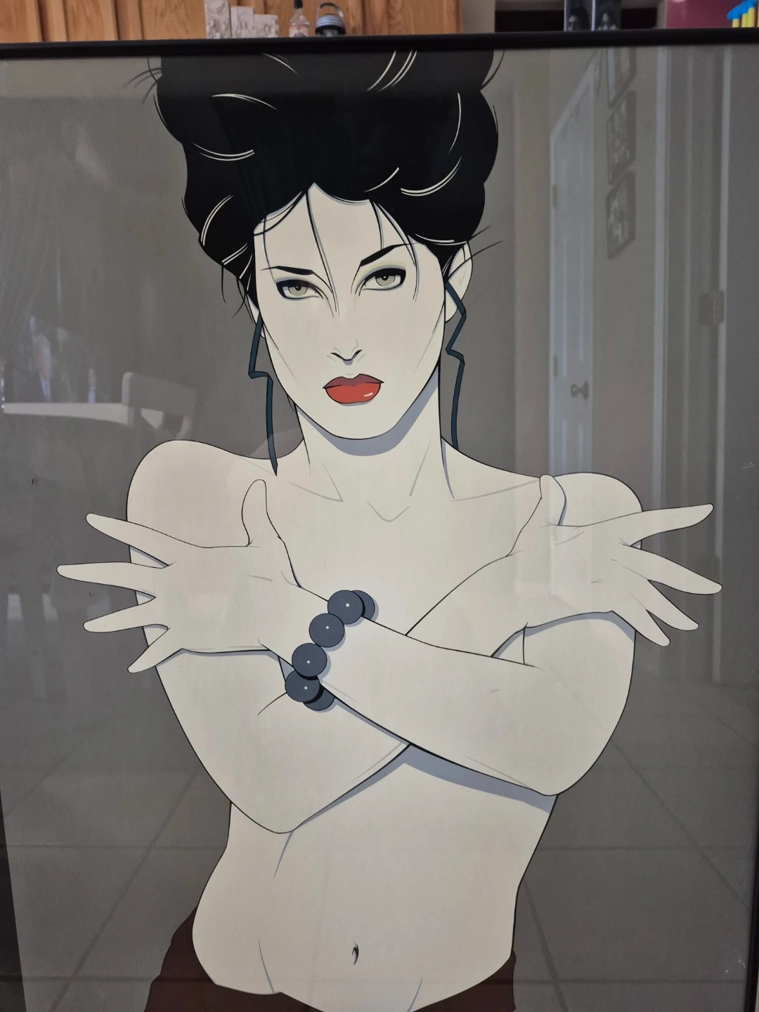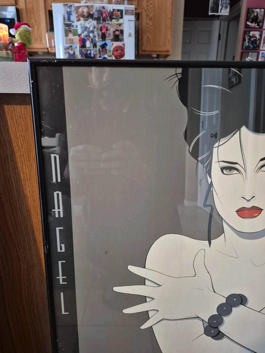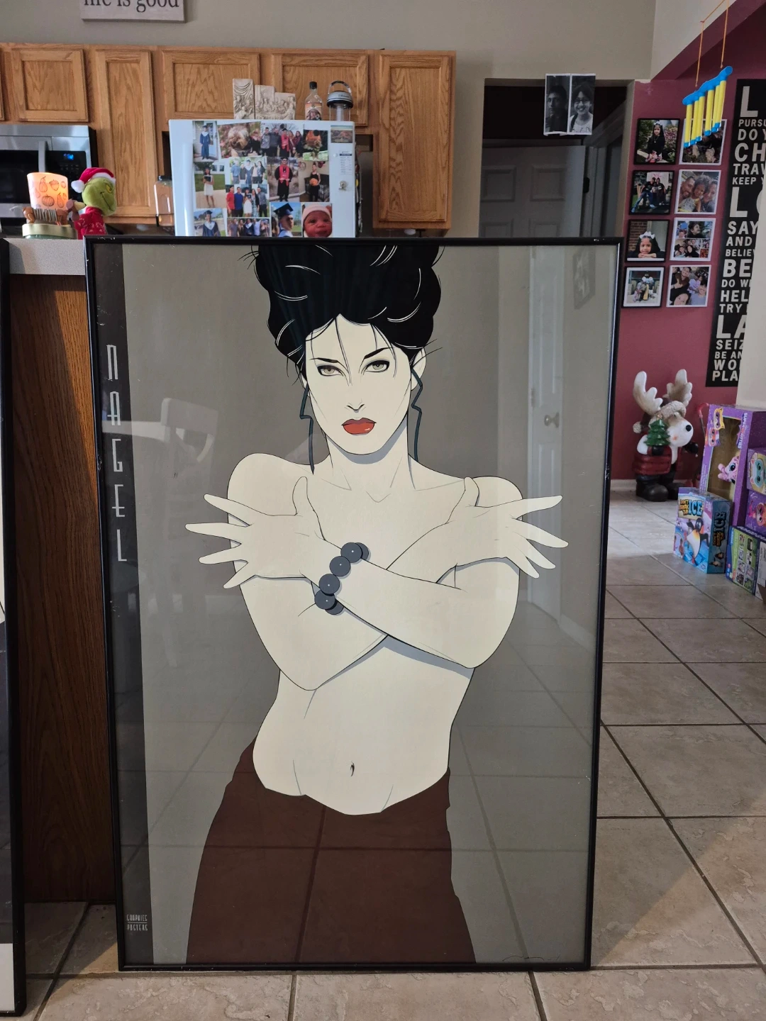 Selling a framed Nage Crossed Arml art print. It features the artist's signature style. The frame and print both have a few minor scratches. Look at pictures